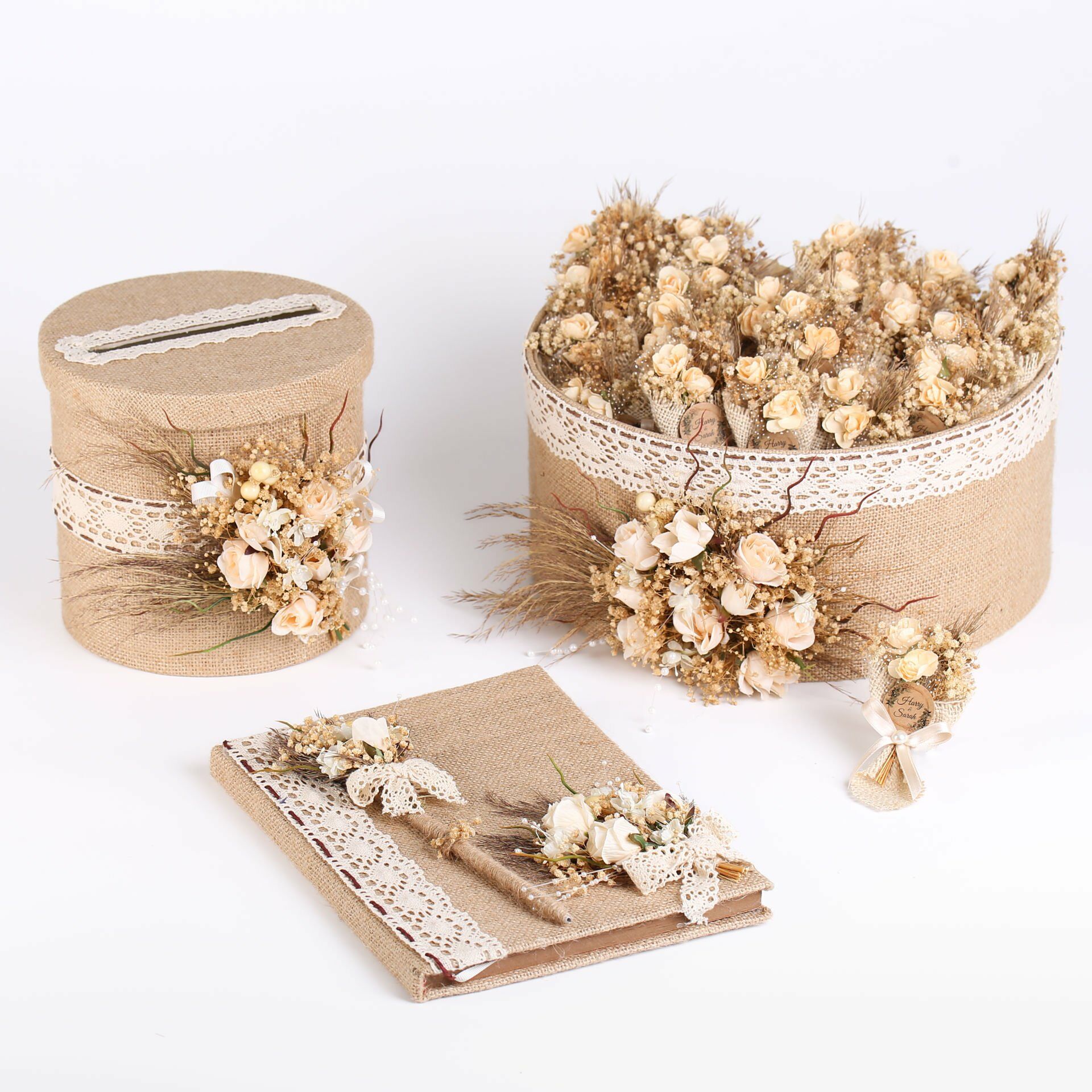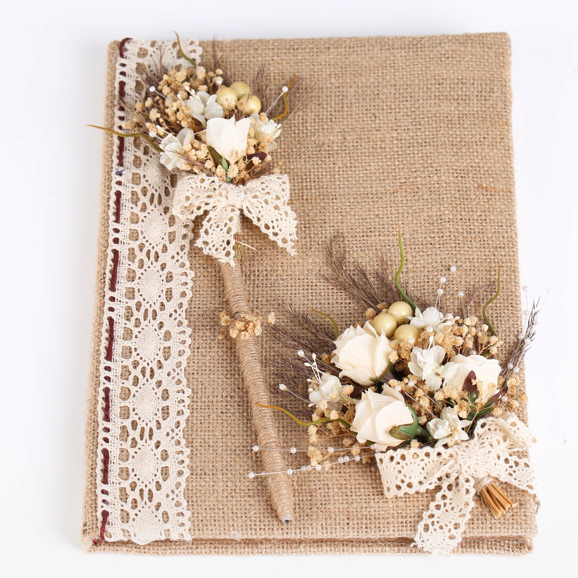 Kraft yapraklı, jüt kaplama anı defteri; koton dantel ve krem mini güllerle süslenmiş zarif tasarımıyla özel günlerinizde sevdiklerinizden güzel dilekler ve hatıralar biriktirmenizi sağlar. Uyumlu kalemiyle birlikte şık bir set olarak hazırlanmıştır. Söz, nişan, düğün, kına ve özel davetlerde tercih edilebilir.