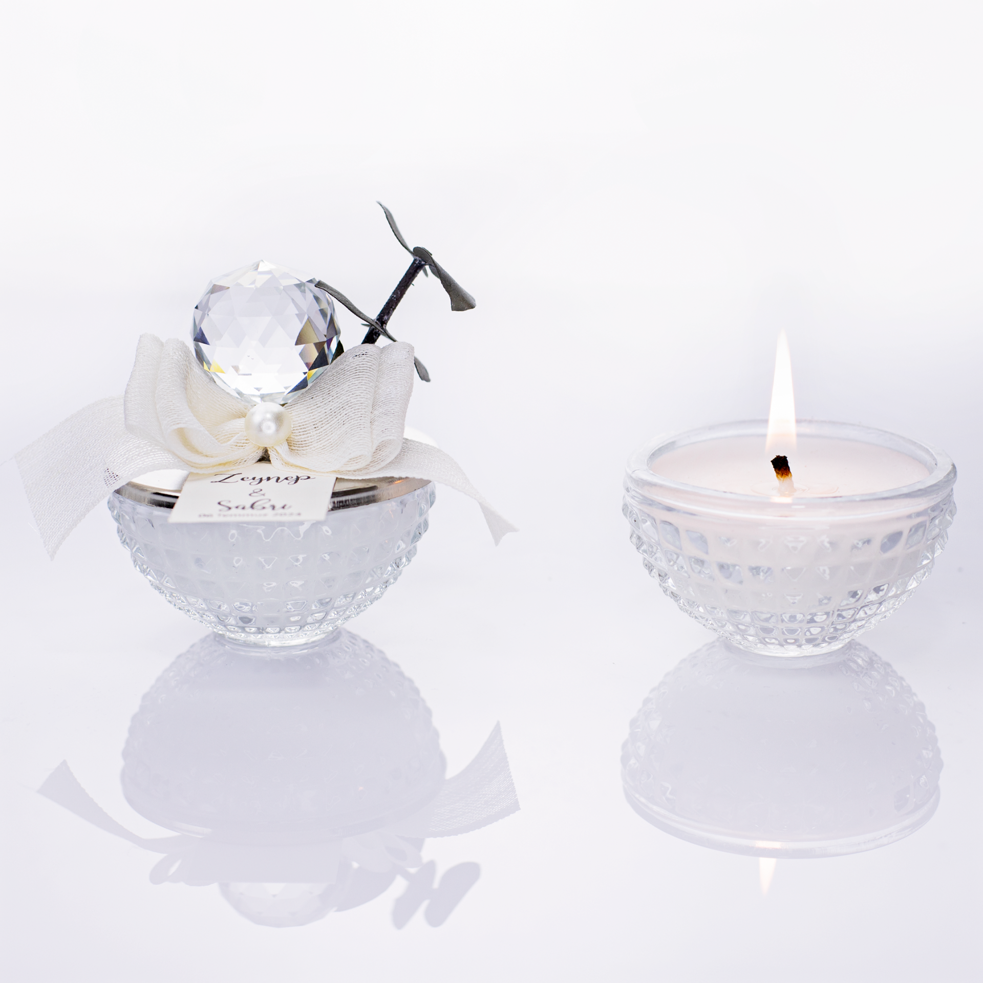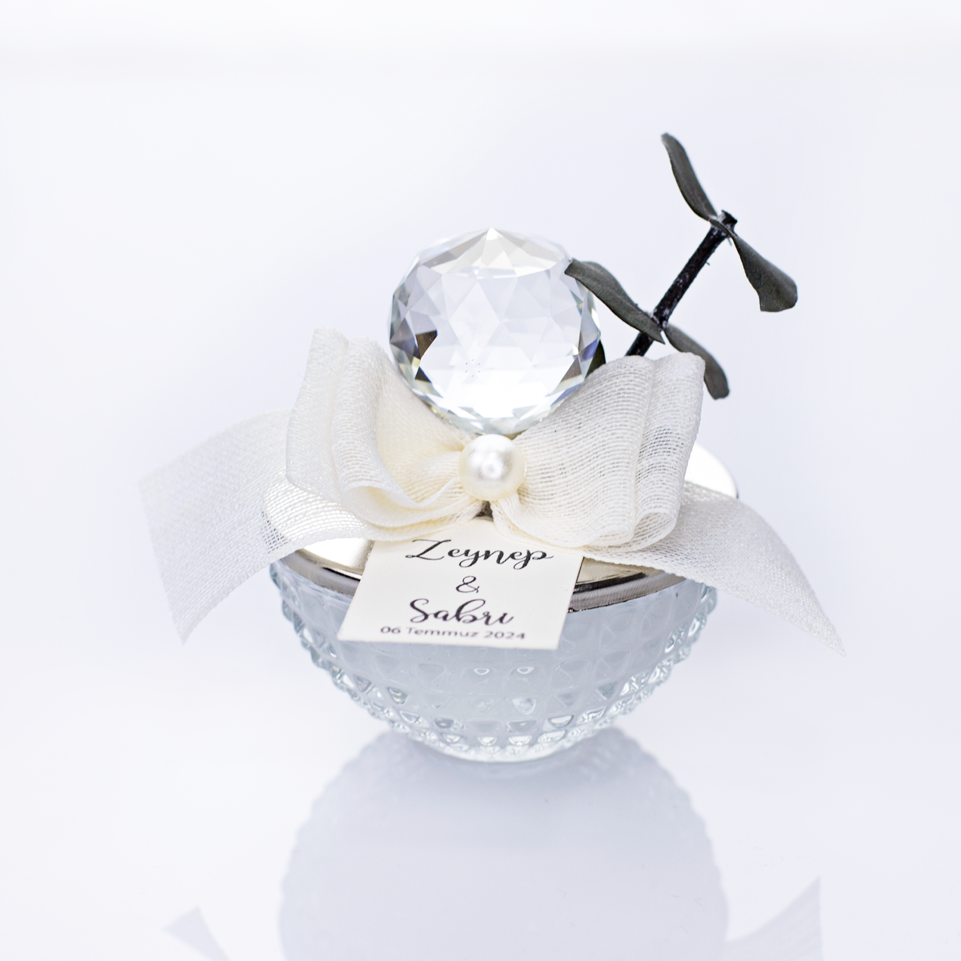 Baklava desenli cam tasarımı, keten kurdele ve inci süsleme detayı ile romantik ve şık konseptlere uyum sağlar. Okaliptus yapraklı süslemesi sayesinde doğal ve zarif bir görünüm sunar. Mum olarak kullanılabildiği gibi şekerlik veya drajelik olarak da değerlendirilebilir. Akrilik ya da kristal cam tepelik seçeneği ile organizasyon konseptine göre tercih yapılabilir.