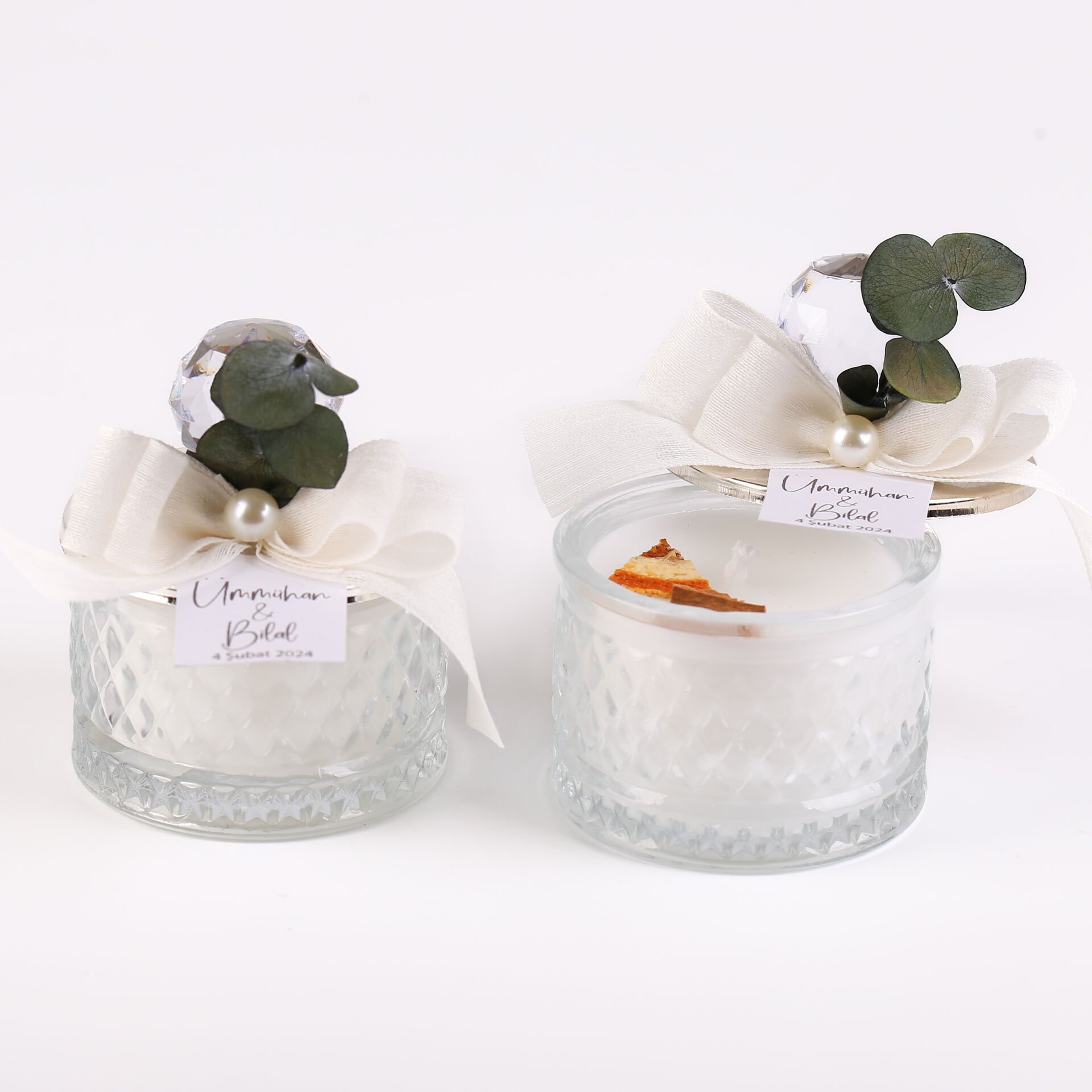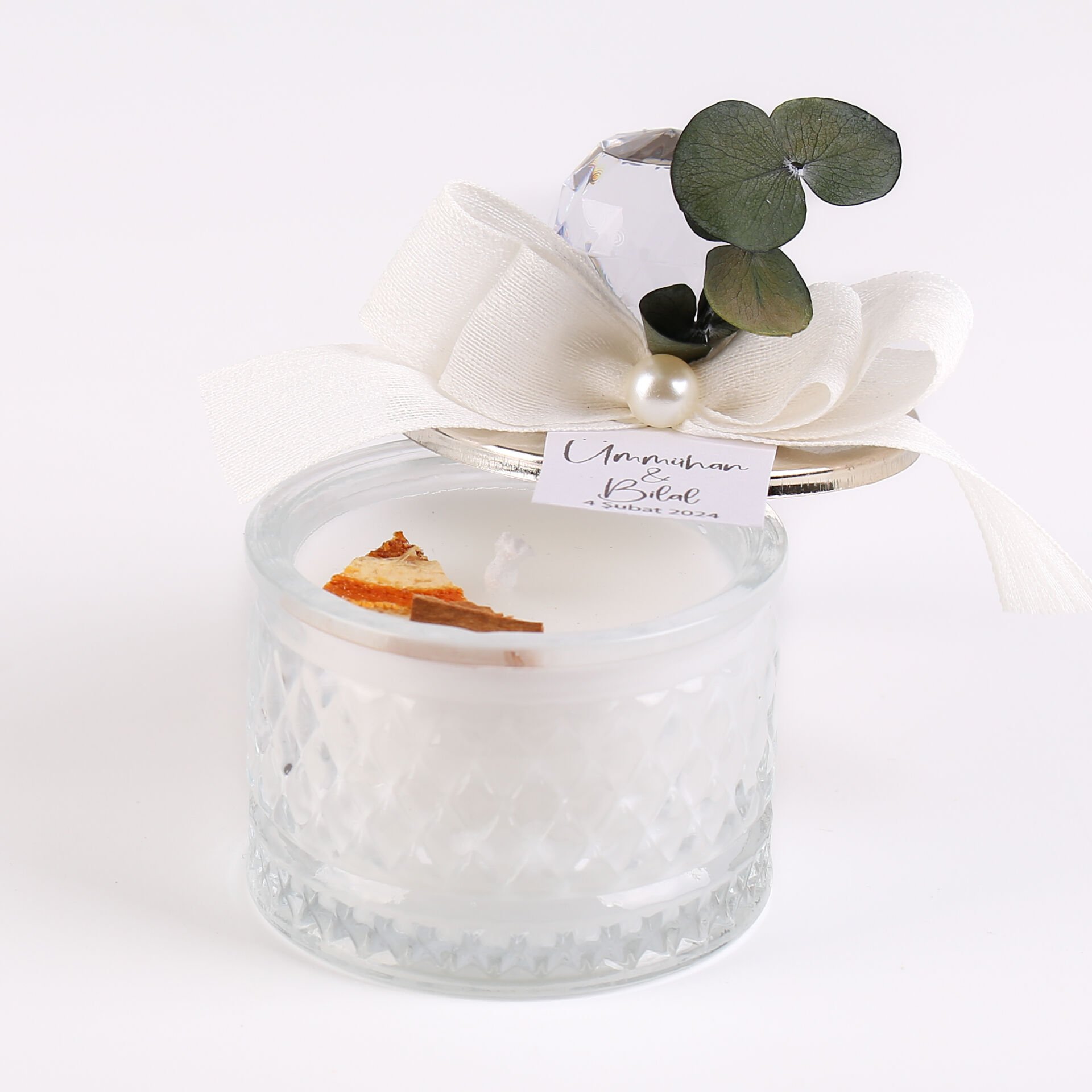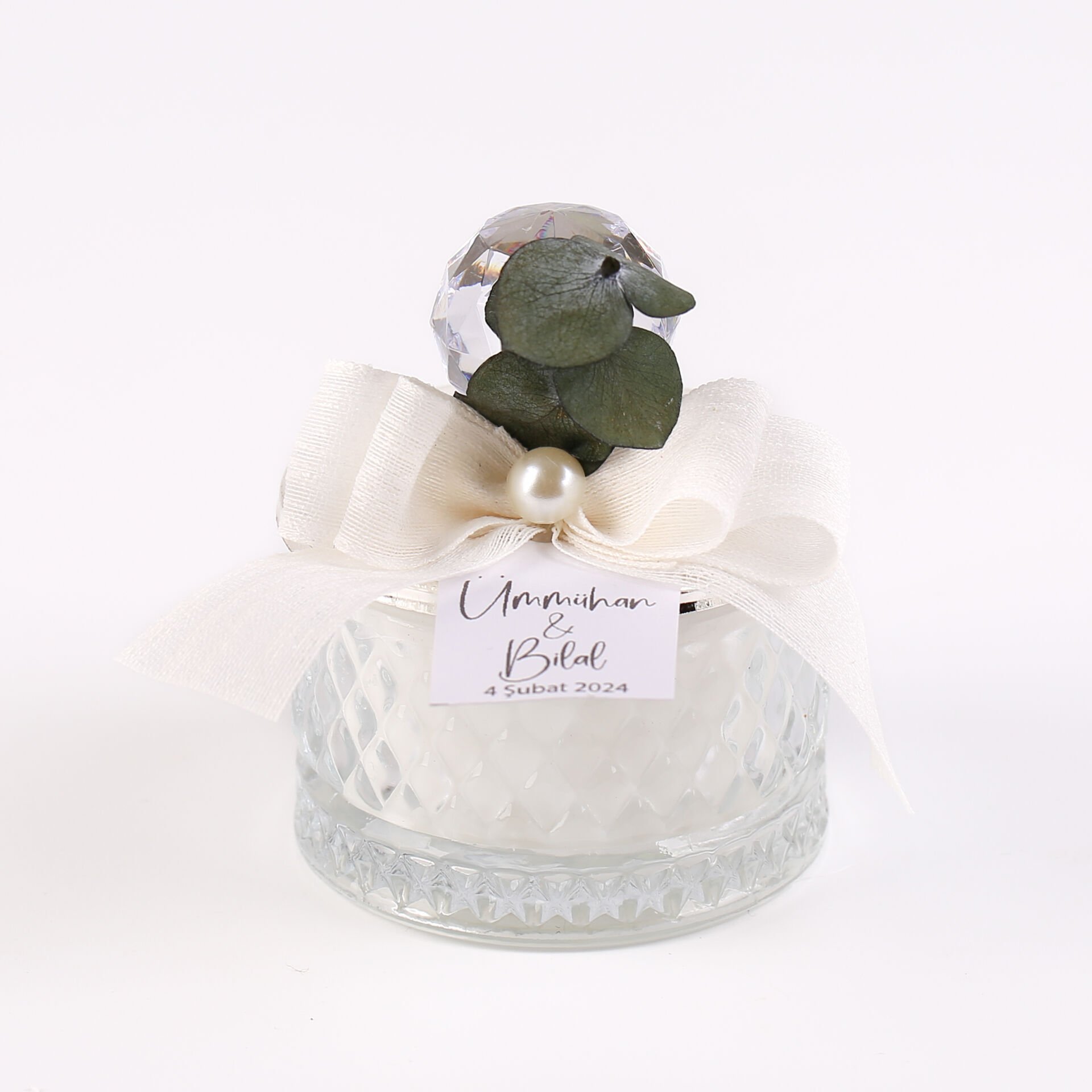 İnci ve okaliptus süslemeli baklava desenli cam mum
