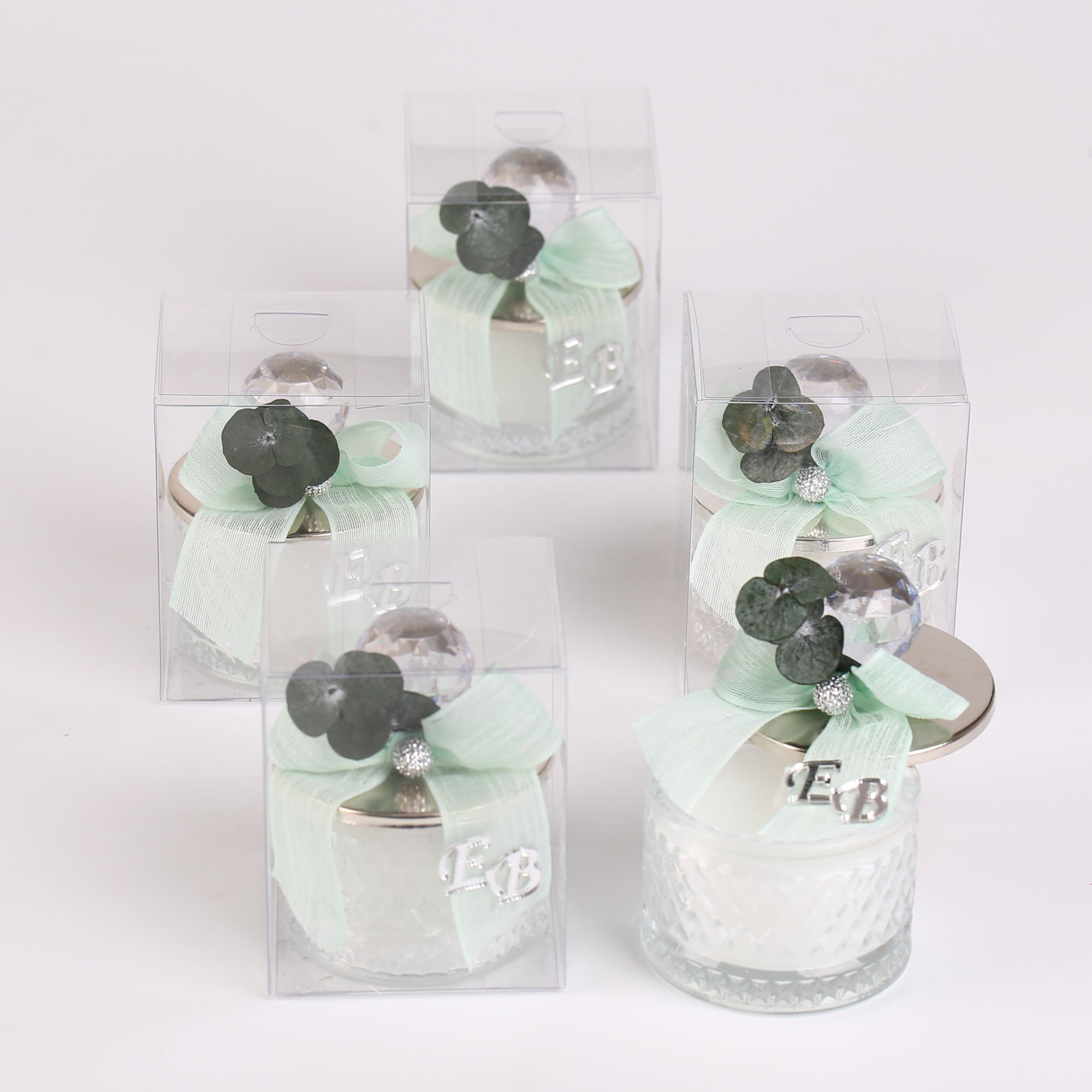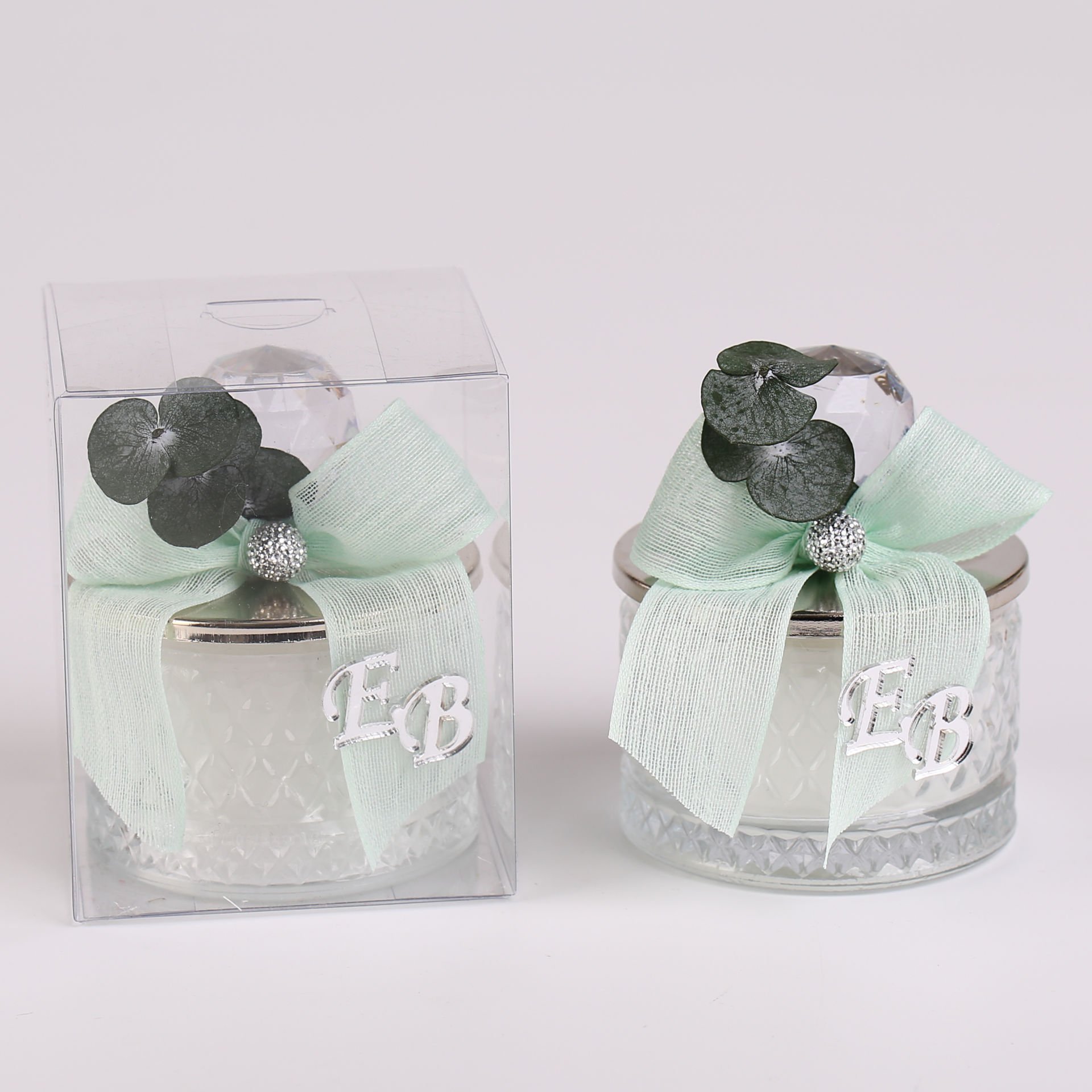 Baklava desenli cam şekerlik formunda hazırlanan mum; su yeşili kurdele detayı, akrilik tepe aksesuarı ve okaliptus süslemeleriyle zarif bir hediyelik alternatifi sunar. Şık asetat kutu sunumu sayesinde özel günlerinizde hem dekoratif hem de anlamlı bir hatıra olarak tercih edilebilir. Söz, nişan, nikah, düğün, kına, mevlit ve davet organizasyonları için uygundur.