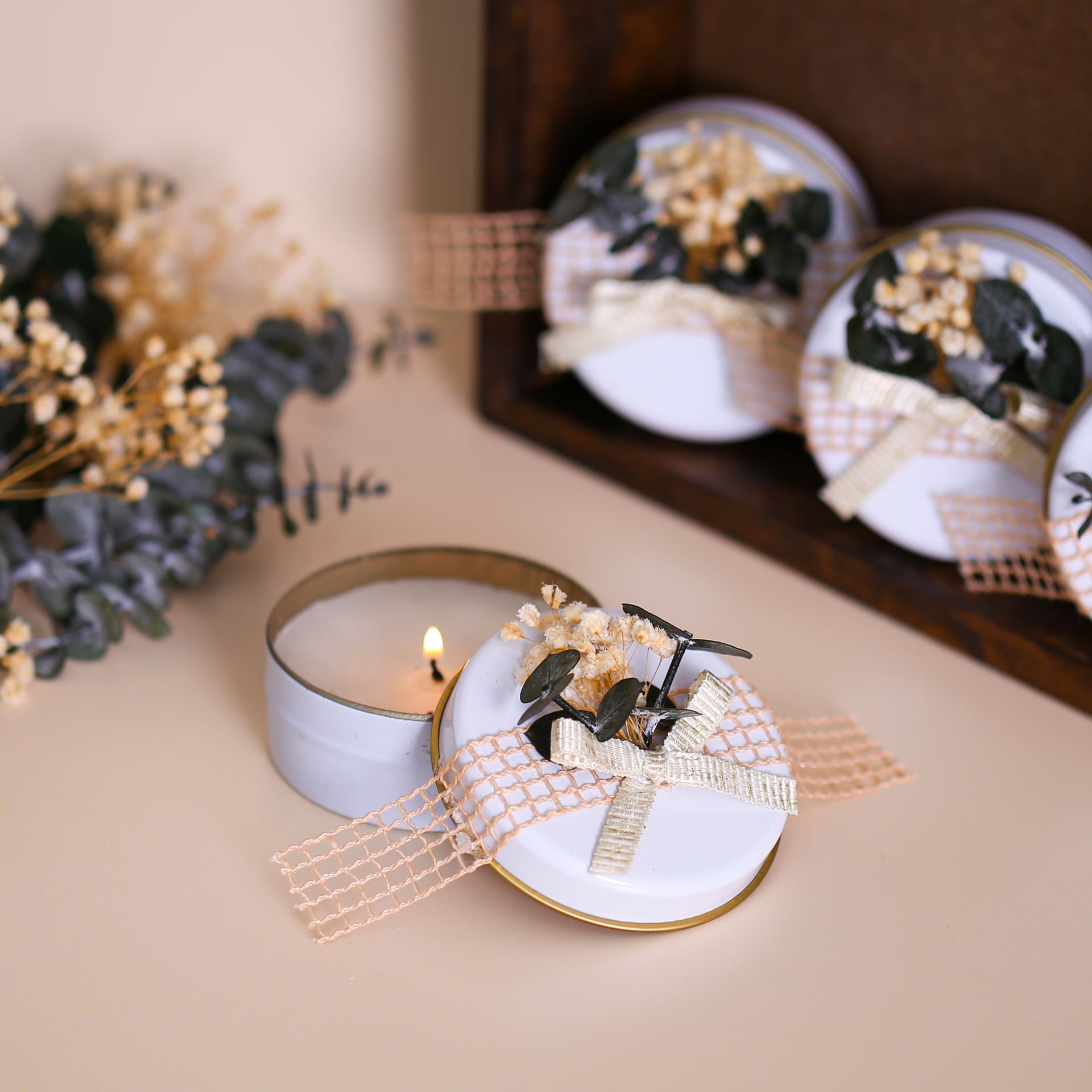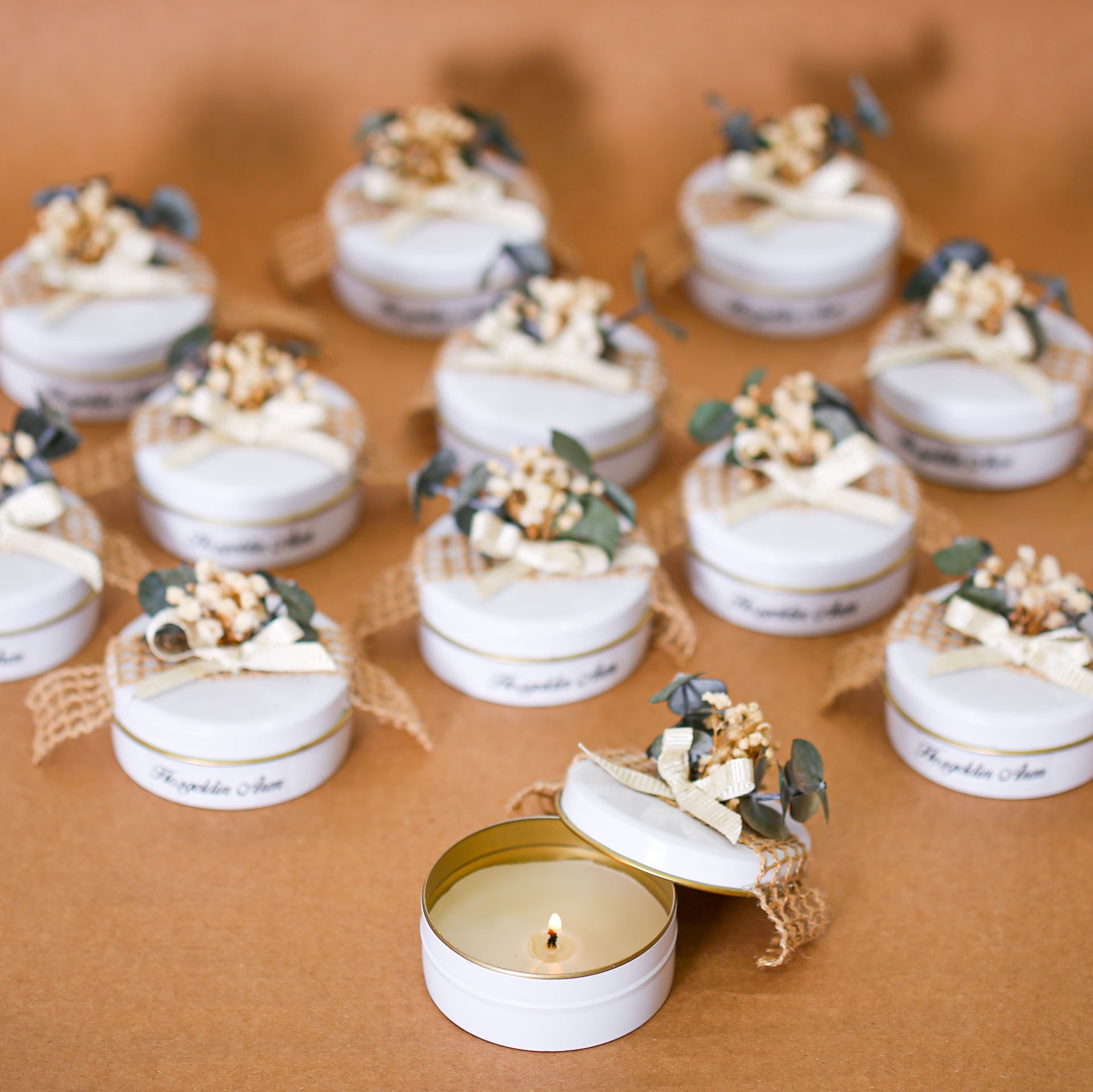 Beyaz metal kutuda dantel kurdeleli mum, zarif tasarımı ve romantik detayları ile özel günlerinizde şık bir dekoratif tamamlayıcı ve anlamlı bir hediyelik olarak tercih edilebilecek estetik bir üründür. Söz, nişan, düğün, nikah, kına gecesi, mevlüt, baby shower, doğum günü ve özel davet organizasyonlarında masa süsü veya misafir hediyesi olarak kullanılabilir. Dantel kurdele süslemesi sayesinde konseptinize zarafet katarken, uzun süre saklanabilecek hoş bir hatıra oluşturur. Üzerine eklenebilen etiket ile kişiselleştirilebilir ve organizasyonunuza özel hale getirilebilir.