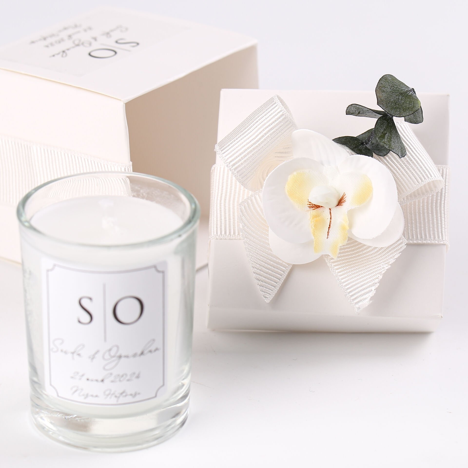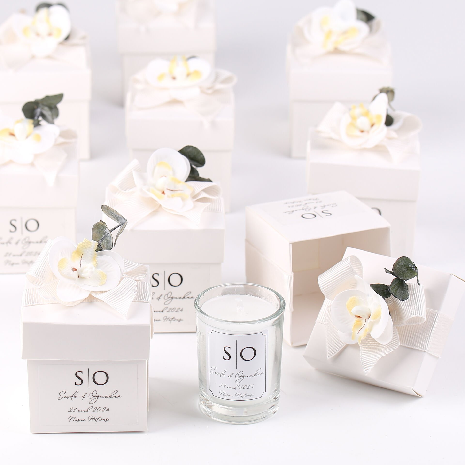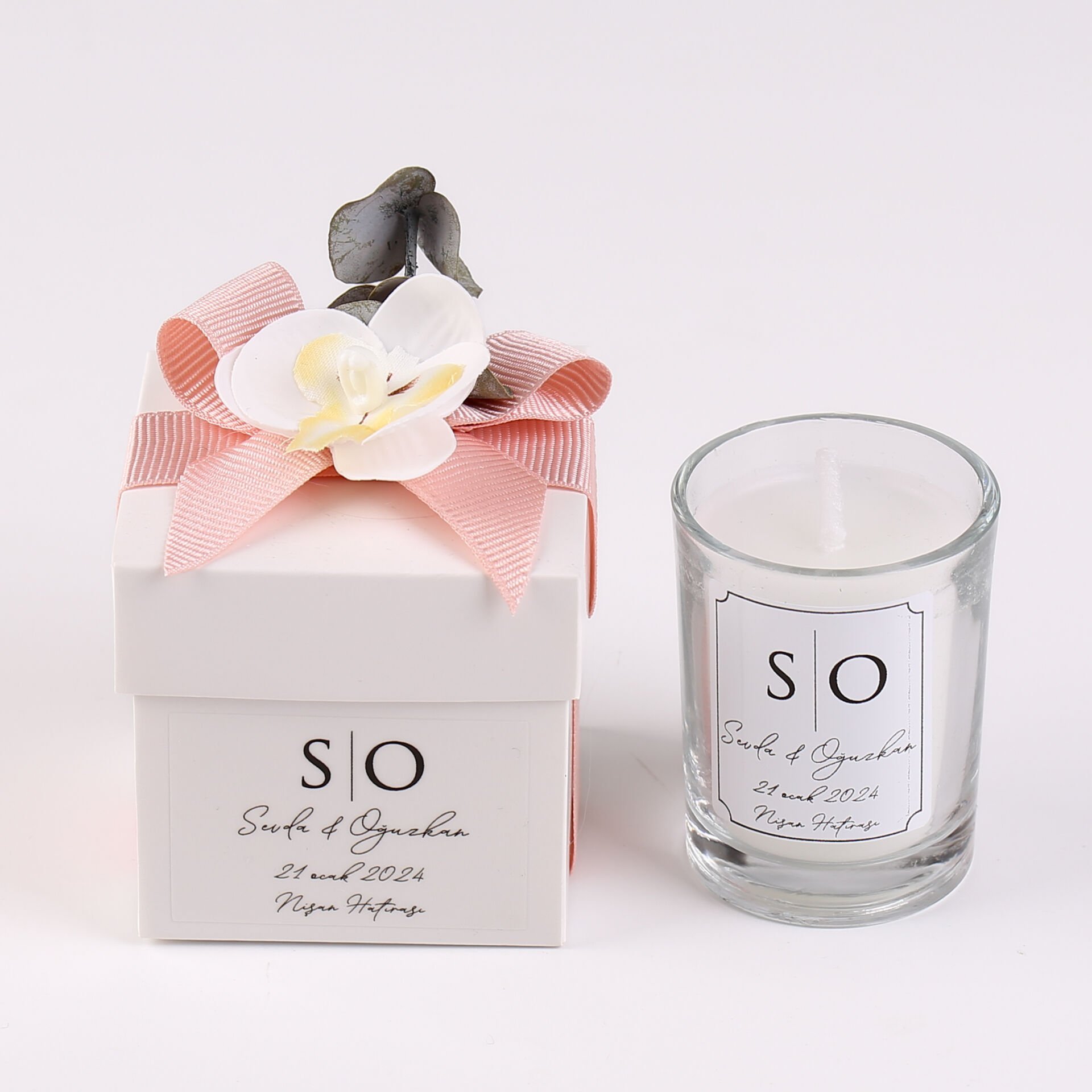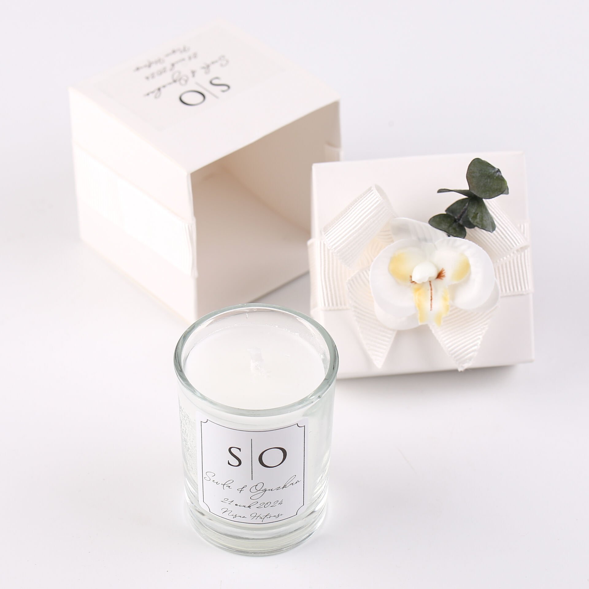 Mini orkide ve okaliptus dalı süslemeleriyle hazırlanan cam bardak mum; zarif ve doğal görünümüyle söz, nişan, düğün, kına gecesi, nikah, mevlit, baby shower ve özel gün organizasyonlarında misafirlere sunulabilecek şık bir hediyelik alternatiftir. Kurdele renk seçenekleri sayesinde konseptinize uyum sağlar, beyaz kutu sunumu ile estetik bir görünüm oluşturur ve özel günlerden hatıra olarak saklanabilir.