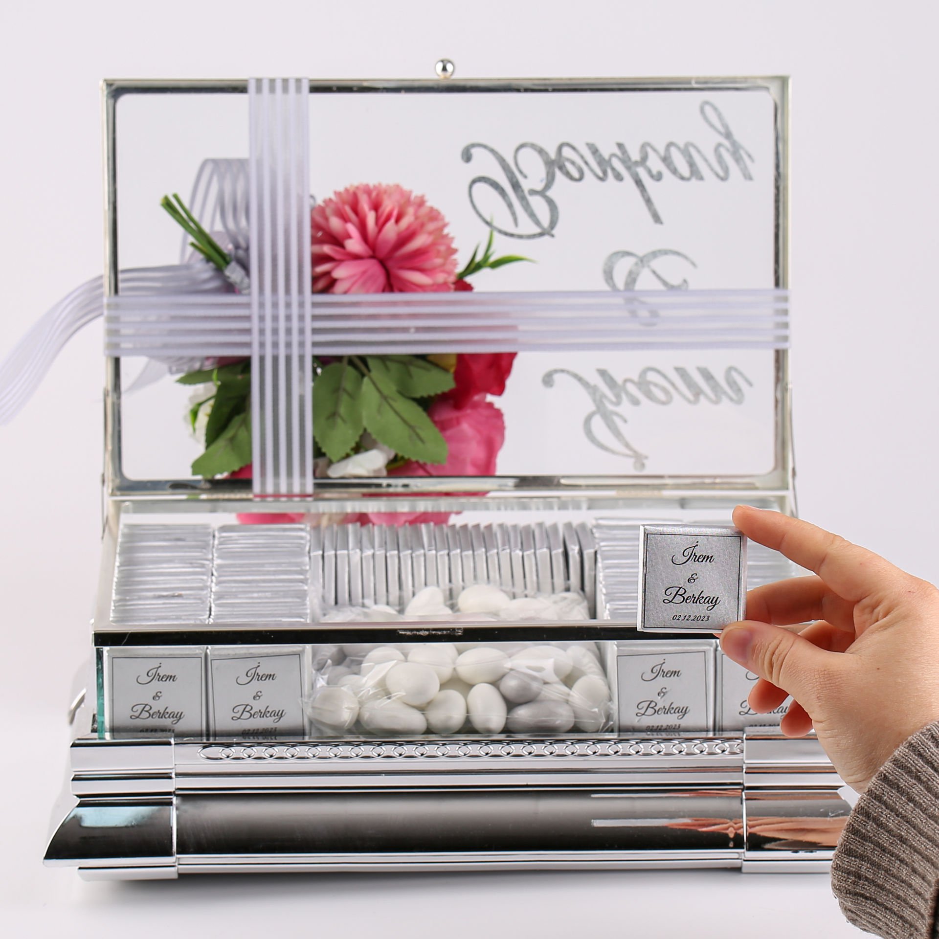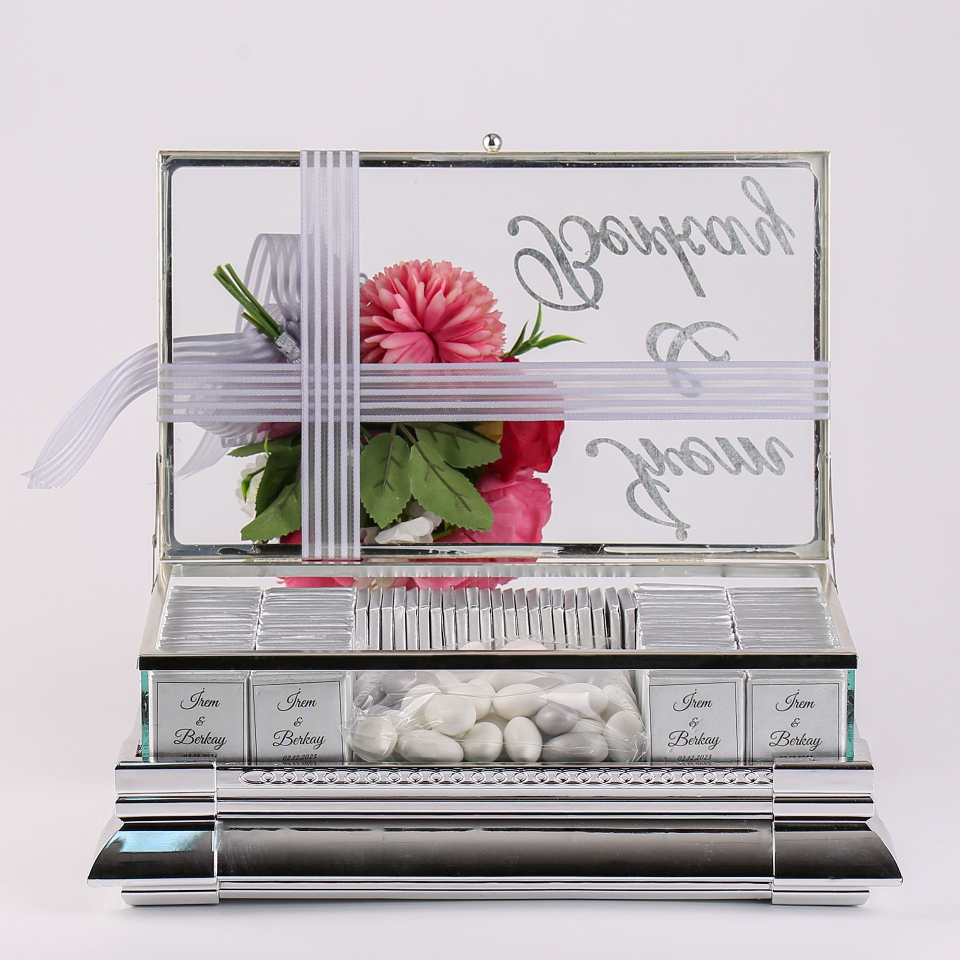 Cam kutu içerisinde hazırlanan çikolata ve draje seti; söz, nişan, isteme, düğün, kına gecesi, nikah ve özel gün organizasyonlarında şık bir ikramlık ve hediye alternatifi olarak tercih edilebilir. Gold veya gümüş detay seçenekleriyle organizasyon konseptine uyum sağlar ve zarif sunumuyla özel anlara estetik bir dokunuş katar.