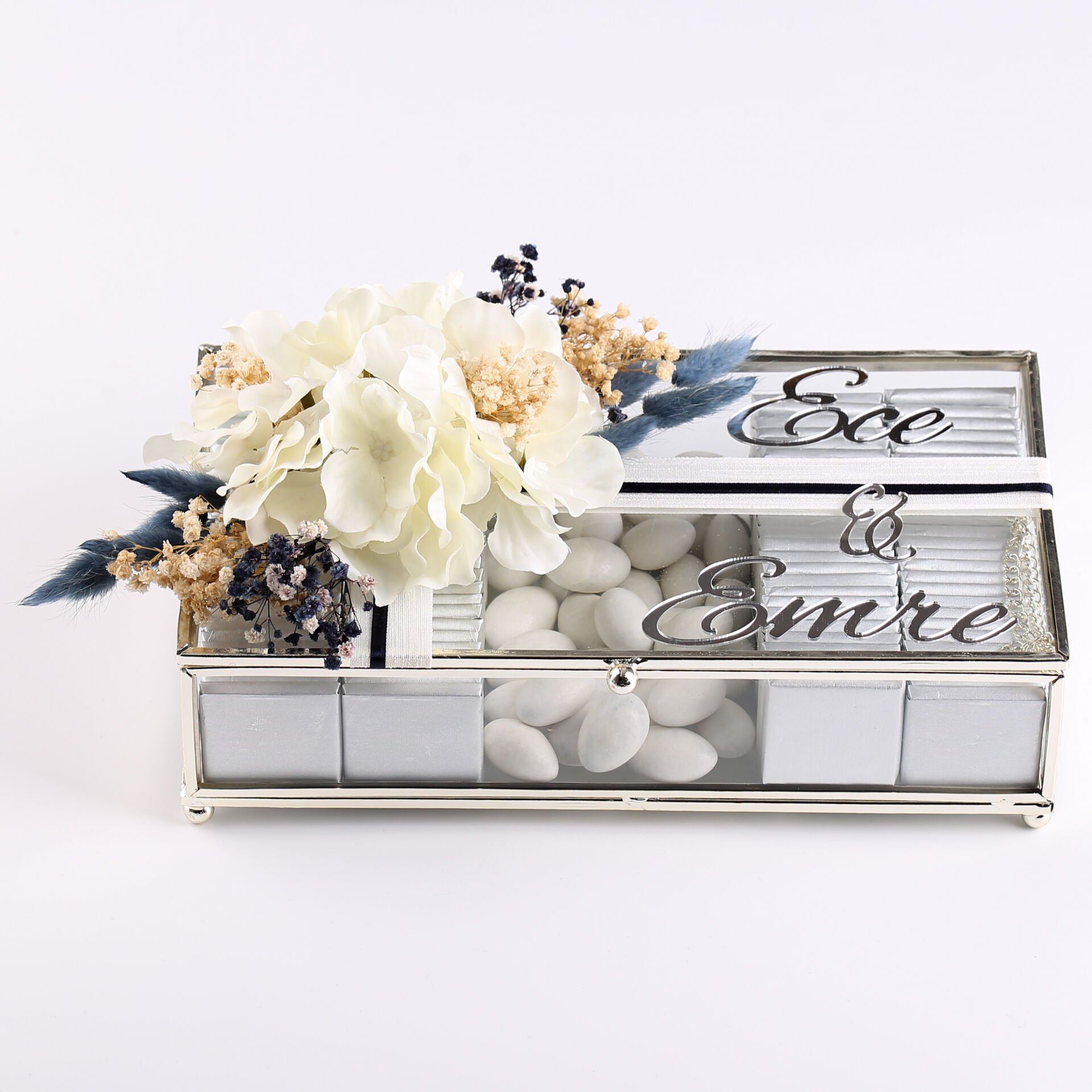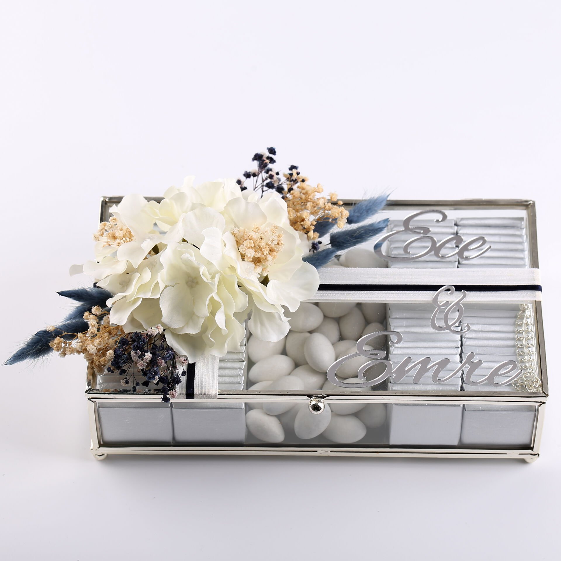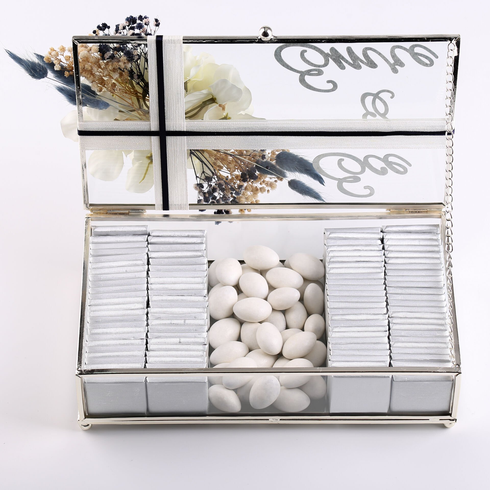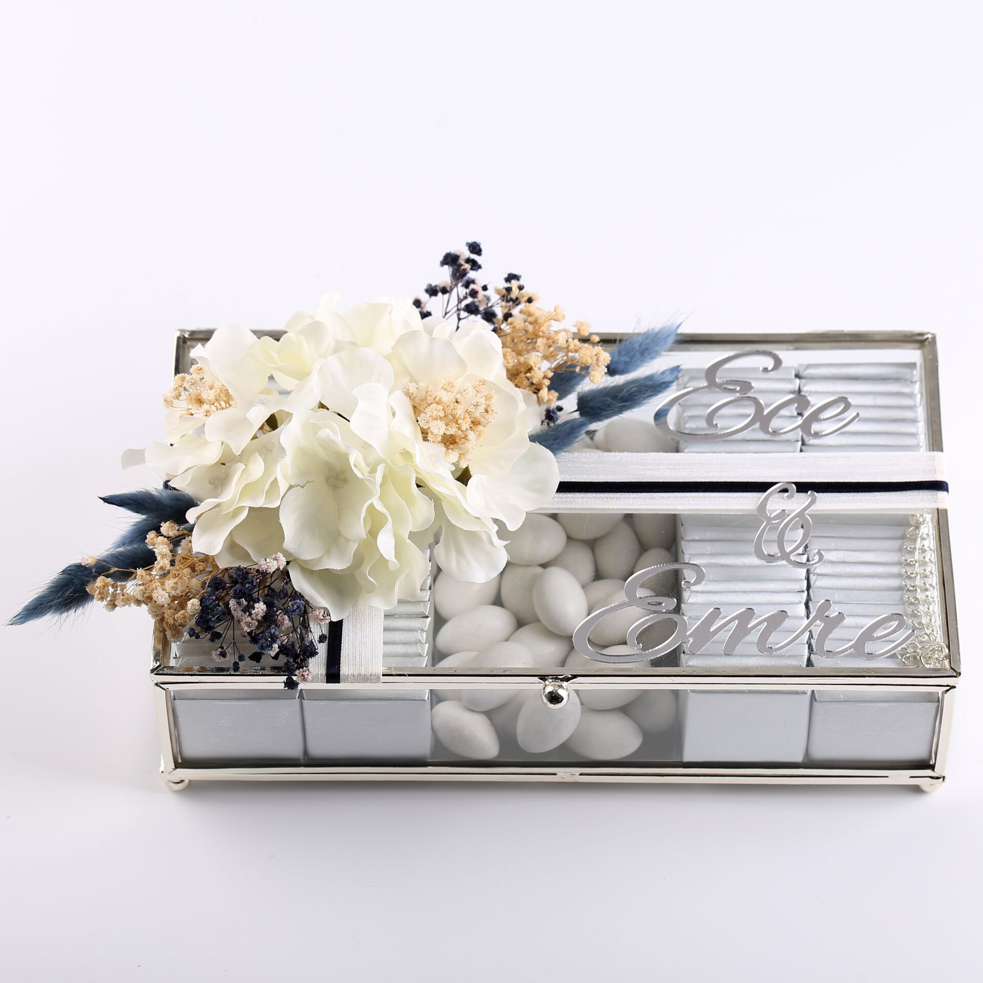 Söz, nişan, düğün ve özel günlerde misafirlere sunulacak şık ve lezzetli bir ikramlık olarak tasarlanmış cam kutuda çikolata ve draje seti, 100 adet madlen çikolata ve 200 gram draje ile doludur. Gümüş detaylı cam kutu içerisinde sunulan bu ikramlık, kişiselleştirilebilir pileksi isimler ile unutulmaz bir hediye alternatifi oluşturur. Estetik görünümleri ve lezzetli içerikleriyle bu set, organizasyonlarınıza zarif bir dokunuş katacaktır.