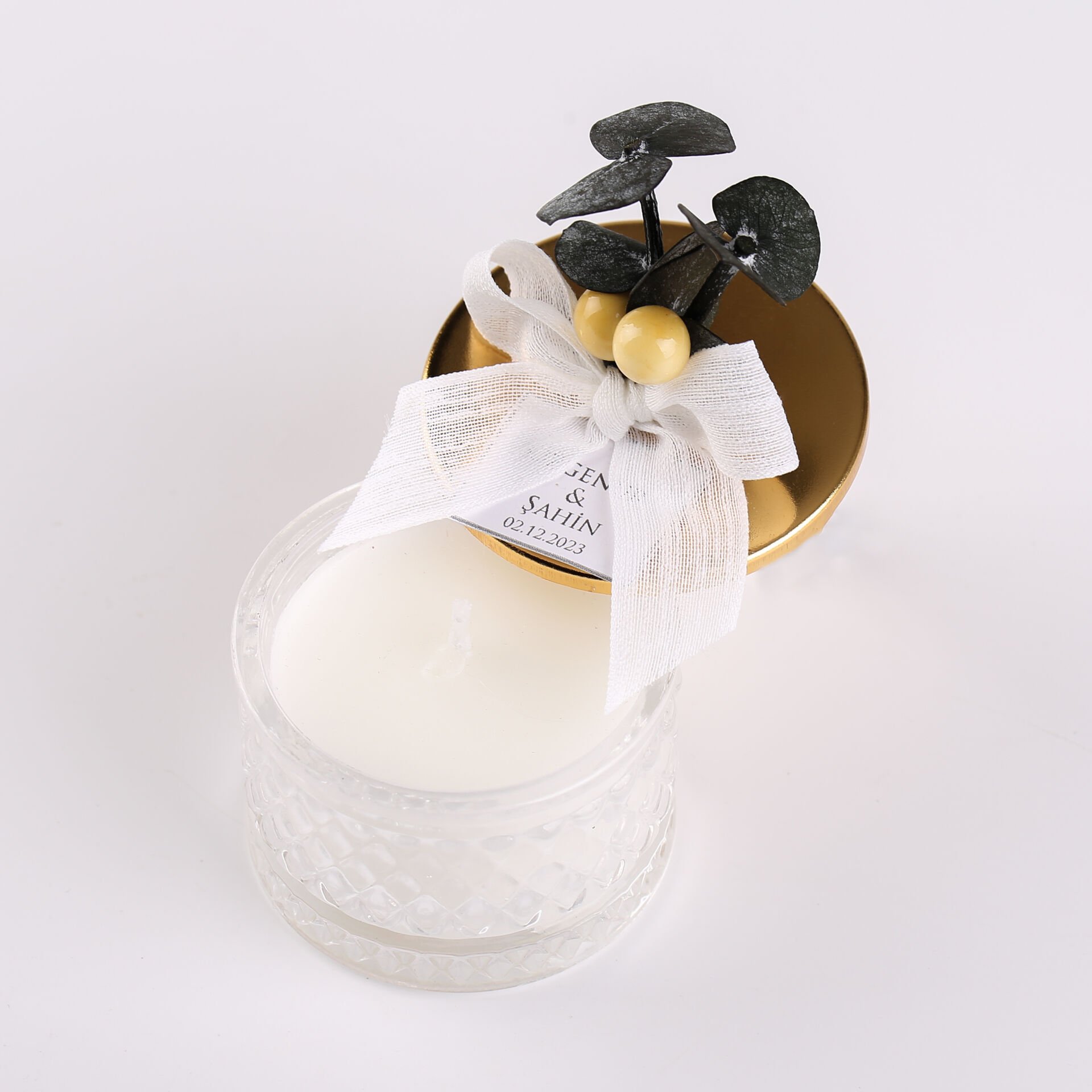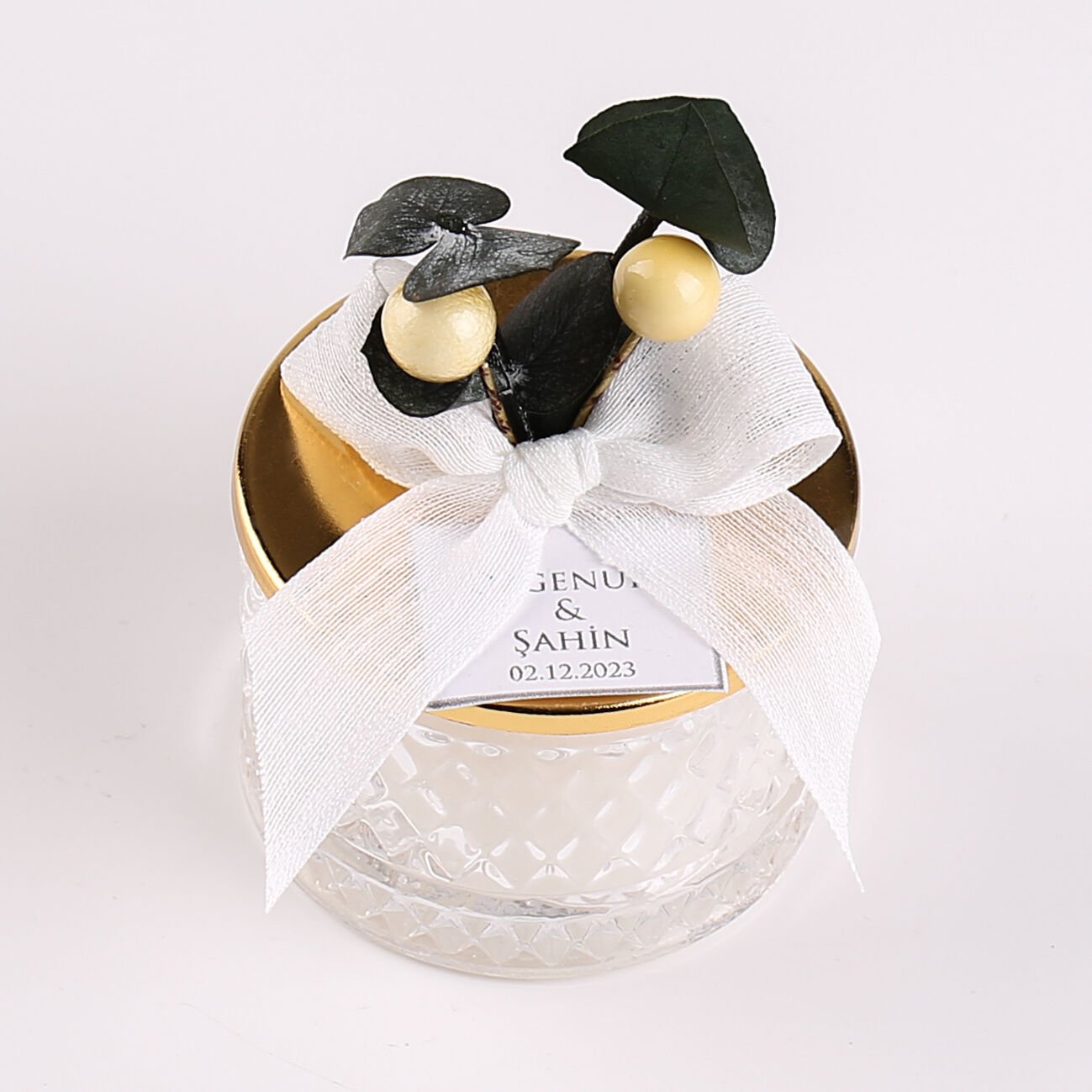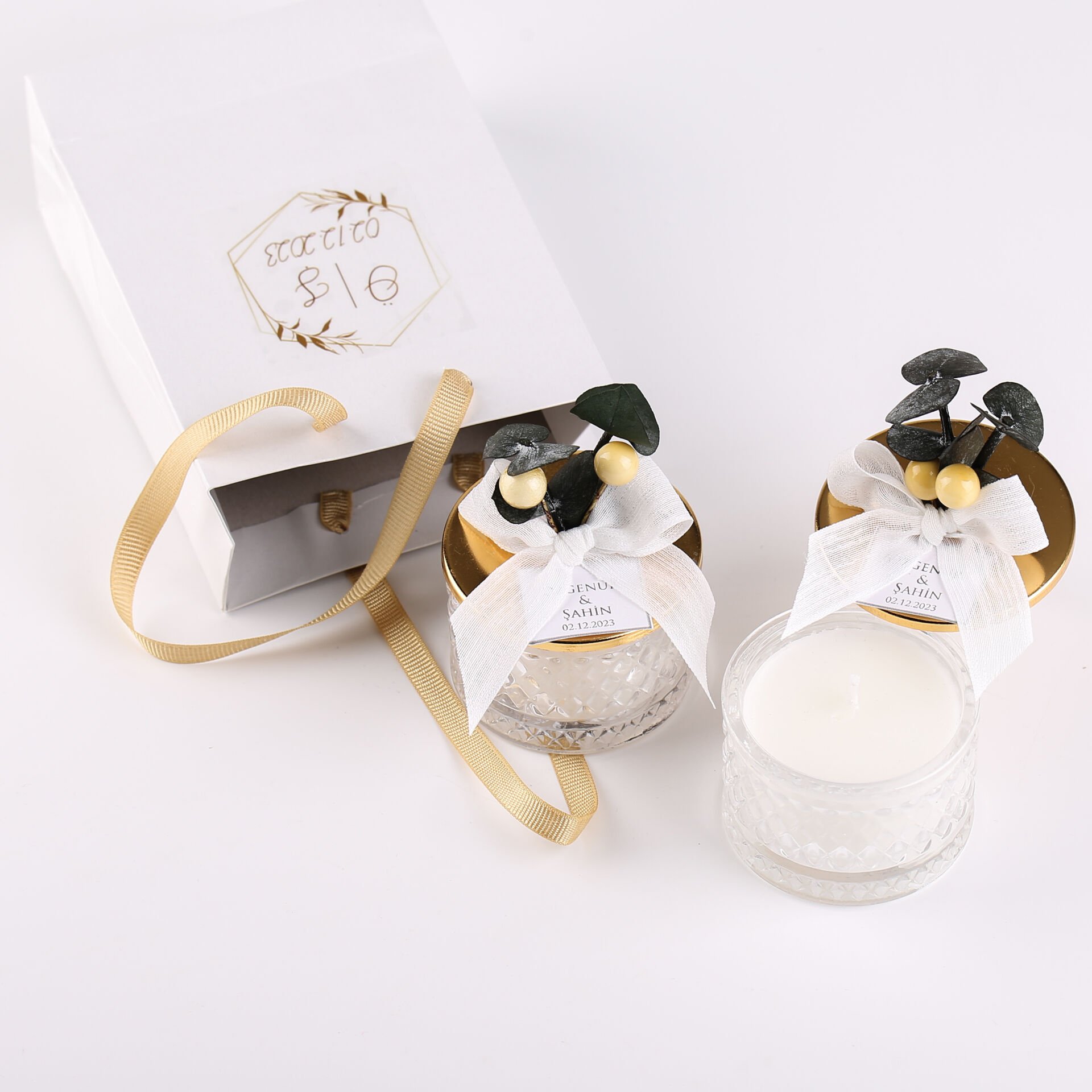 Karton kutuda sunulan kristal mum seti; söz, nişan, düğün, nikah, kına gecesi ve özel gün organizasyonlarında misafirlere verilebilecek zarif ve şık bir hediyelik alternatifidir. Kristal detaylı tasarımı sayesinde hem dekoratif bir hatıra olarak saklanabilir hem de bulunduğu ortama hoş bir ambiyans katar.