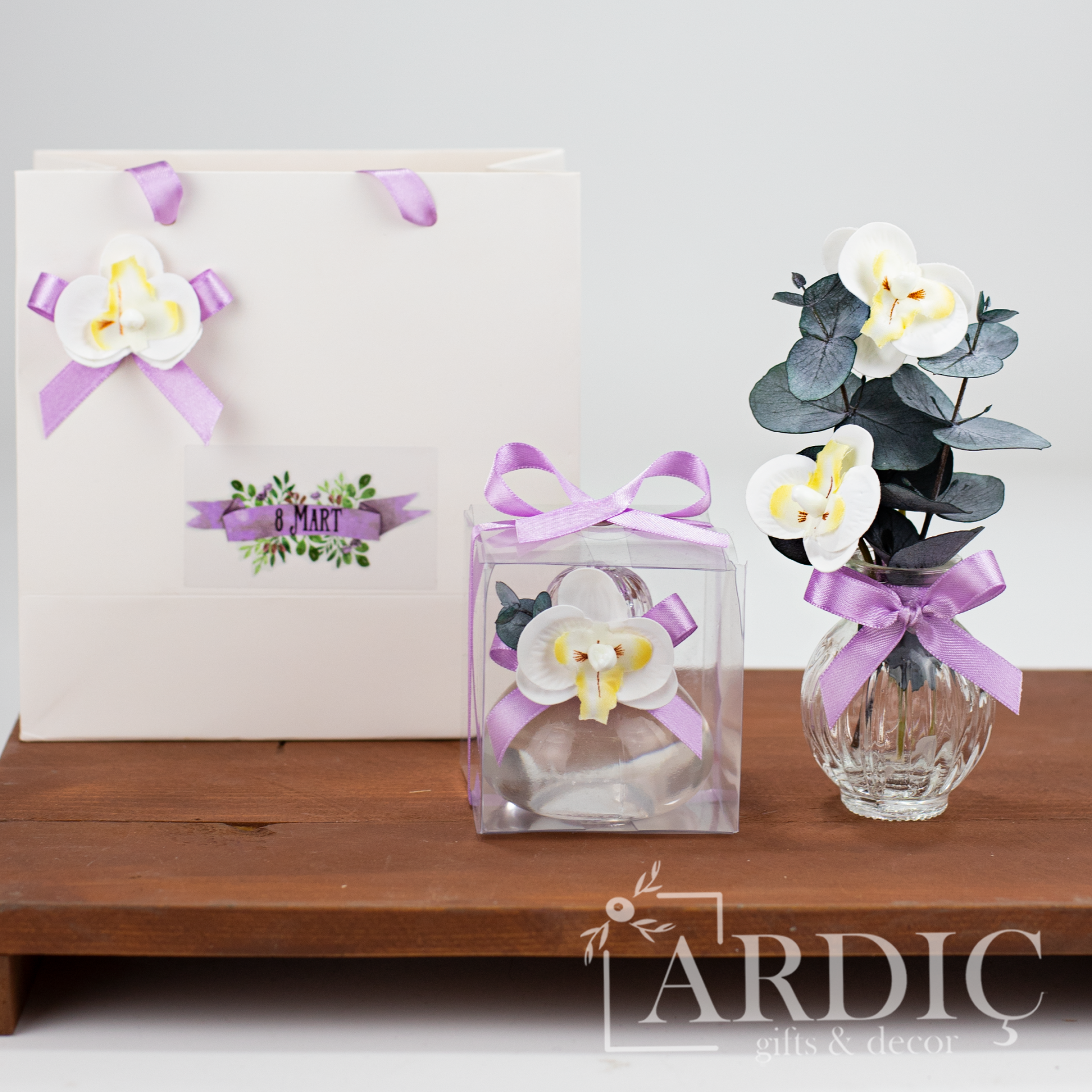 Süslemeli karton taşıma çantası içinde sunulan bu şık hediye seti; dekoratif cam vazo ve cam şişeli, şeffaf kutulu kolonyayı bir araya getirir. Zarif ve estetik tasarımı sayesinde sevdiklerinize kendilerini özel hissettirecek, anlam dolu ve unutulmaz bir Kadınlar Günü hediyesi sunar. Hem dekoratif hem de şık bir hediye alternatifi olarak öne çıkar.
