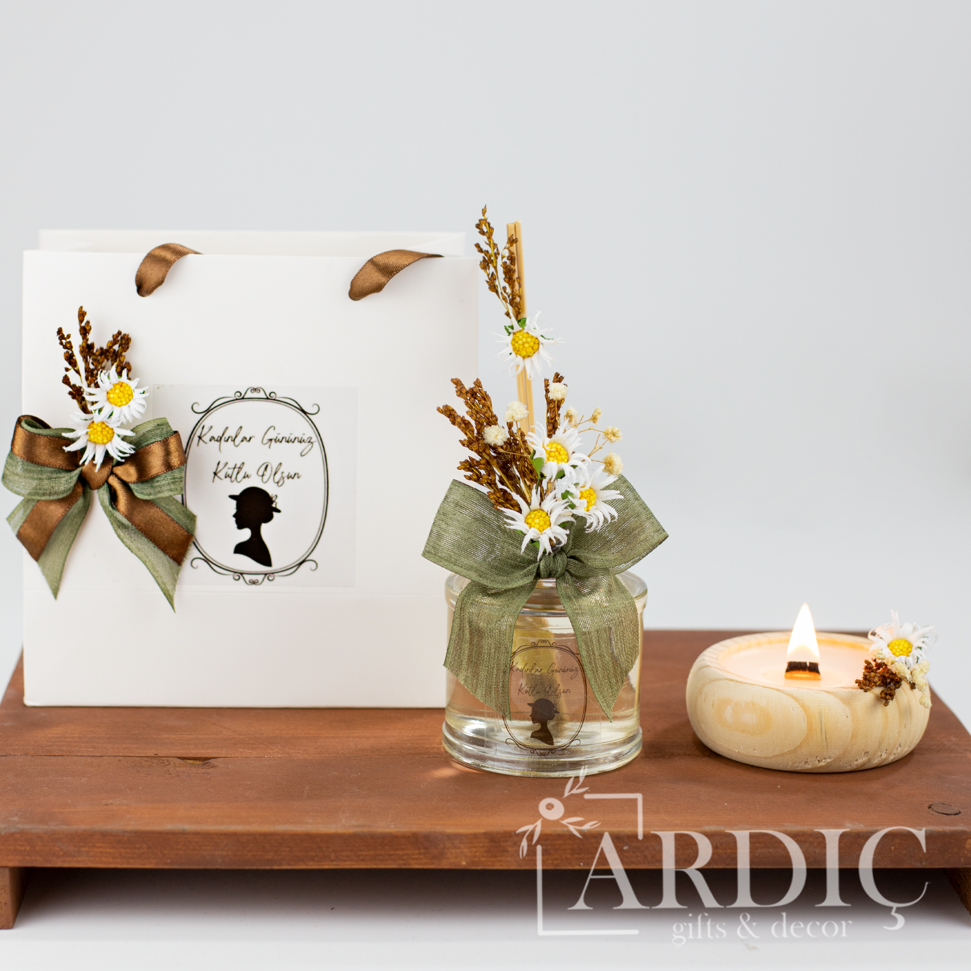 Süslemeli karton taşıma çantası içinde sunulan bu özel hediye seti; 100 cc cam şişeli oda kokusu ve difüzör çubukları ile süslemeli ahşap mumu bir araya getirir. Zarif ve estetik tasarımı sayesinde sevdiklerinize kendilerini özel hissettirecek, anlam dolu ve unutulmaz bir Kadınlar Günü hediyesi sunar. Hem dekoratif hem de şık bir hediye alternatifi olarak öne çıkar.
