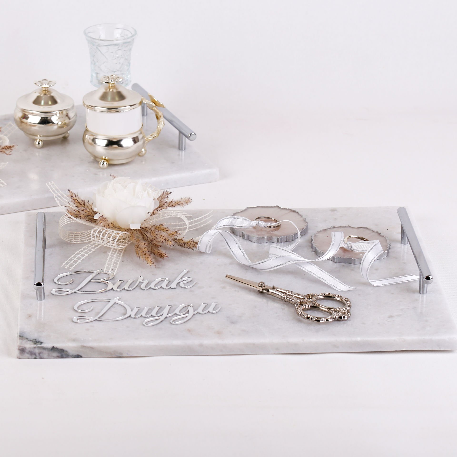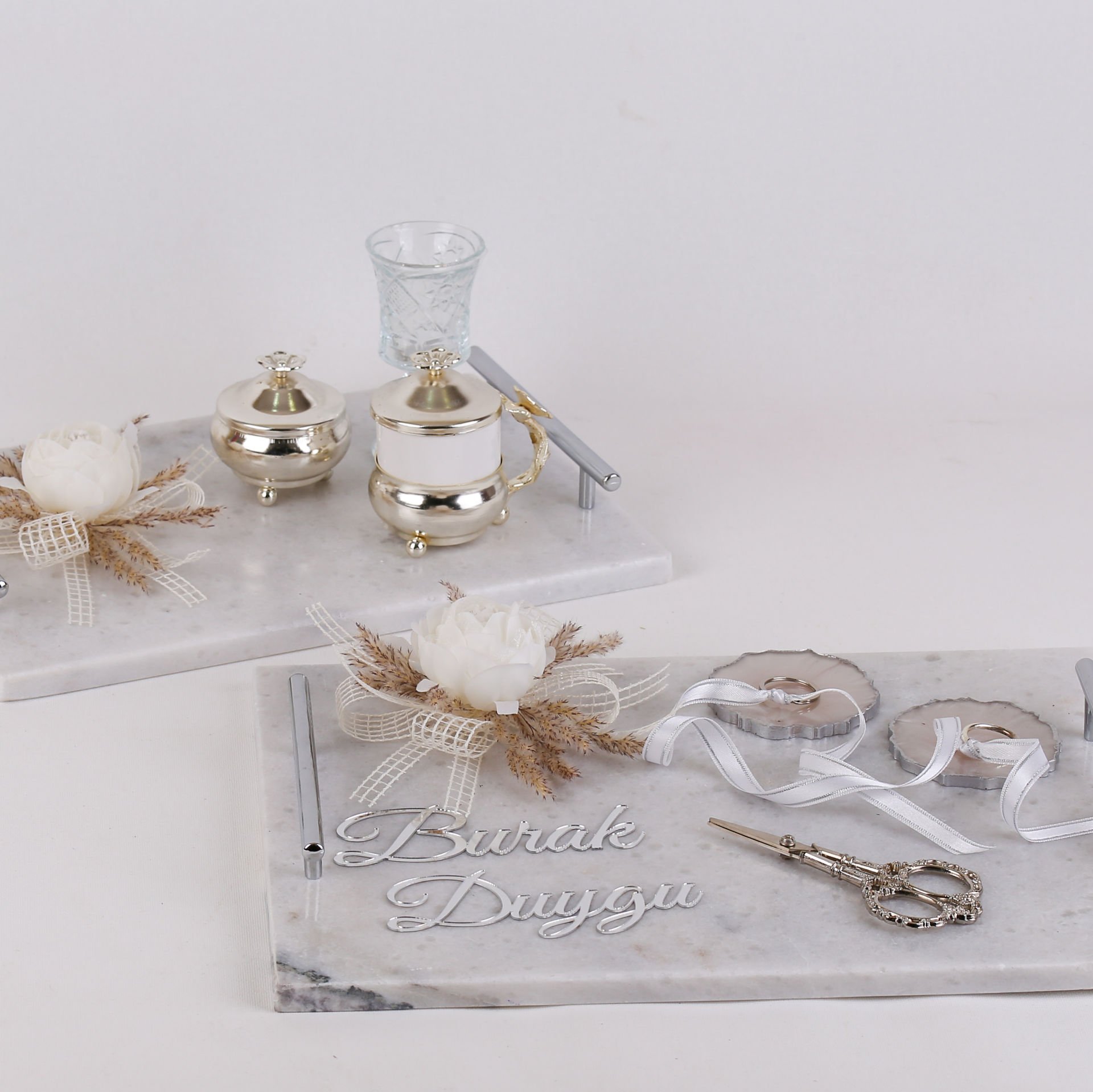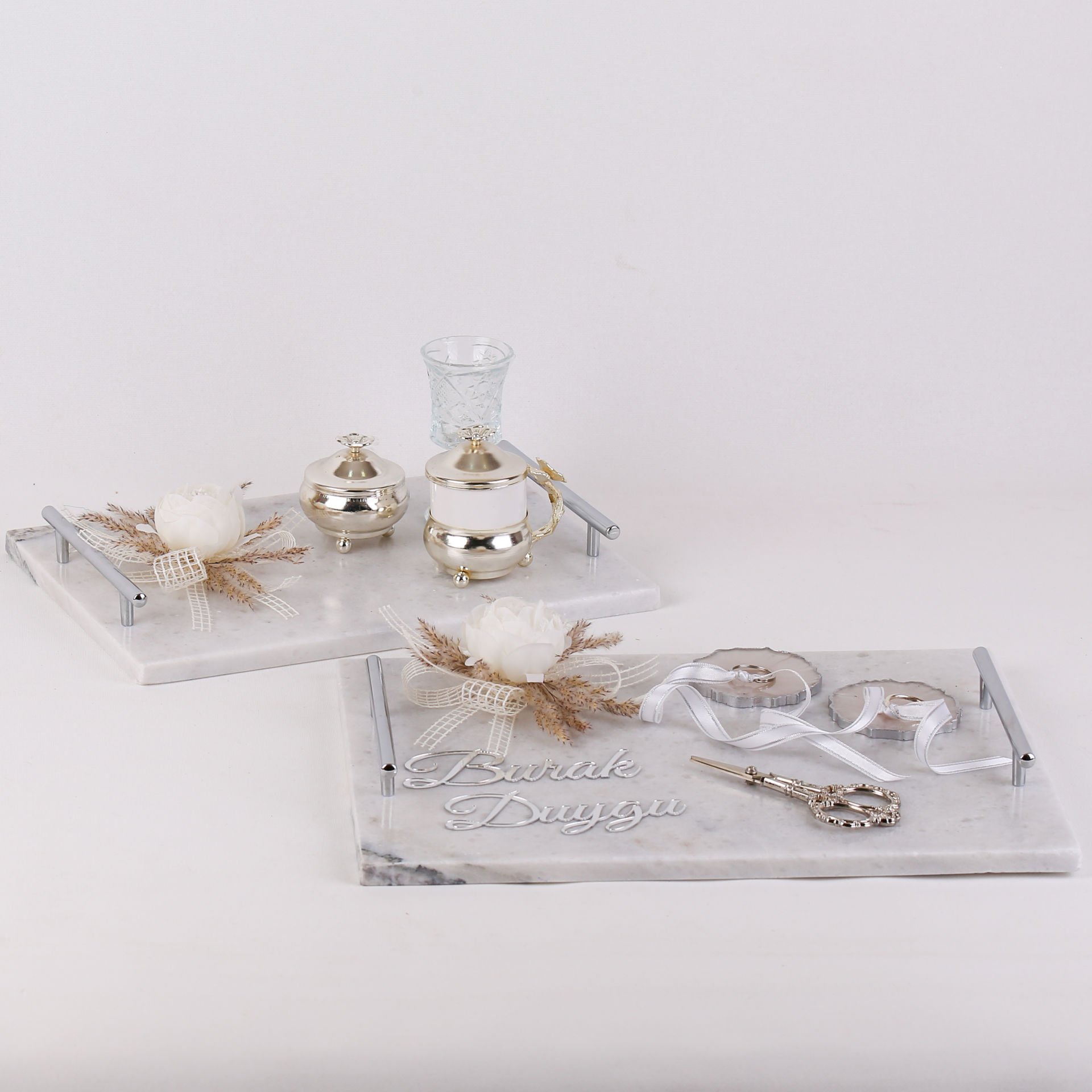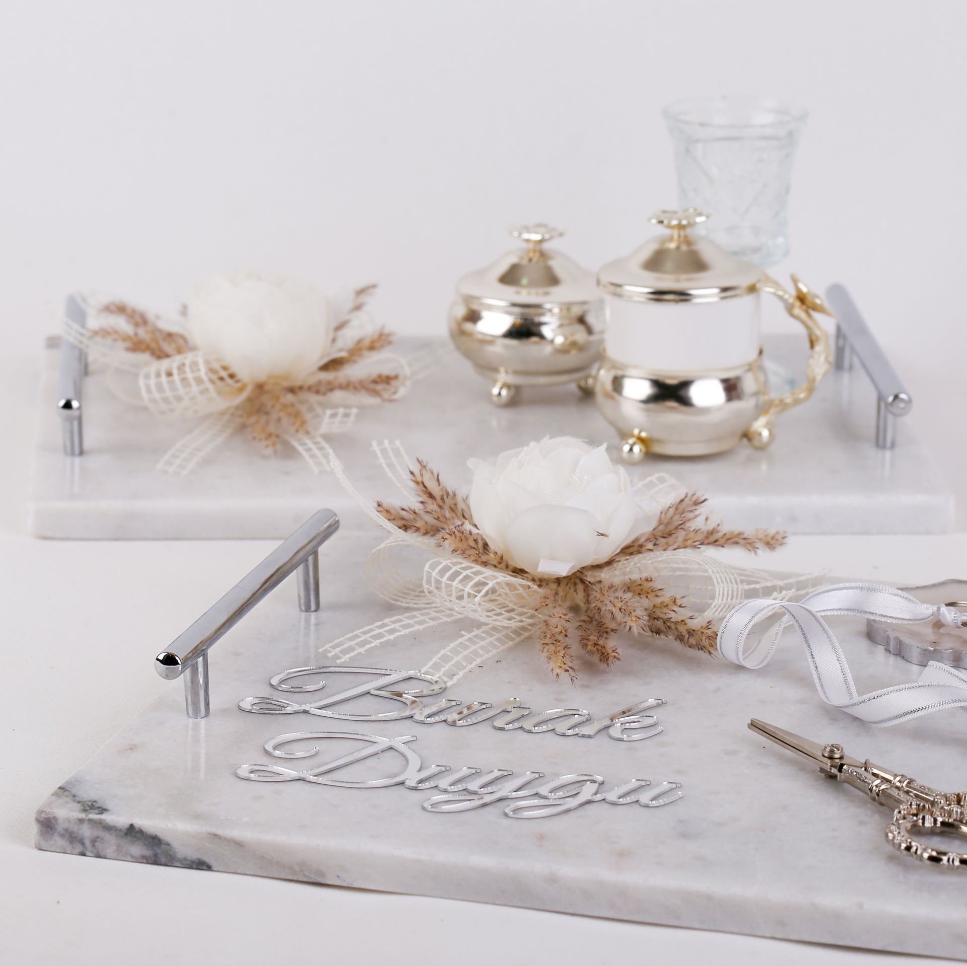 Modern mermer dokusu ve zarif gümüş detaylarıyla hazırlanan damat kahvesi ve söz tepsi seti, söz ve nişan organizasyonlarında şık bir sunum oluşturur. Hareli yüzeye sahip dikdörtgen mermer söz tepsisi, yüzük kesme törenlerinde estetik bir görünüm sunarken, uyumlu damat kahvesi tepsisi ile konsept bütünlüğü sağlar. Söz nişan tepsisi, damat kahvesi seti, kız isteme seti ve nişan organizasyon ürünleri arasında hem dekoratif hem kullanışlı bir tercih olup özel günlerinize zarif bir dokunuş katar.