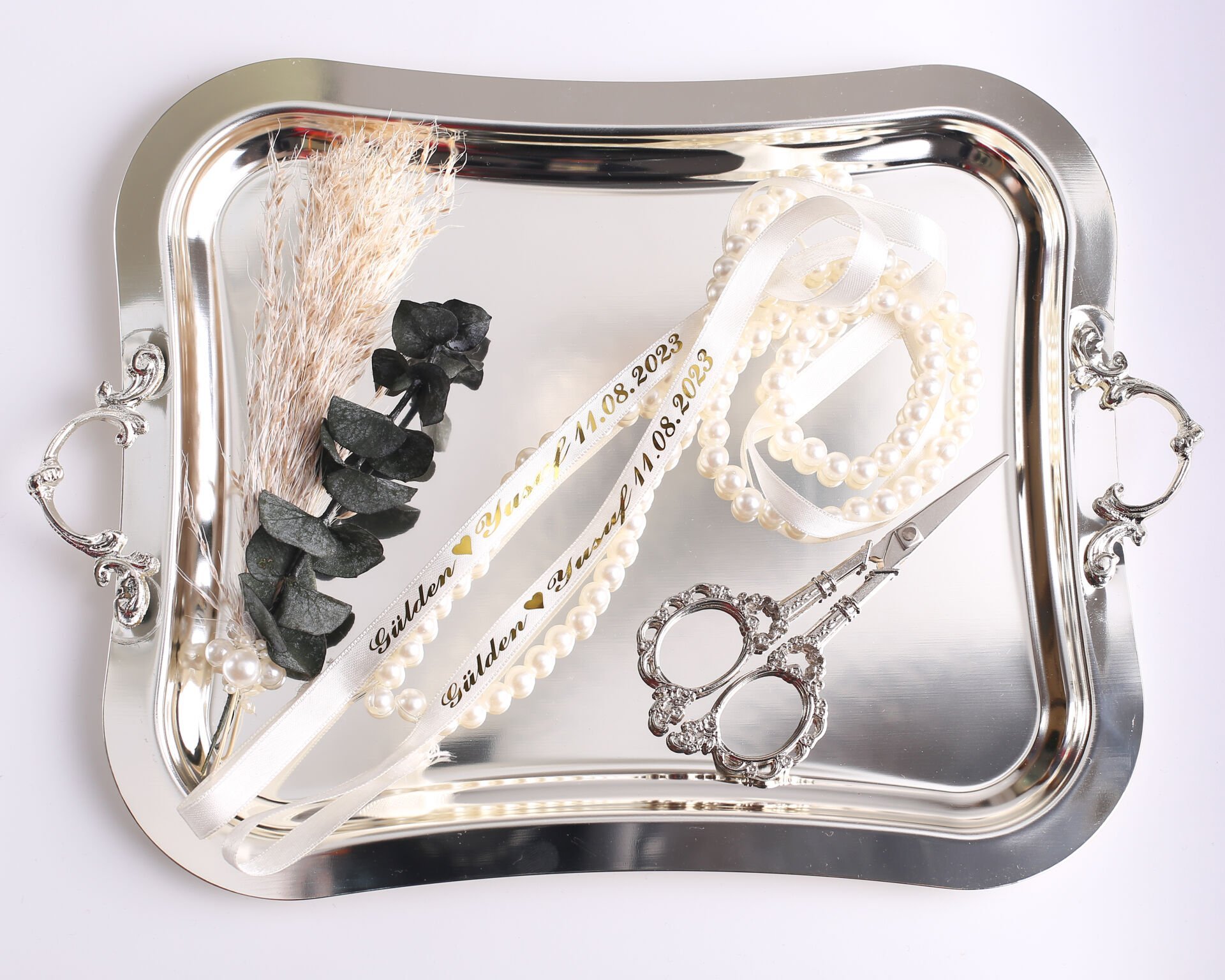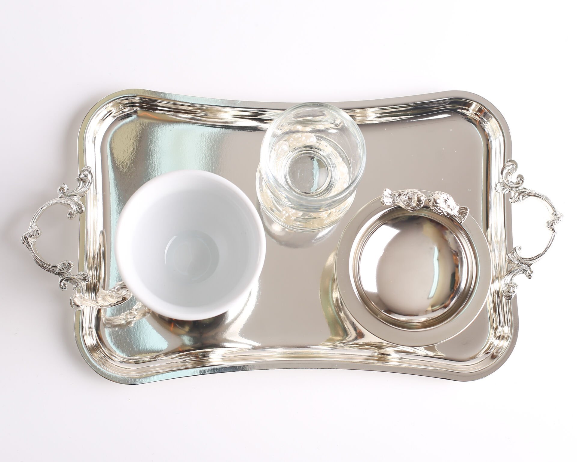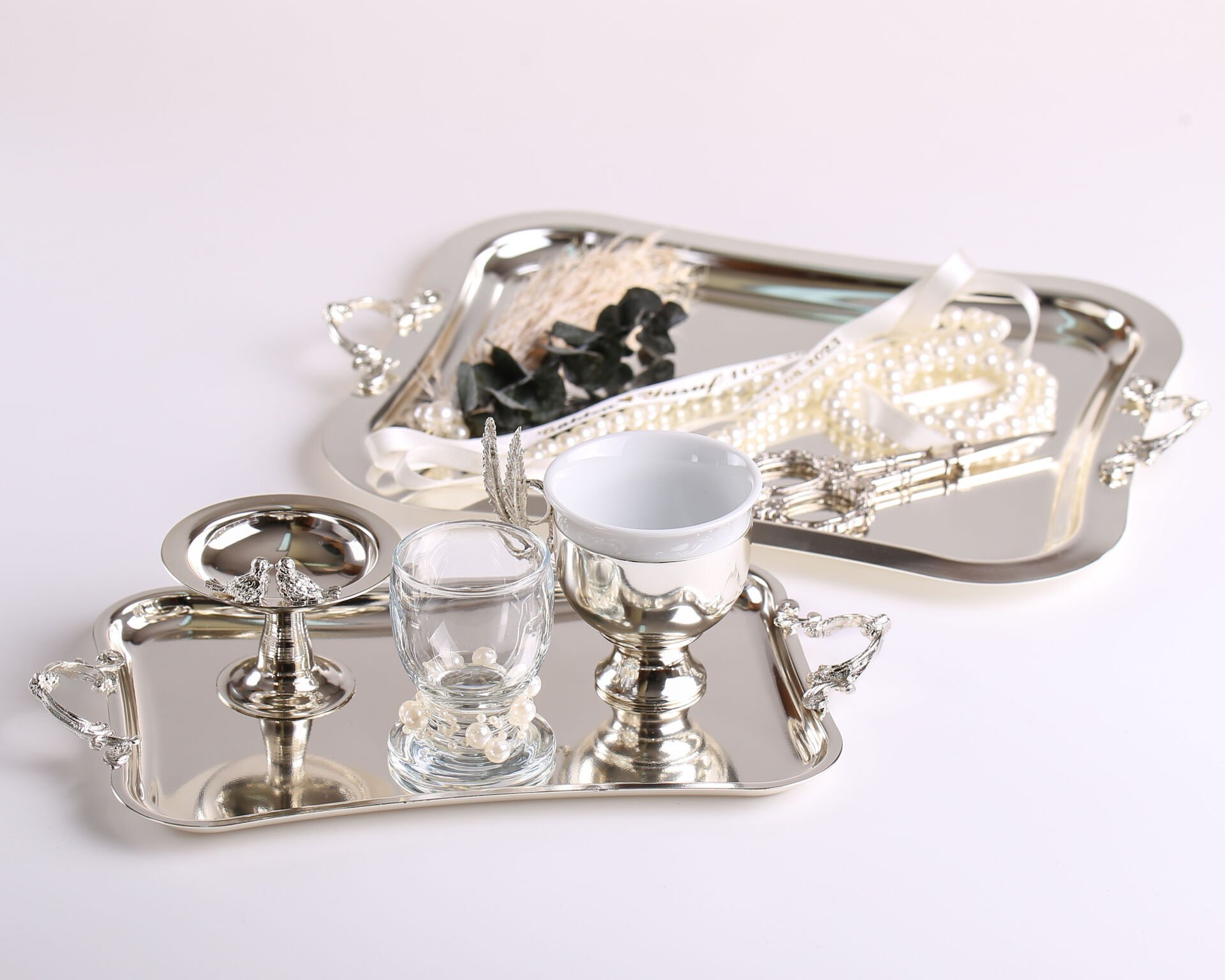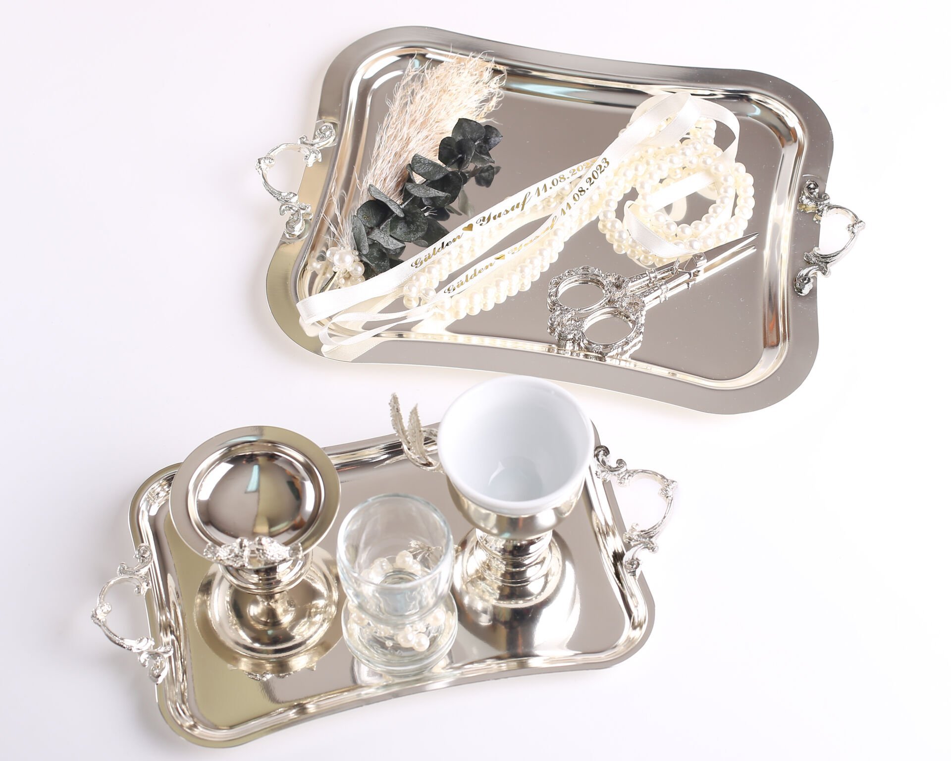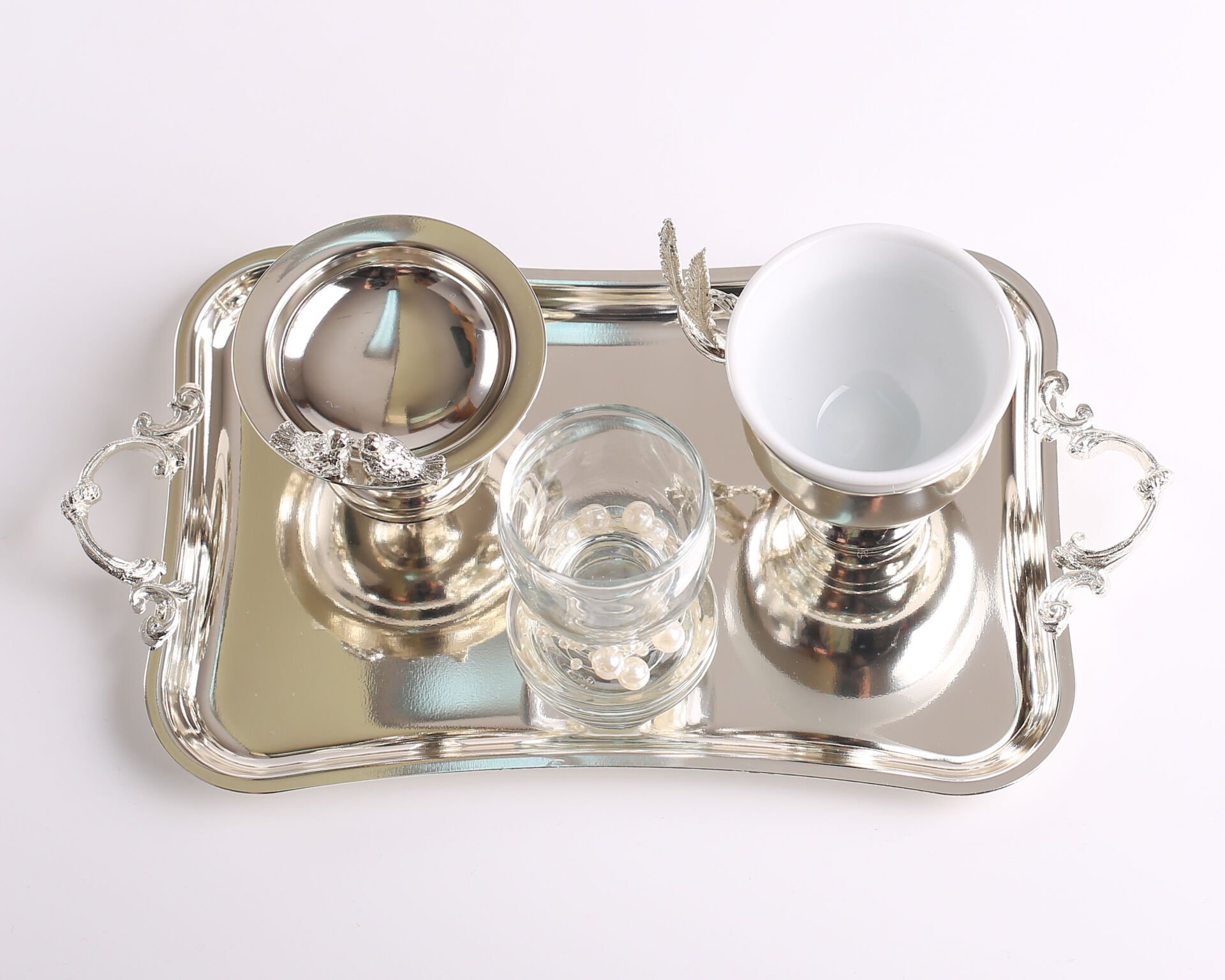 Gümüş detaylarla hazırlanan damat kahvesi ve söz tepsi seti; söz, nişan ve kız isteme organizasyonlarında şık ve uyumlu bir sunum oluşturmak için tasarlanmıştır. Zarif aksesuarları ve bütüncül konsepti sayesinde özel günlerinizde hem estetik hem de kullanışlı bir seçenek sunar.