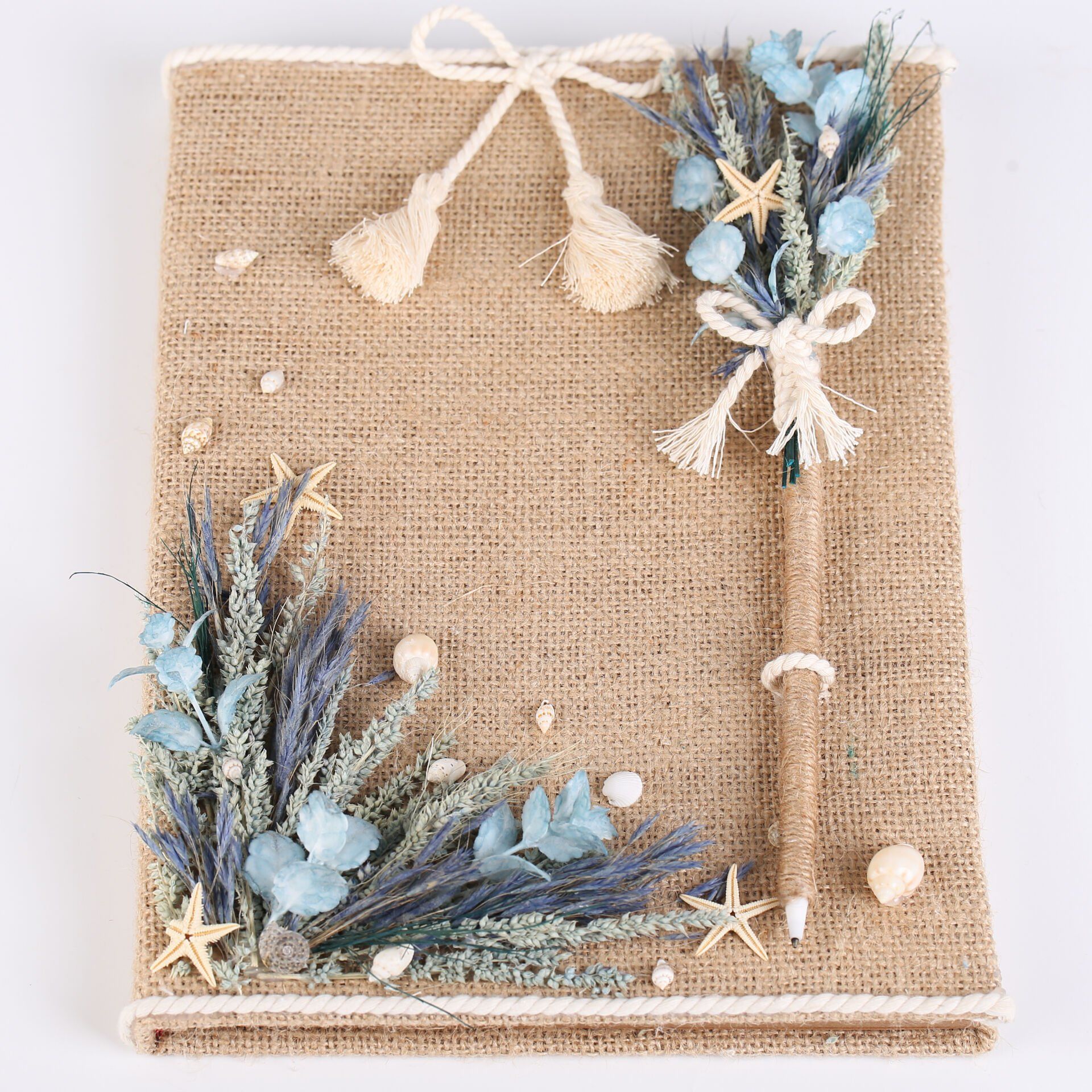 Deniz konsept detaylarıyla hazırlanan anı defteri ve kalem seti; söz, nişan, nikah, kına ve özel organizasyonlarınızda misafirlerinizin güzel dileklerini yazabileceği şık bir hatıra seçeneğidir. Jüt kumaş kaplaması ve dekoratif süslemeleri sayesinde masa düzeninize doğal ve estetik bir görünüm kazandırır.