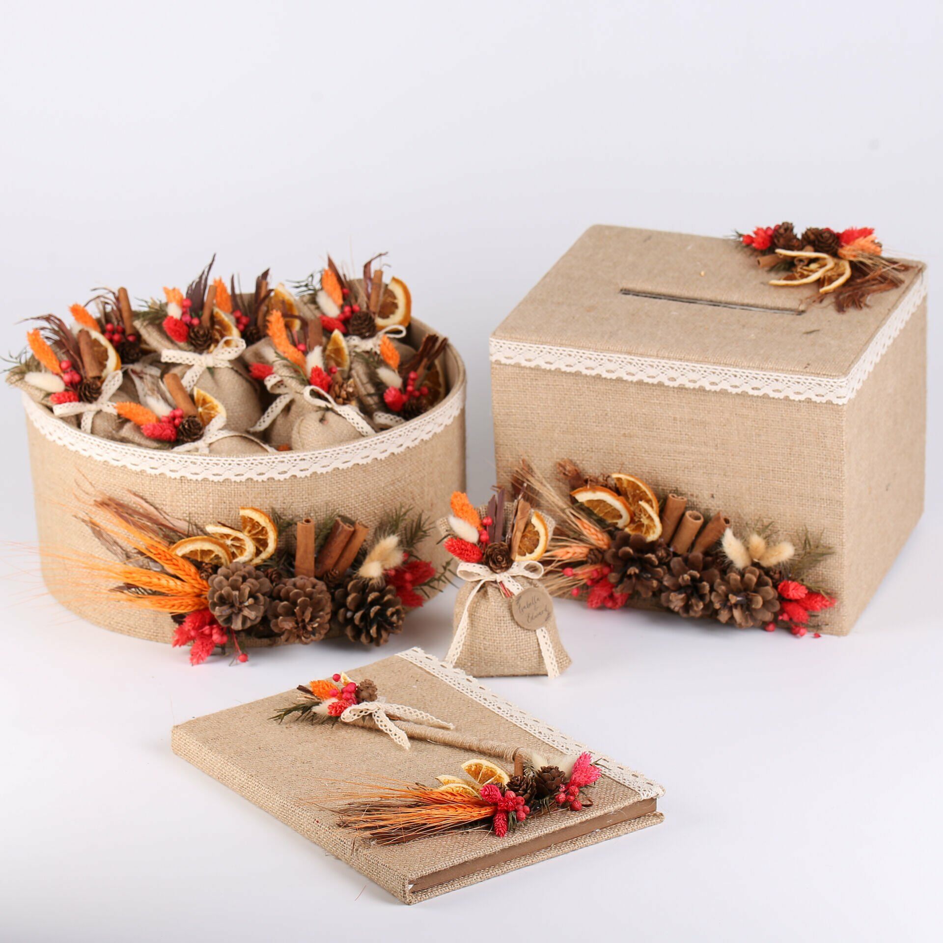 Doğa konsept detaylarıyla hazırlanan anı defteri ve kalem seti; söz, nişan, nikah, kına ve özel organizasyonlarınızda misafirlerinizin güzel dileklerini yazabileceği şık ve anlamlı bir hatıra sunar. Jüt kumaş kaplaması, kraft yaprak süslemeleri ve doğal konsepti sayesinde masa düzeninize estetik bir görünüm kazandırır.