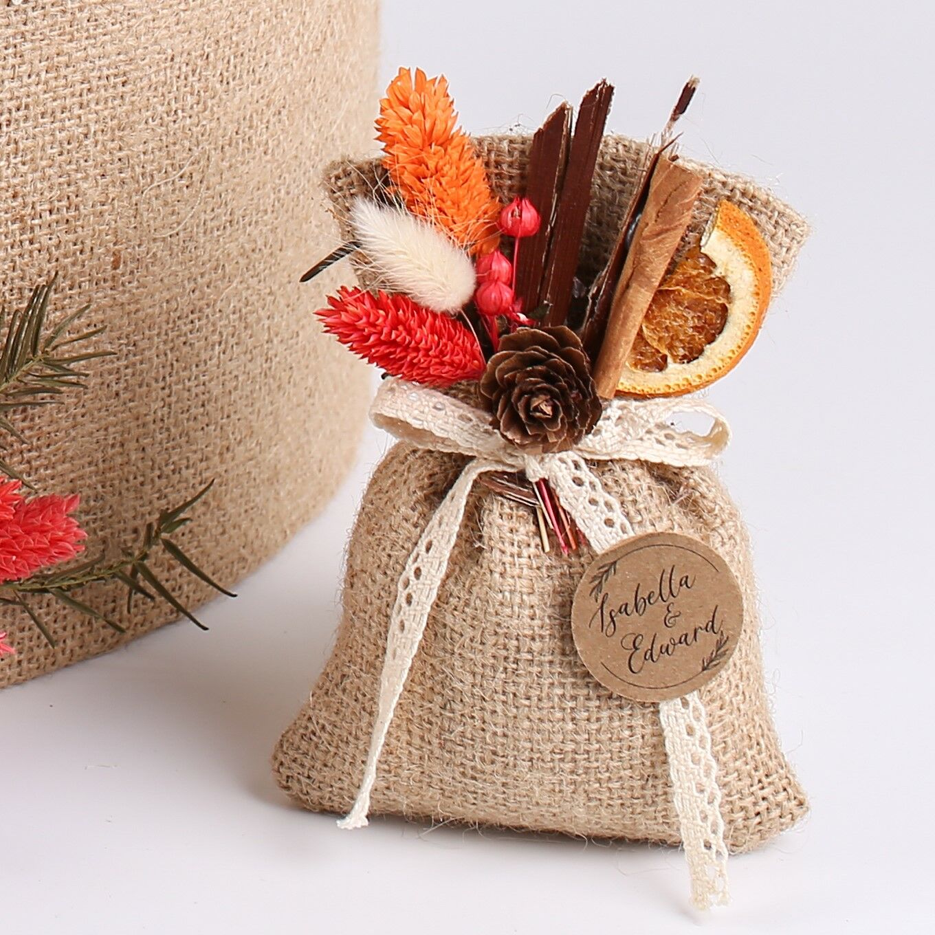 Doğa konsept detaylarıyla hazırlanan jüt lavanta kesesi; söz, nişan, nikah, kına ve özel organizasyonlarınızda misafirlerinize sunabileceğiniz zarif ve anlamlı bir hediyelik seçeneğidir. Doğal jüt dokusu ve dekoratif süslemeleri sayesinde hem estetik hem de hoş kokulu bir hatıra sunar.
