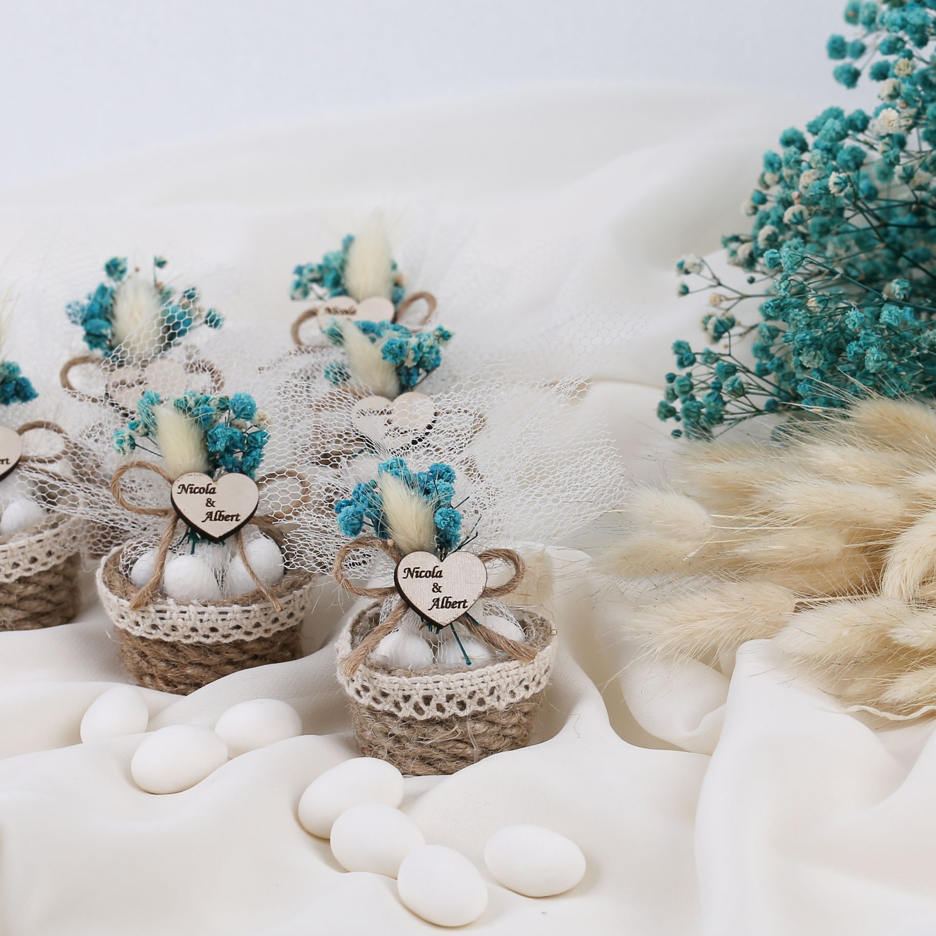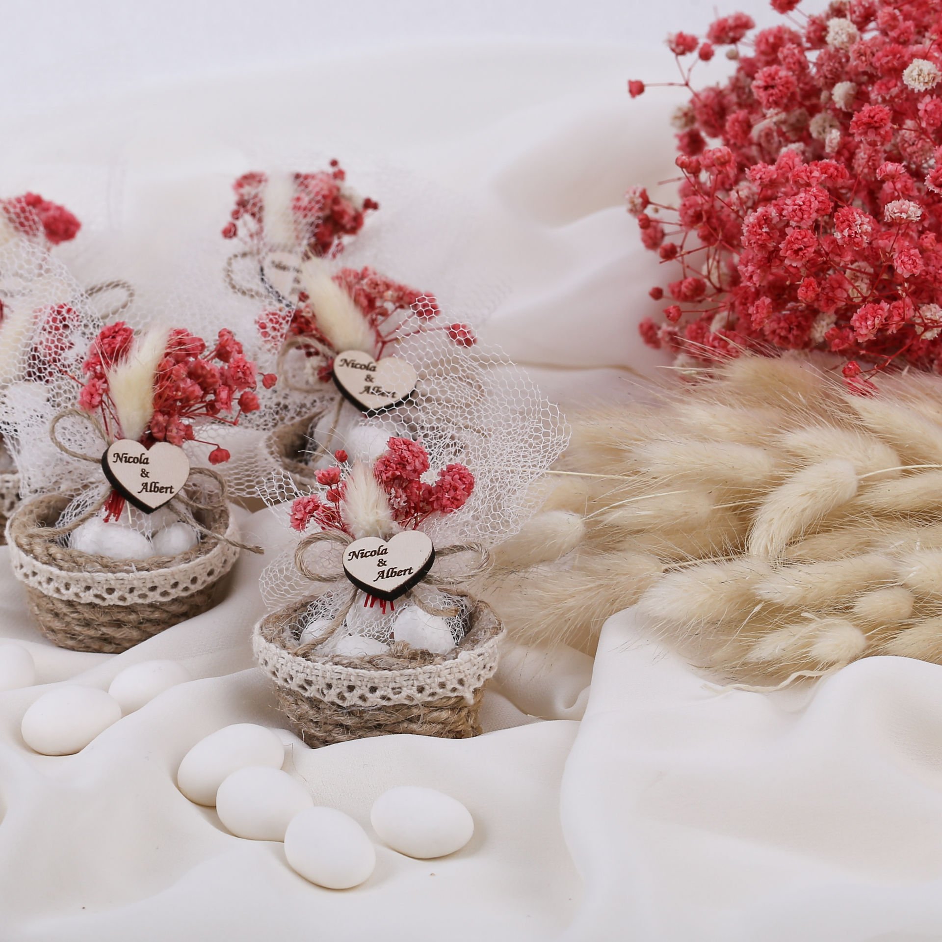 5 kayısı şekeri drajeli mini jüt sepetler, ahşap isim etiketli ve mavi, kırmızı, krem renk seçenekleriyle sunulur. Düğün, nişan, kına gecesi gibi özel günlerde misafirlere hediye olarak verilebilecek şık ve zarif bir alternatiftir. Kayısı şekeri drajeleri ile tatlı bir dokunuş sunan bu mini sepetler, doğal jüt malzeme ve kişiselleştirilebilir etiketleriyle organizasyonlarınıza estetik bir hava katar.