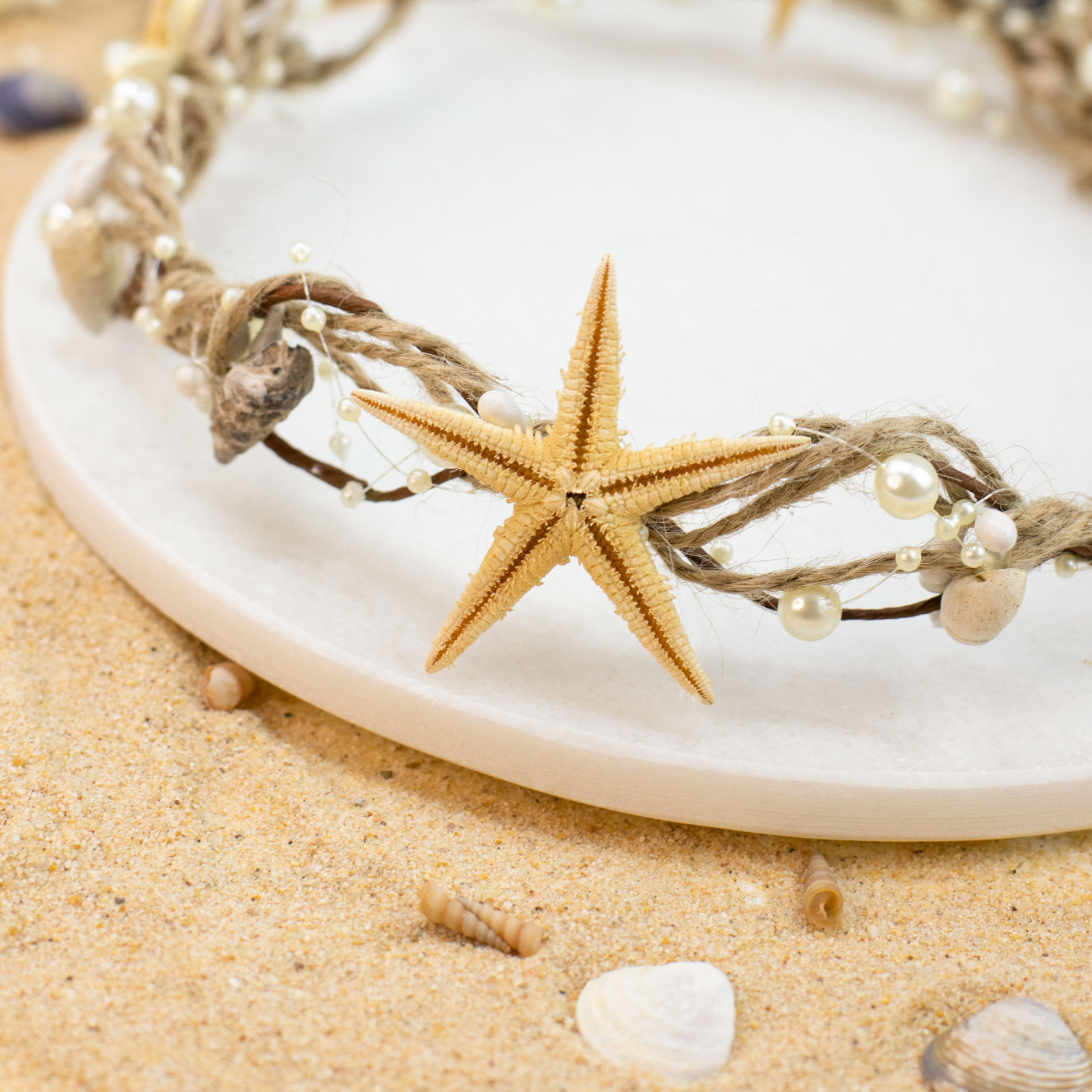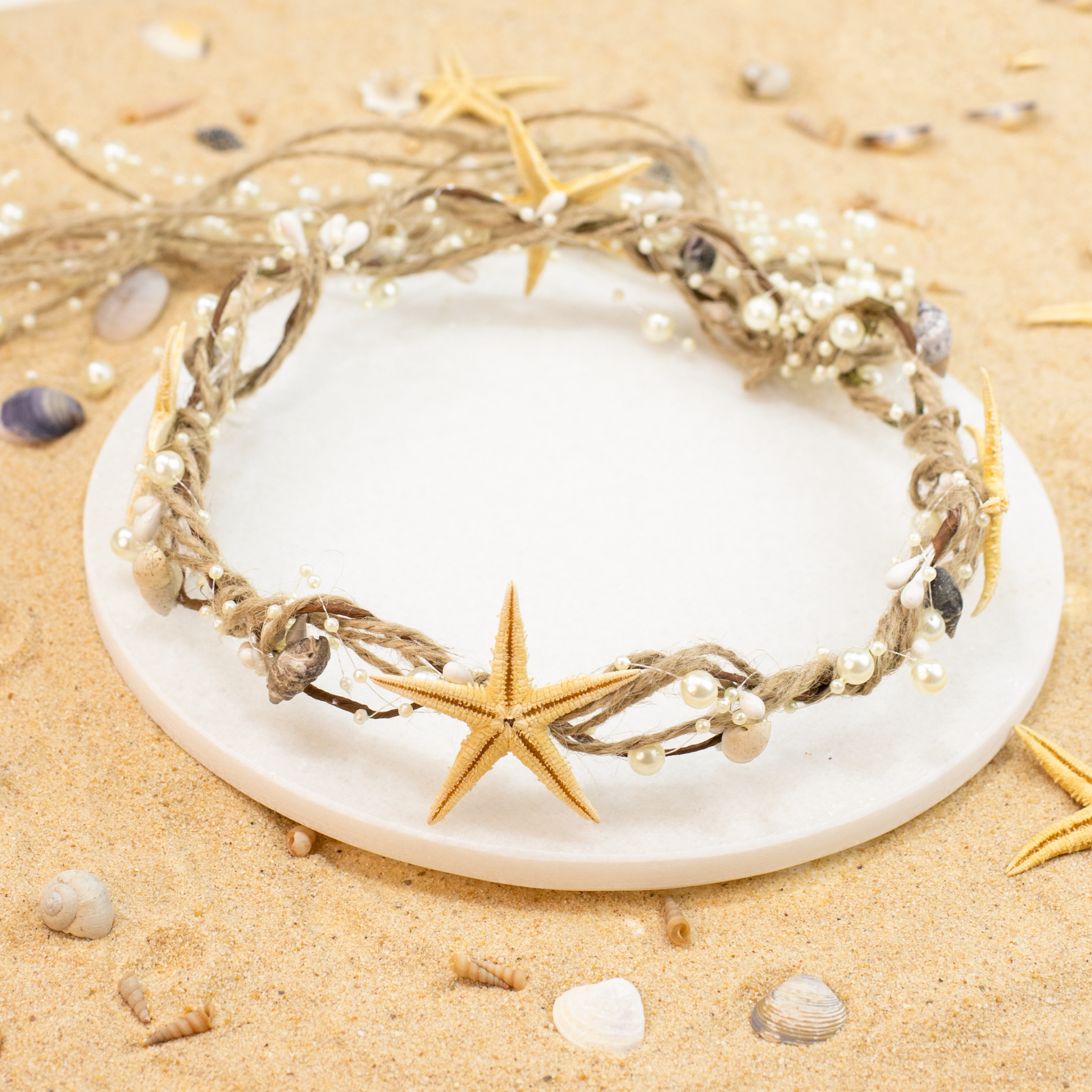 Hasır ip detayları, inci süslemeleri ve deniz yıldızı aksesuarlarıyla tasarlanan gelin tacı; doğal ve zarif görünümüyle söz, nişan, kına, nikah, düğün, konsept çekimler ve özel günlerde tamamlayıcı bir aksesuardır. Deniz konseptli organizasyonlar için de şık bir tercih olup hatıra veya hediye olarak da değerlendirilebilir.