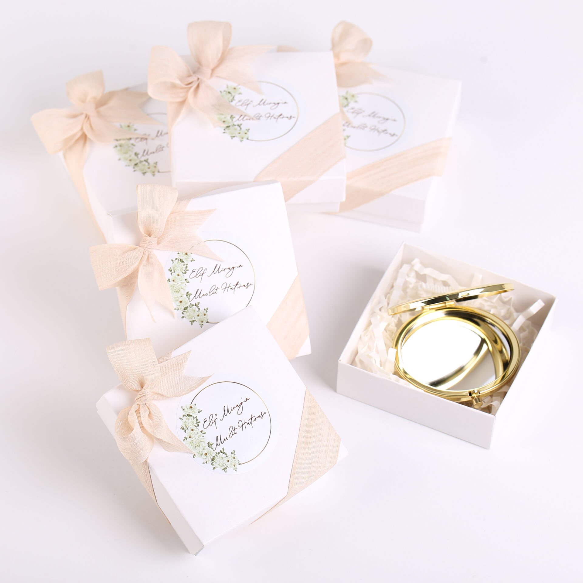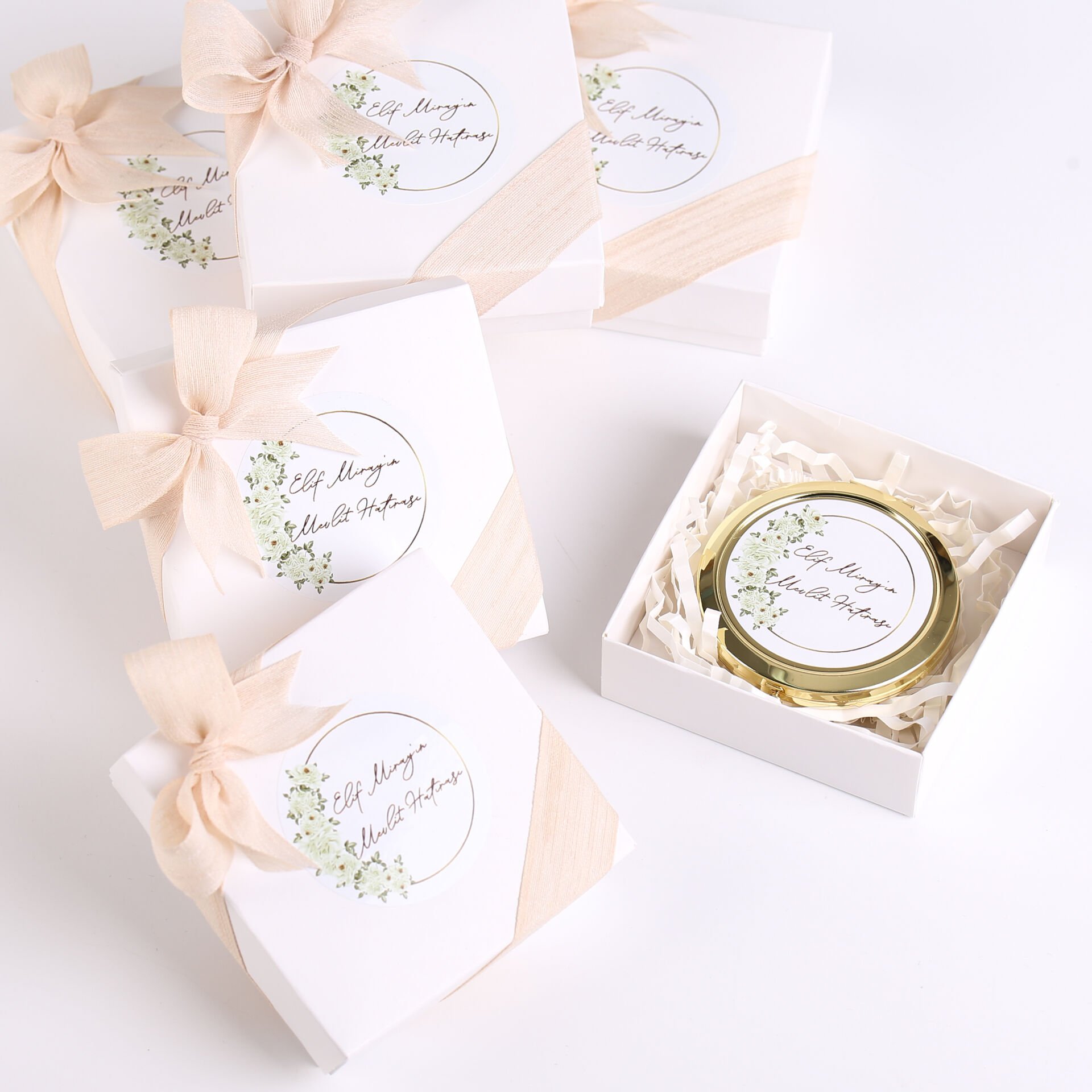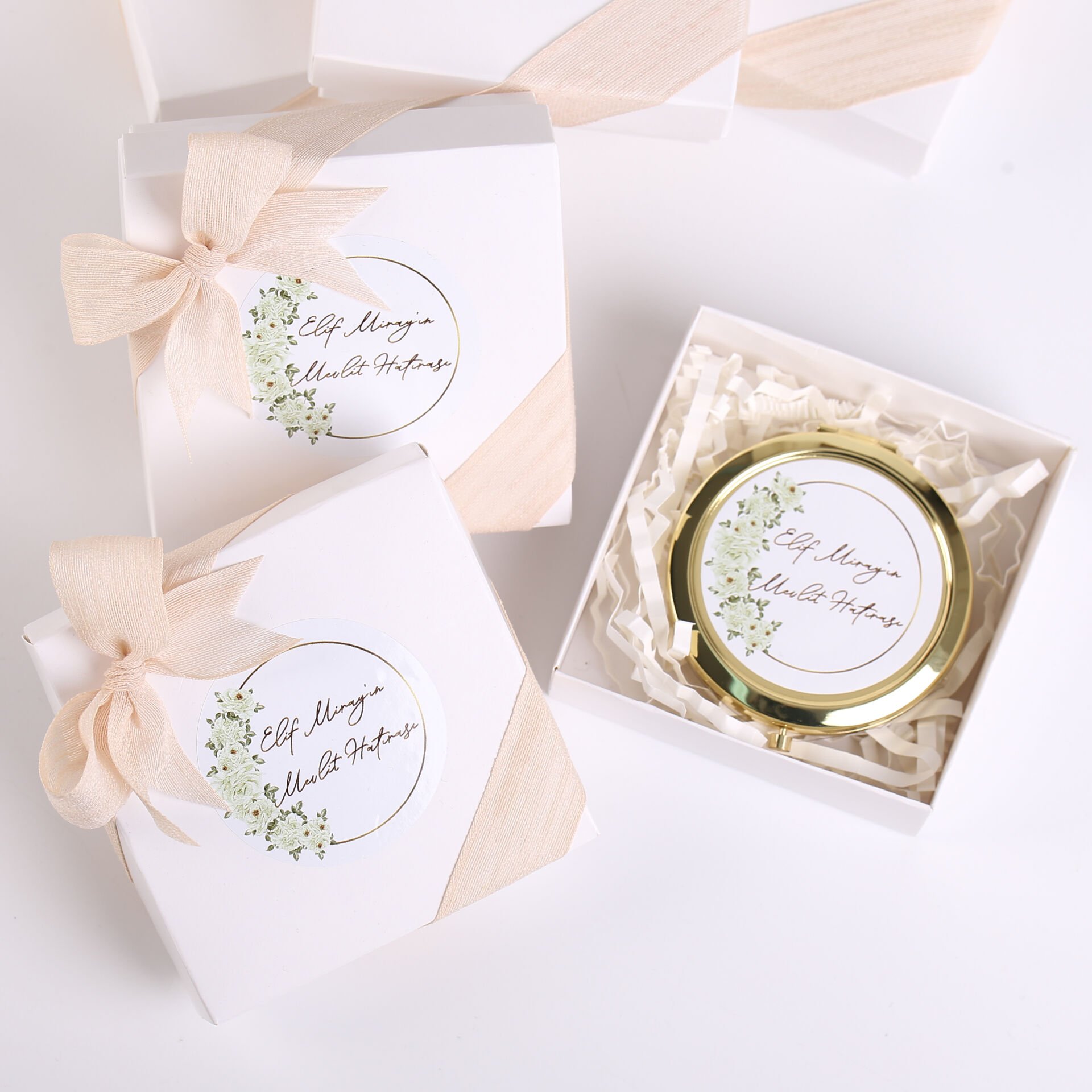 Metal gold çerçeveli ayna, keten kurdele detayı ve şık beyaz kutu sunumuyla hazırlanan zarif set; söz, nişan, düğün, kına gecesi, nikah, baby shower, doğum günü, mevlit ve özel gün organizasyonlarında misafirlere verilebilecek şık ve kullanışlı bir hediyelik alternatiftir. Minimal ve estetik tasarımı sayesinde hem hatıra hem de günlük kullanım için tercih edilebilir.