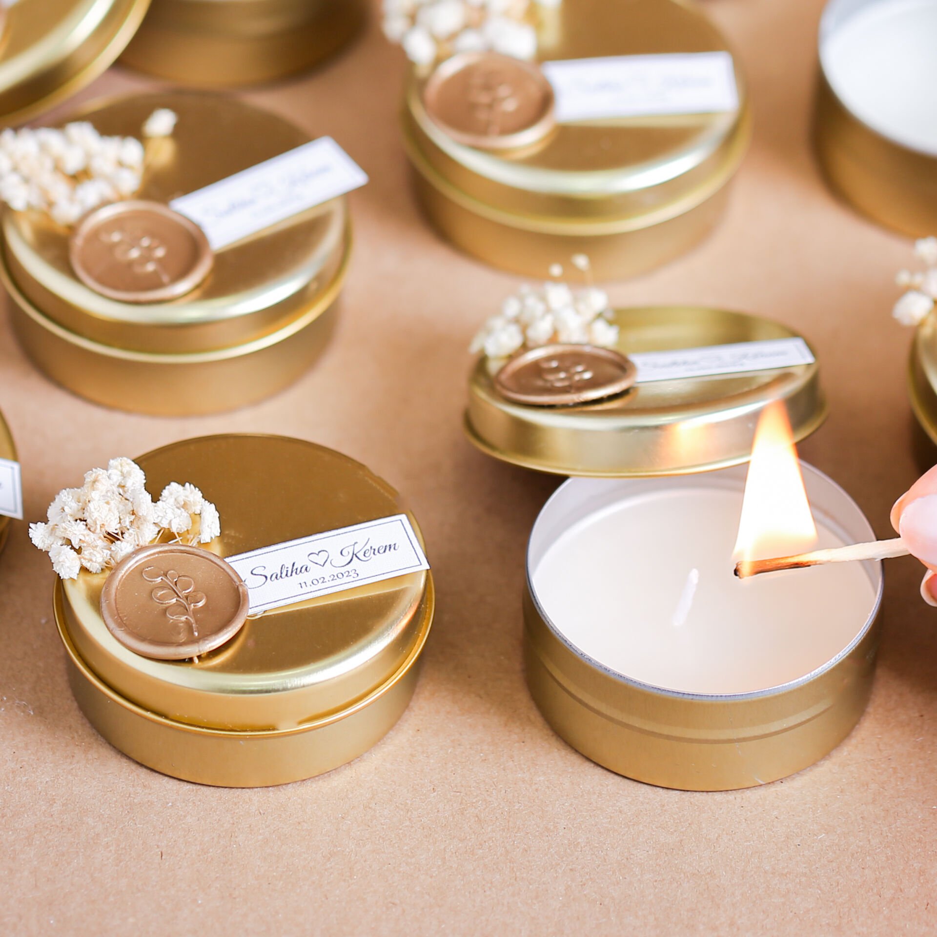 Şık ve zarif tasarımıyla hazırlanan gold metal kutuda mum, söz, nişan, kına, nikah ve özel organizasyonlarda misafirlere sunulabilecek estetik bir hediyelik seçeneğidir. Cipso çiçek süslemesiyle dekoratif bir görünüm kazanan mum hediyelik, hem kullanışlı hem kalıcı bir hatıra sunar. Nikah hediyeliği, kına hediyeliği, söz nişan hediyelikleri ve organizasyon hatıralıkları arasında zarif detaylarıyla öne çıkan şık bir üründür. Özel günlerinizde konseptinize uyum sağlayan anlamlı bir hediye alternatifi sunar.