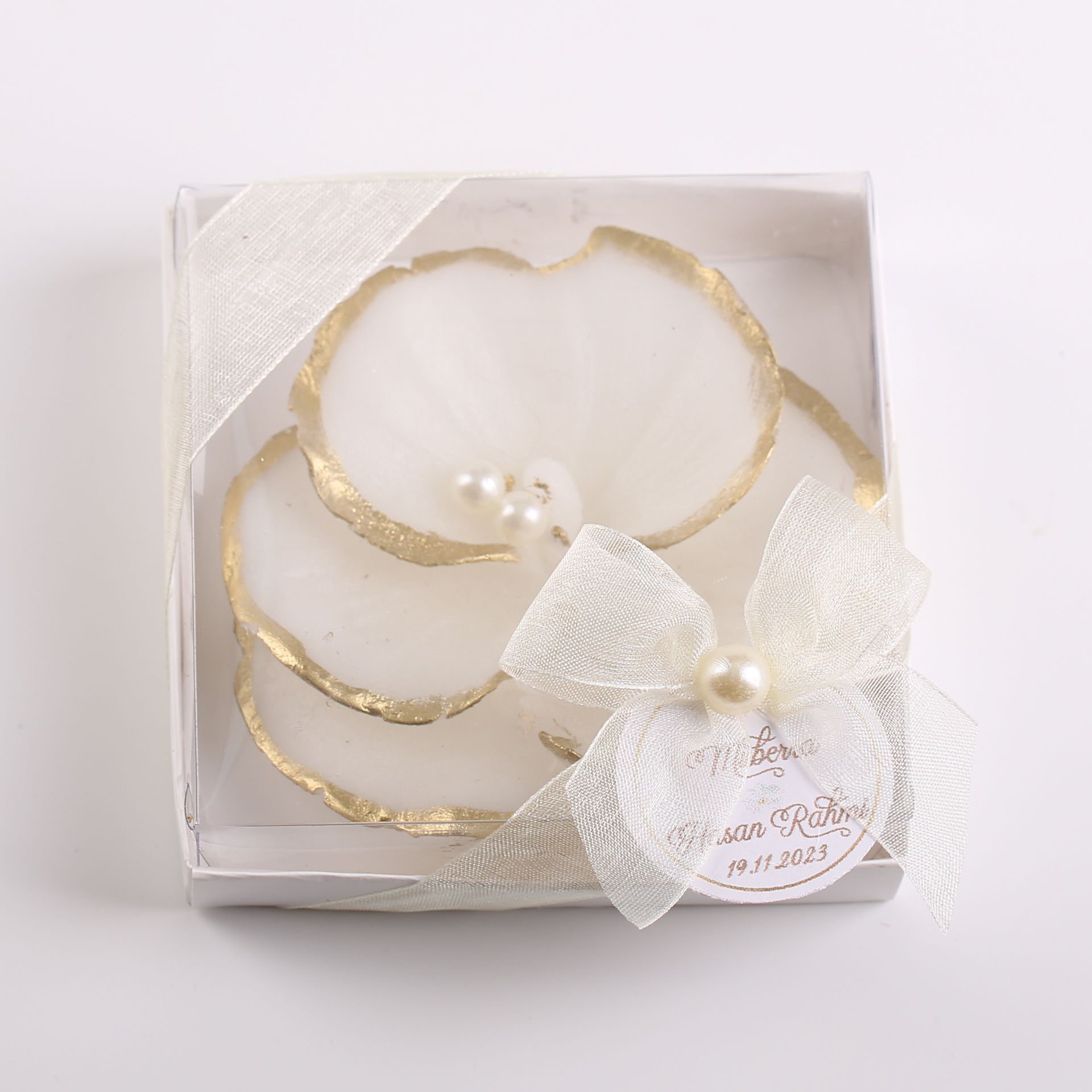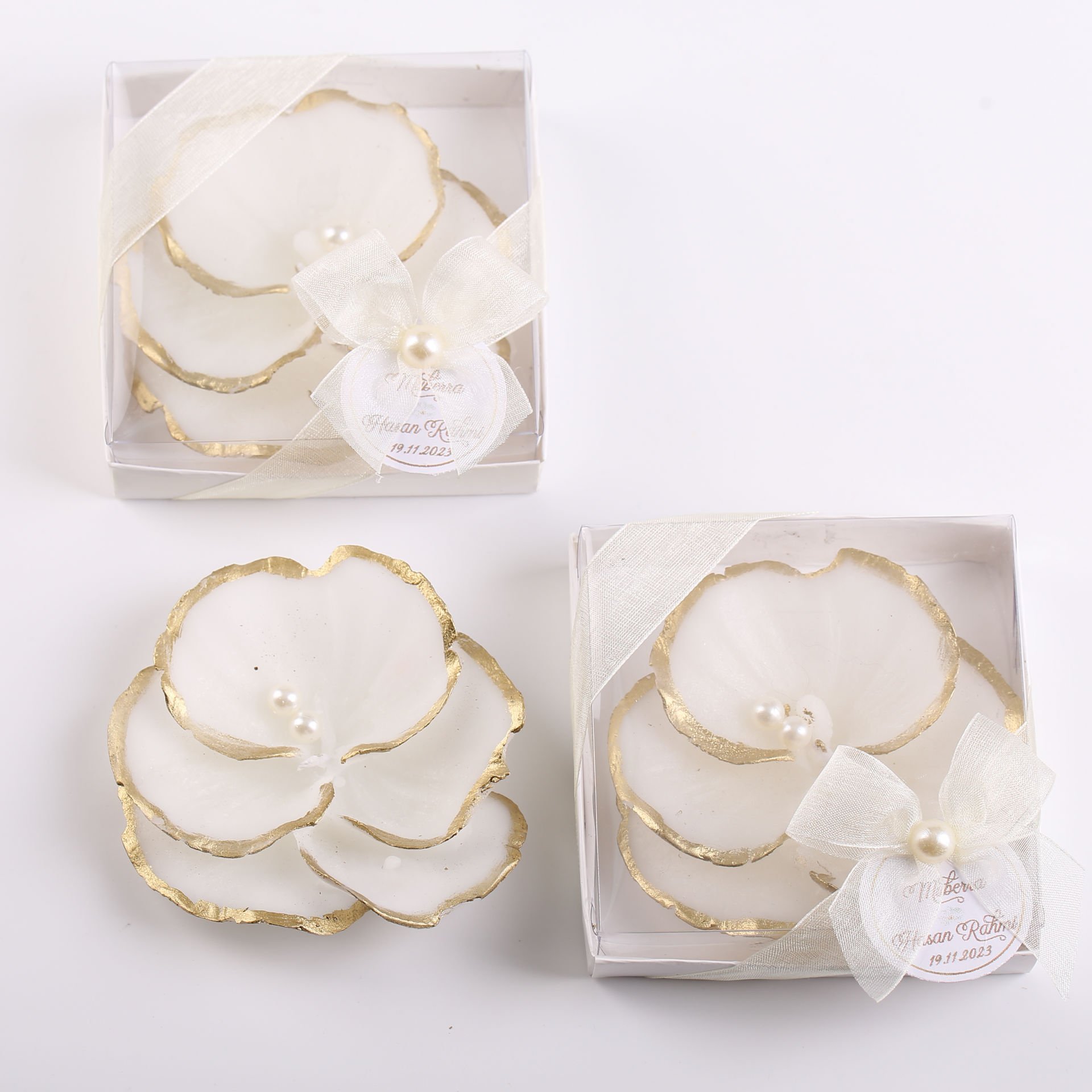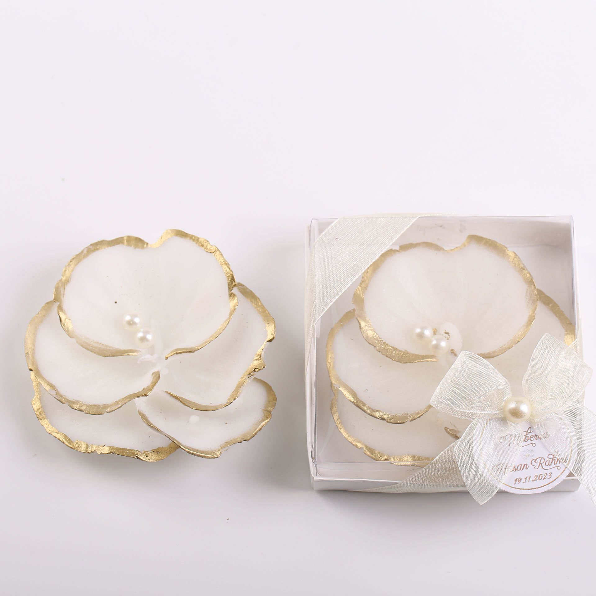 Bu şık mum, gold yaldızlı incili süslemeleriyle zarif ve göz alıcı bir tasarıma sahiptir. Orkide çiçeği detaylarıyla tamamlanan bu mum, düğün, nişan, kına gecesi, nikah ve diğer özel günlerde hem dekoratif hem de kullanışlı bir aksesuar olarak kullanılabilir. Estetik görünümü sayesinde hem sunumda hem de hatıra olarak uzun süre saklanabilir.