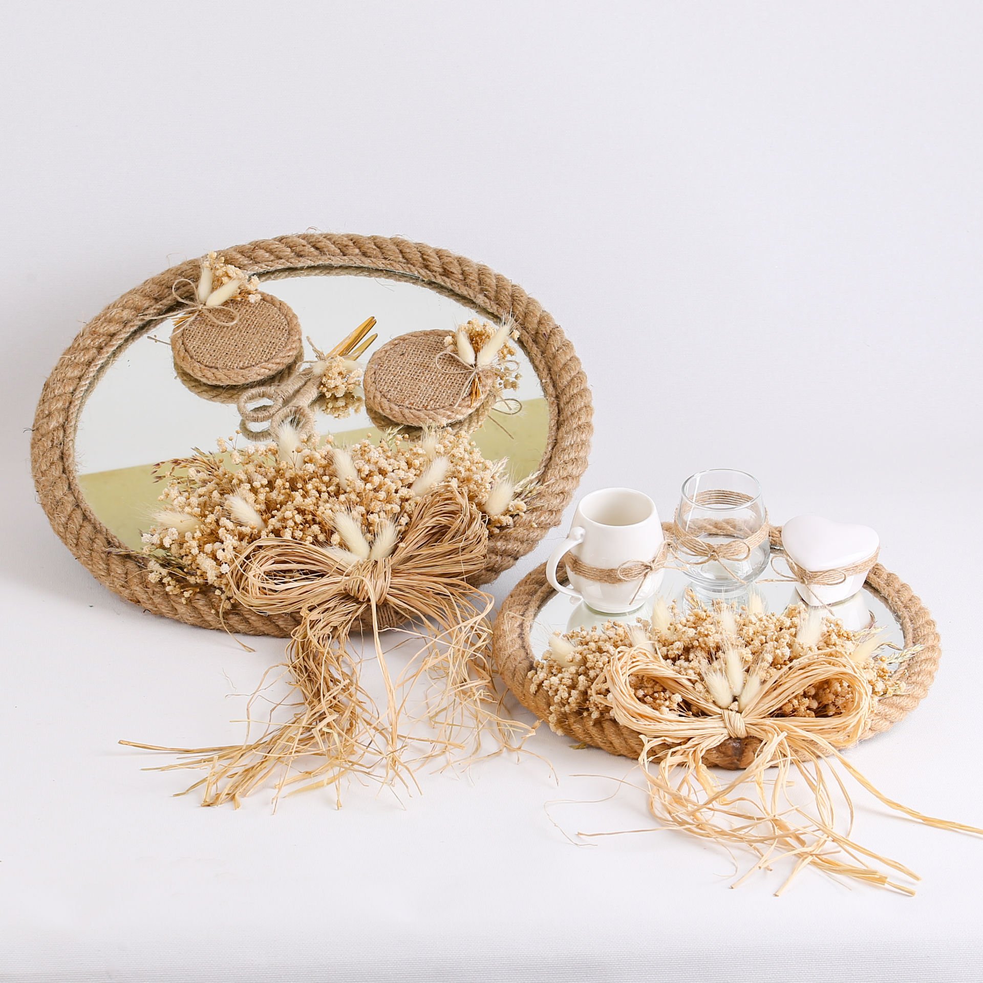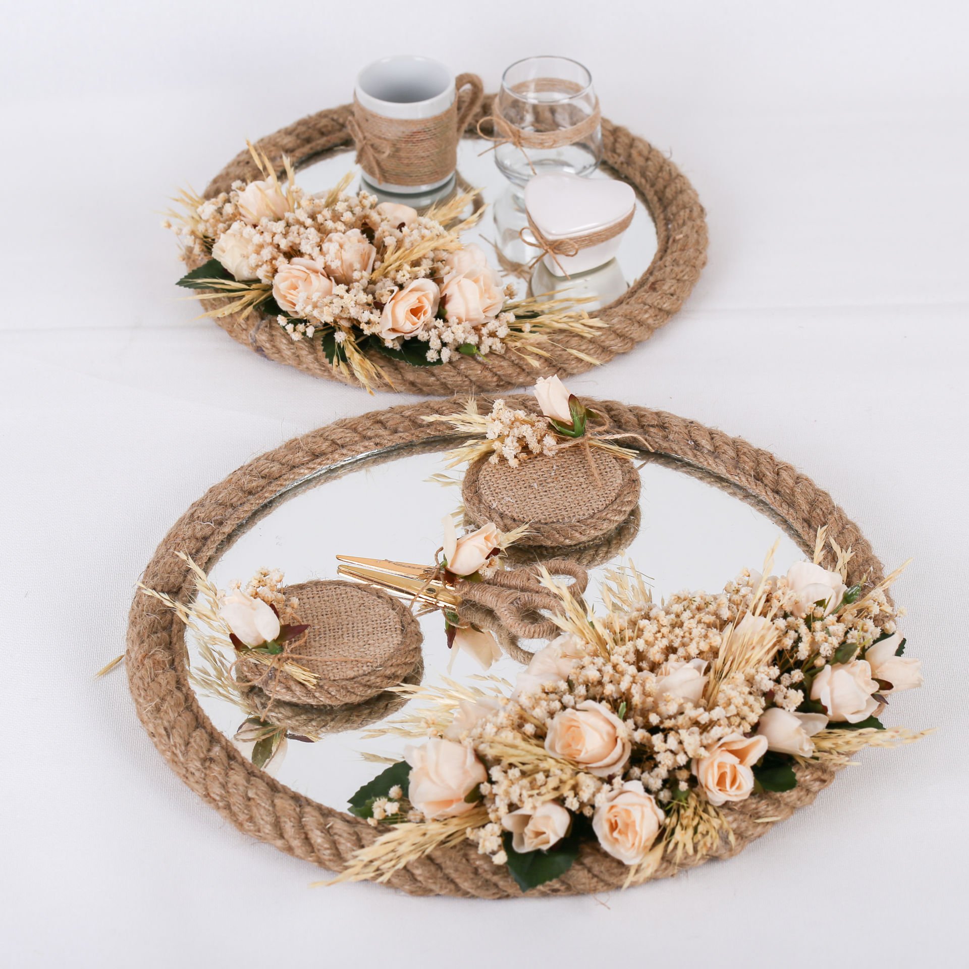 Doğal ve rustik tasarımıyla hazırlanan halatlı jüt damat kahvesi ve söz tepsi seti, söz ve nişan organizasyonlarında konseptinize uyum sağlayan şık bir sunum oluşturur. İçi aynalı detaylara sahip jüt söz tepsisi ve damat kahvesi tepsisi, dekoratif görünümüyle dikkat çekerken, set içerisinde yer alan tamamlayıcı aksesuarlarla bütünlük sağlar. Söz nişan tepsisi, damat kahvesi seti, kız isteme seti ve nişan organizasyon ürünleri arasında hem estetik hem kullanışlı bir tercih olup özel günlerinize doğal bir zarafet katar.