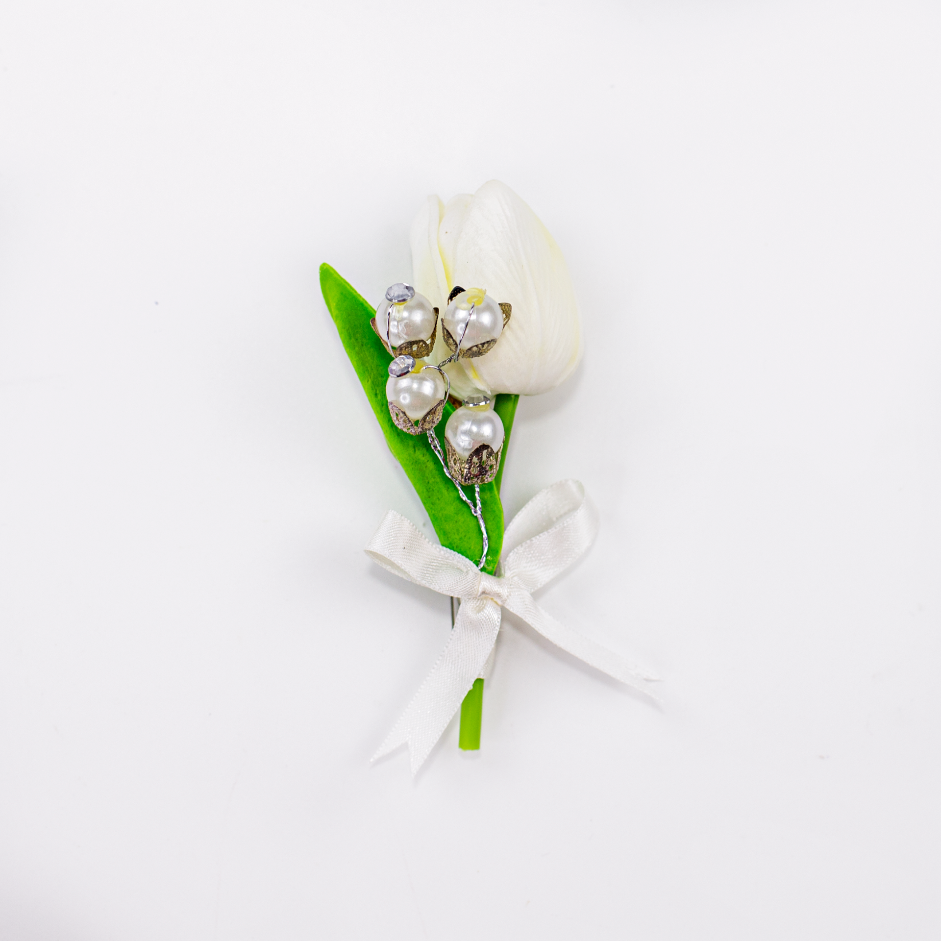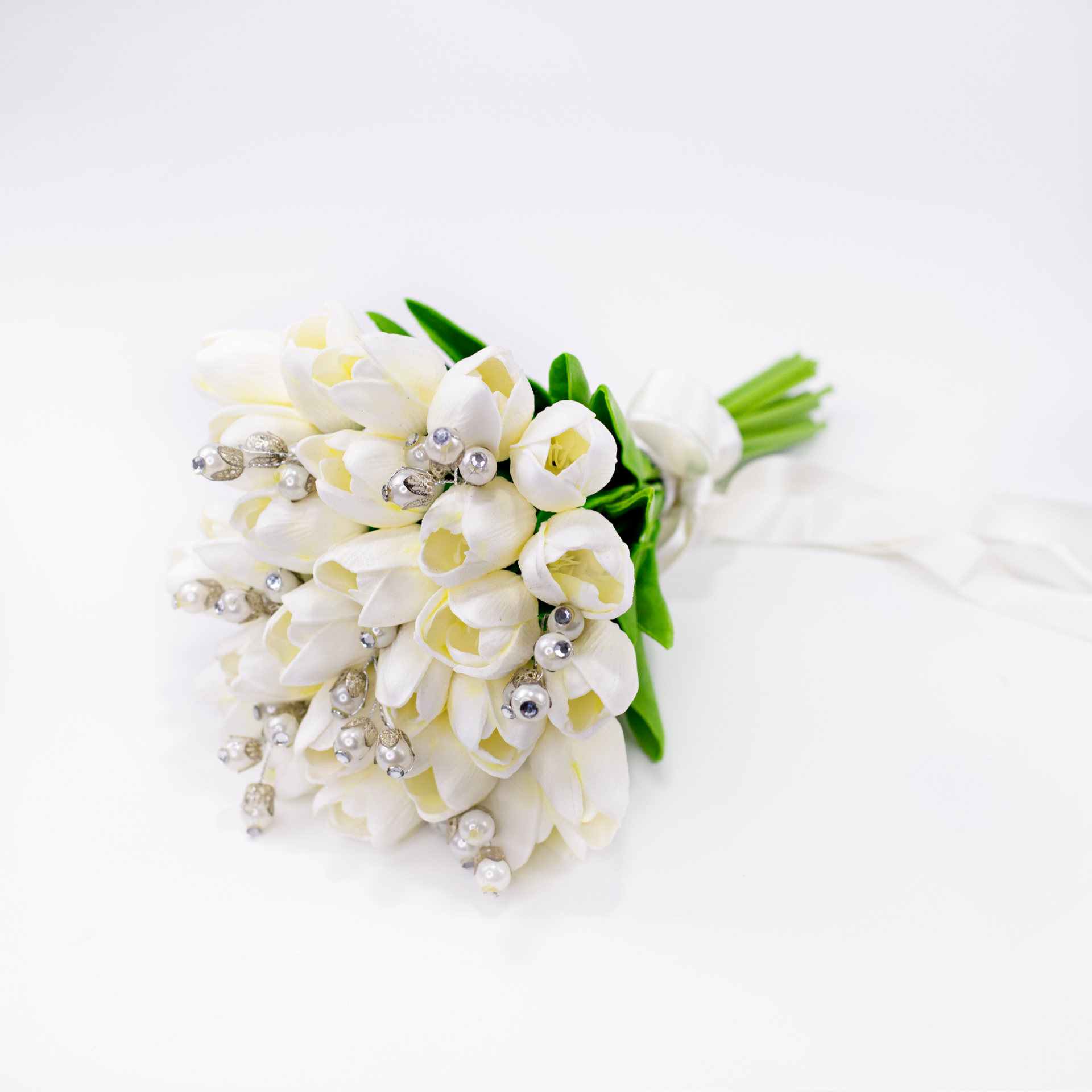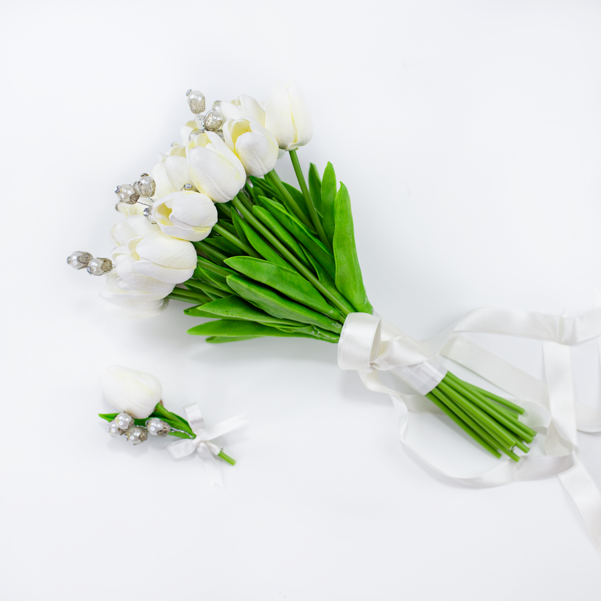 İnci ve gümüş detaylarla süslenen lale tasarımlı gelin buketi ve damat yaka iğnesi seti, söz, nişan, nikah, düğün ve kına organizasyonlarında zarif bir tamamlayıcıdır. Şık ve romantik görünümü sayesinde fotoğraf çekimlerinde estetik bir bütünlük sağlar, dekoratif yapısıyla hatıra olarak da uzun süre saklanabilir.