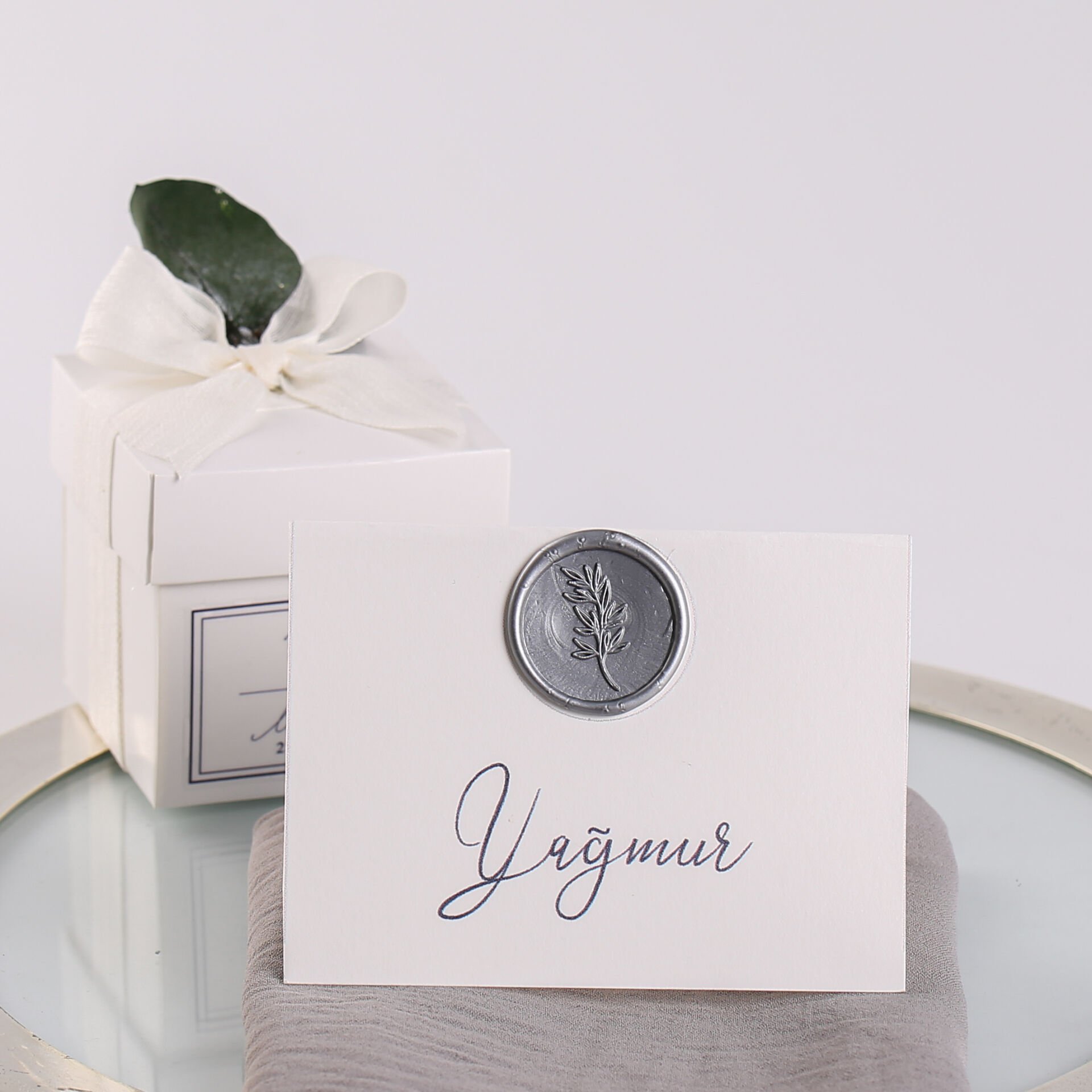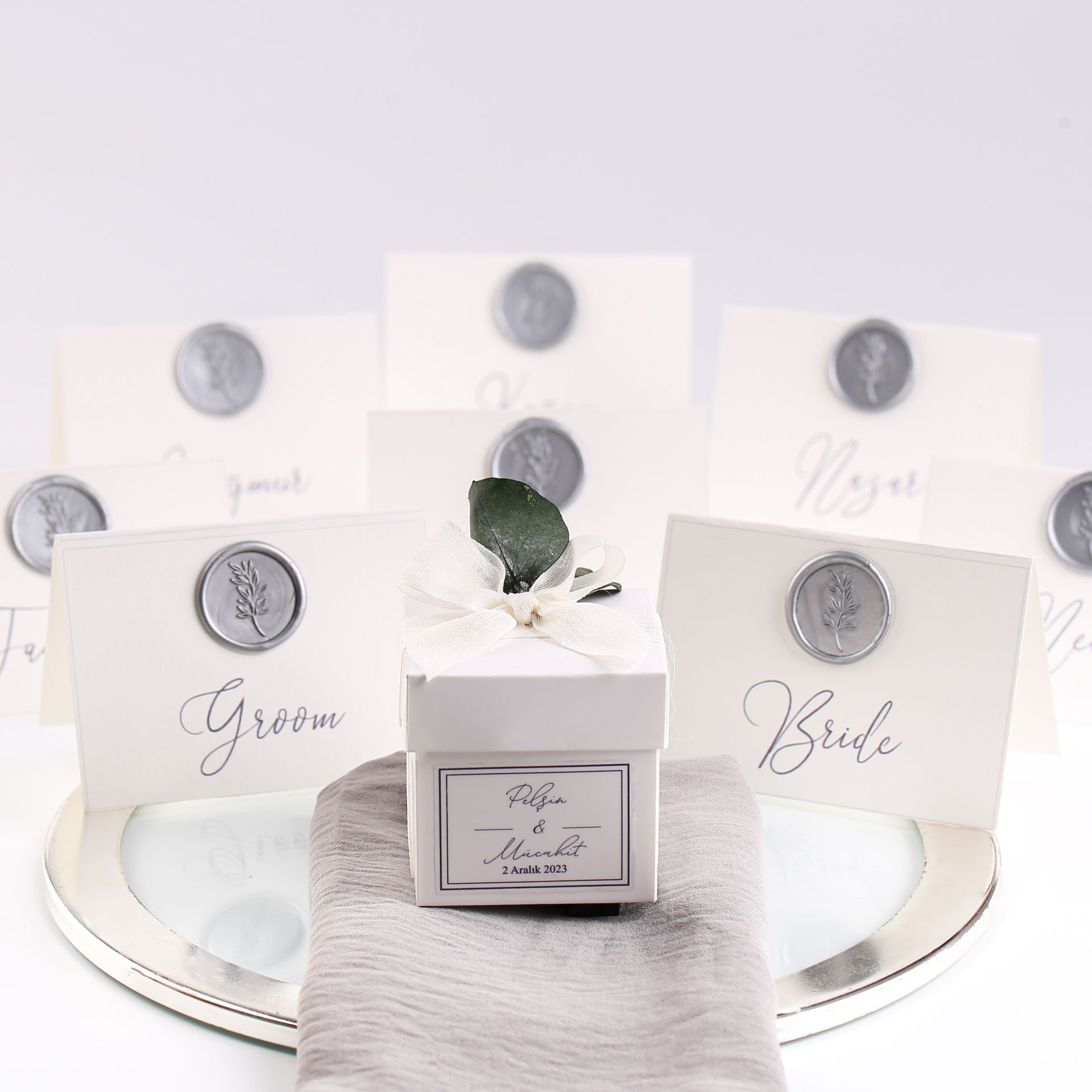 Mühür detaylarıyla hazırlanan isim kartları; söz, nişan, düğün, kına gecesi, nikah ve özel gün organizasyonlarında masa düzenini tamamlayan şık ve kişiye özel bir detay olarak tercih edilebilir. Zarif tasarımı sayesinde konsept bütünlüğü sağlar ve davetliler için estetik bir karşılama unsuru oluşturur.