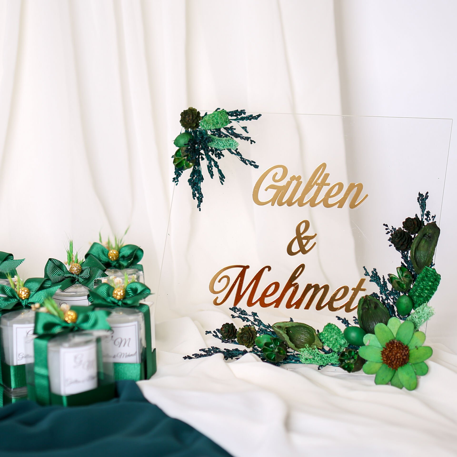 İsimlik çerçeve, masa üstü kullanım için ideal olan 25 x 23 cm boyutlarında şık bir üründür. Yeşil rengi, doğal ve ferah bir hava katarak düğün, nişan, kına gecesi gibi özel organizasyonlarda zarif bir detay sunar. Hem işlevsel hem de dekoratif olarak kullanılabilir.