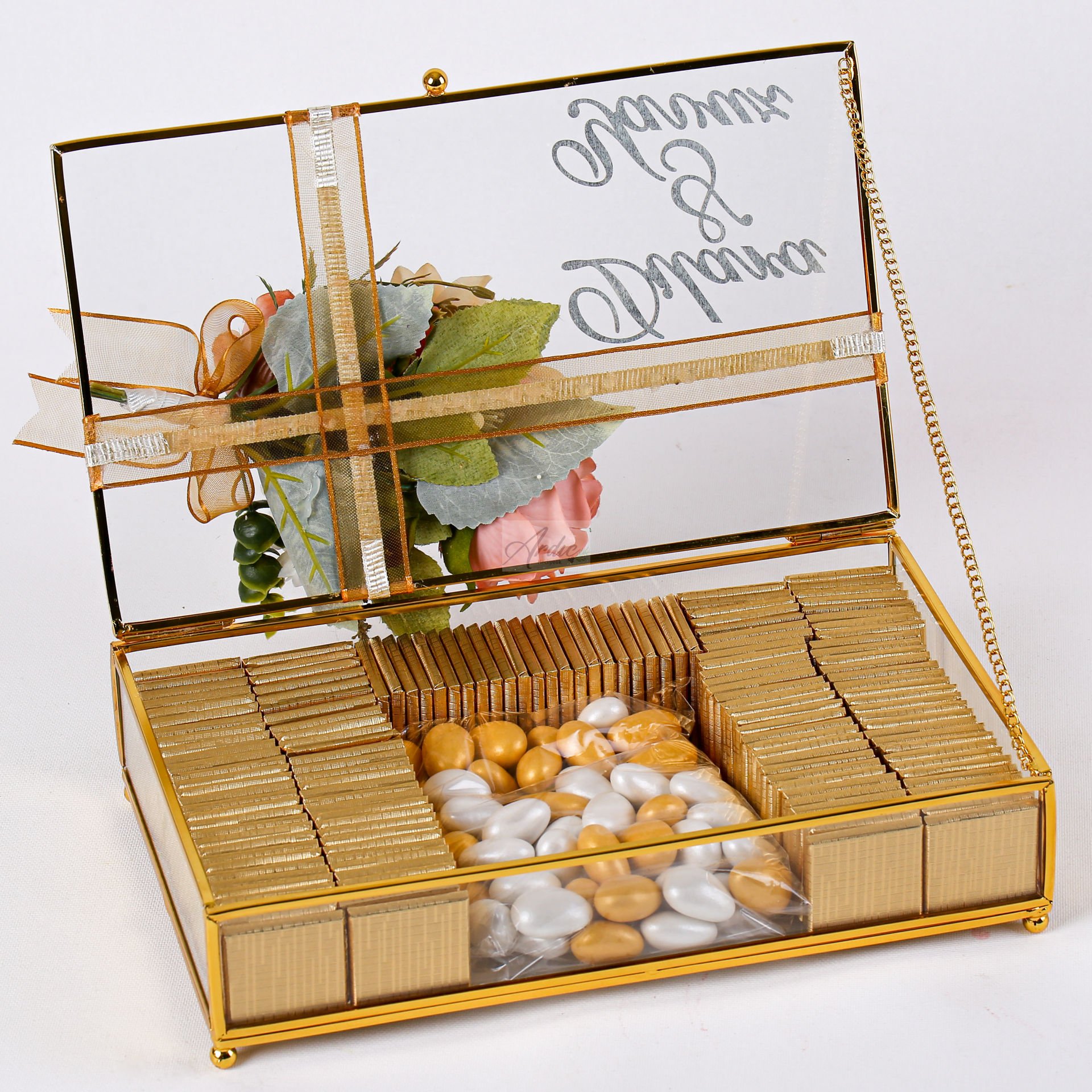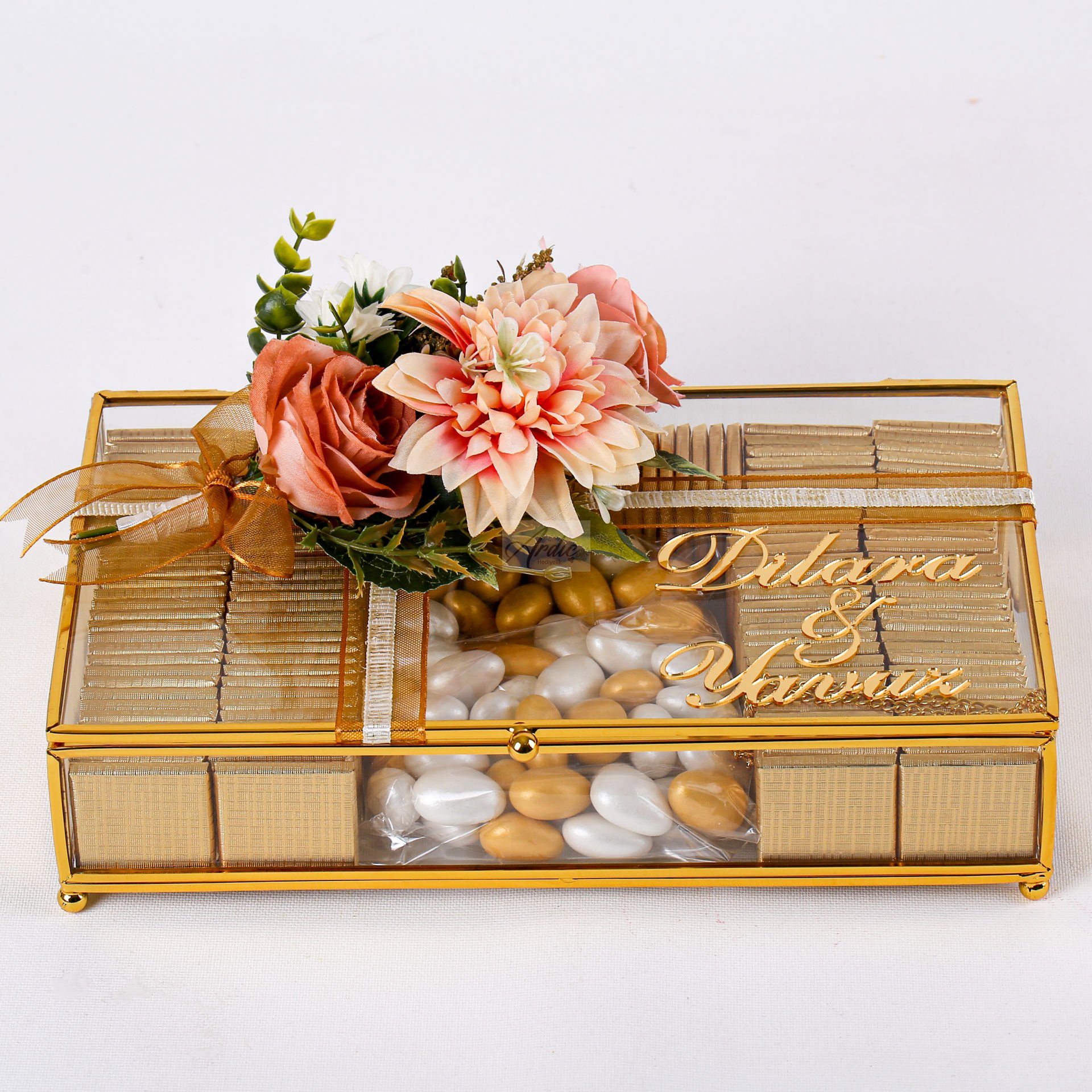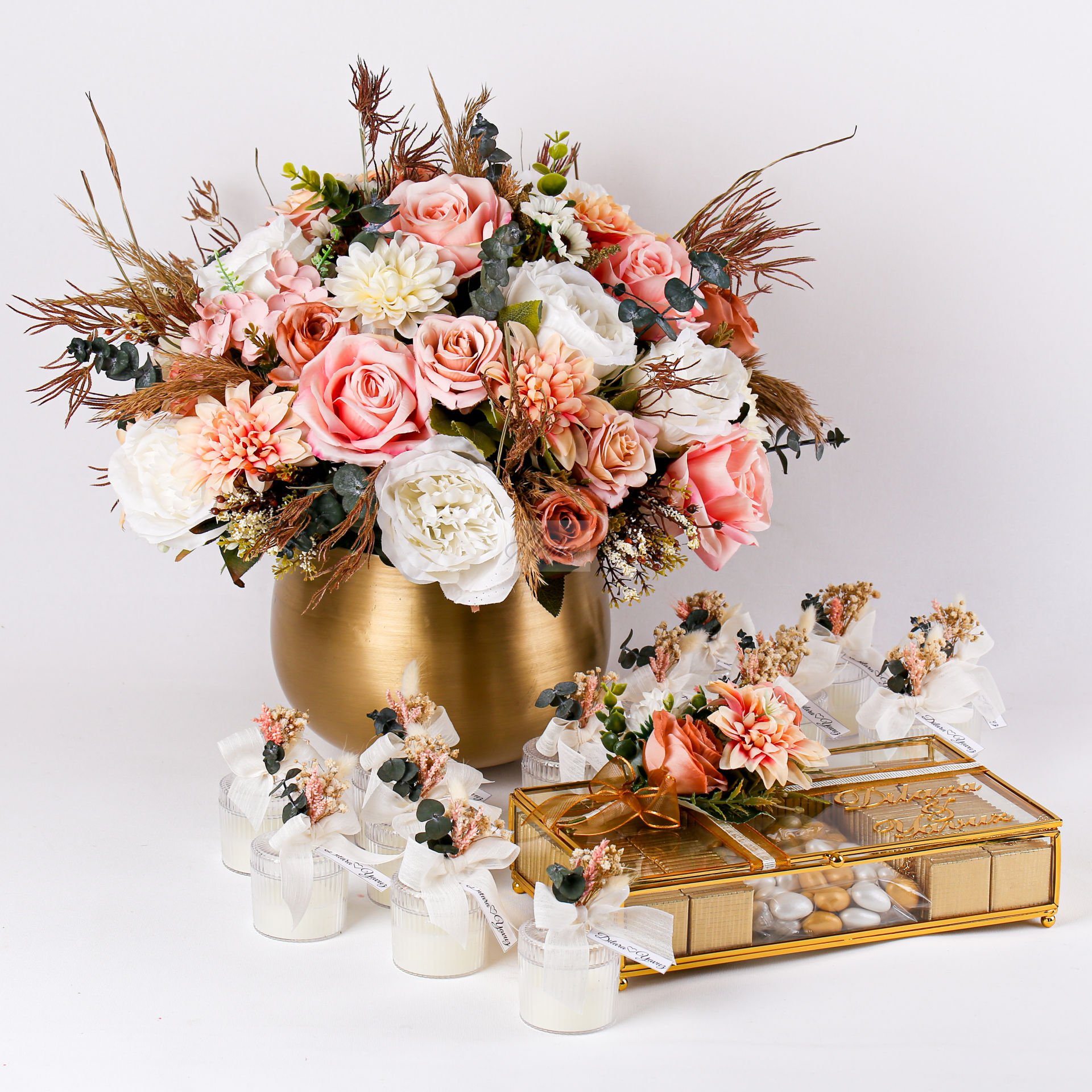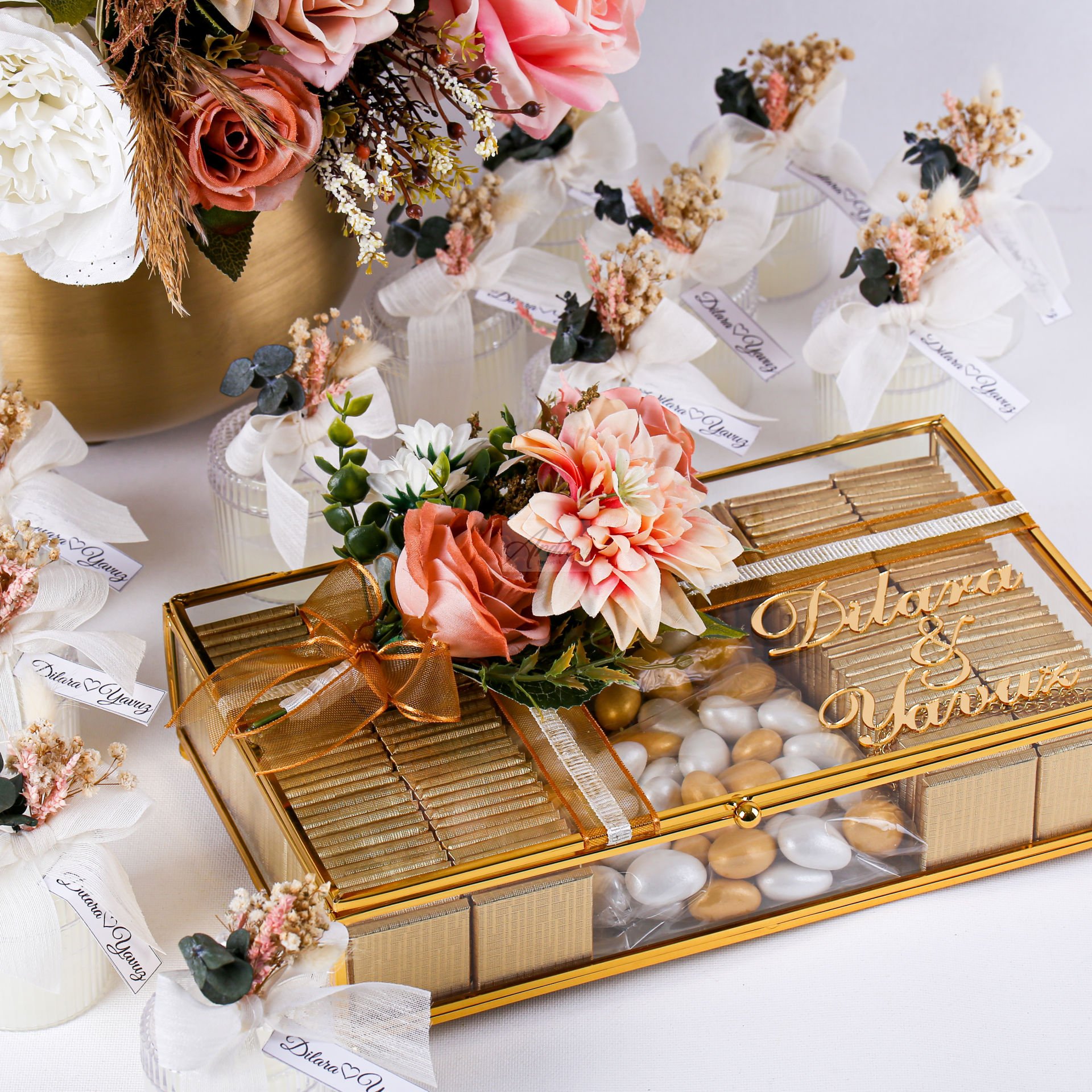 Zarif renk uyumu ve şık sunumuyla hazırlanan isteme çiçek – çikolata seti, söz ve nişan organizasyonlarınızda prestijli bir sunum oluşturur. Pembe beyaz gül ve kasımpatı çiçek buketi, romantik ve estetik görünümüyle dikkat çekerken, cam kutu içerisinde sunulan isteme çikolatası ve draje ile set tamamlanır. İsteme çiçeği, isteme çikolatası, söz nişan seti ve nişan organizasyon ürünleri arasında hem dekoratif hem ikramlık olarak tercih edilebilecek özel bir seçenektir. Özel günlerinizde şıklığı ve zarafeti bir arada sunar.