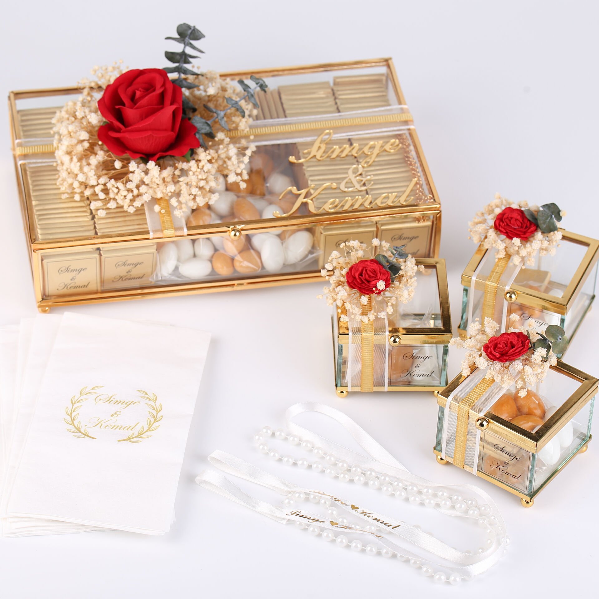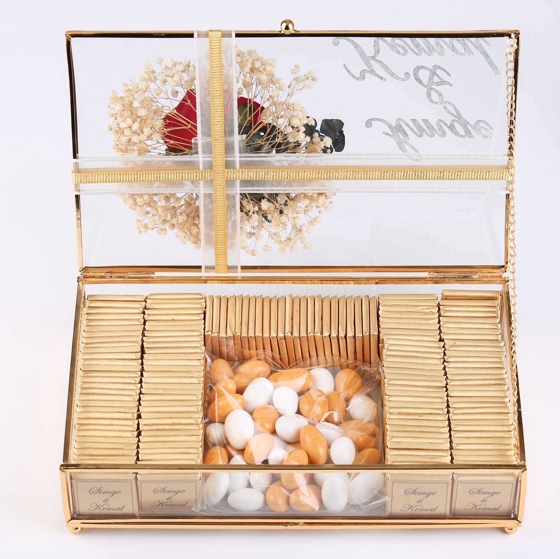 Kırmızı gül ve cipso süslemeleriyle zarif bir şekilde hazırlanan isteme, söz ve nişan çikolatası; özel günlerinizde şık sunumuyla dikkat çeken ve misafirlerinize ikram edebileceğiniz anlamlı bir seçenektir. Estetik tasarımı sayesinde hem ikramlık olarak sunulabilir hem de hatıra olarak saklanabilir. Organizasyon konseptinize uyum sağlayan şık detaylarla hazırlanır.