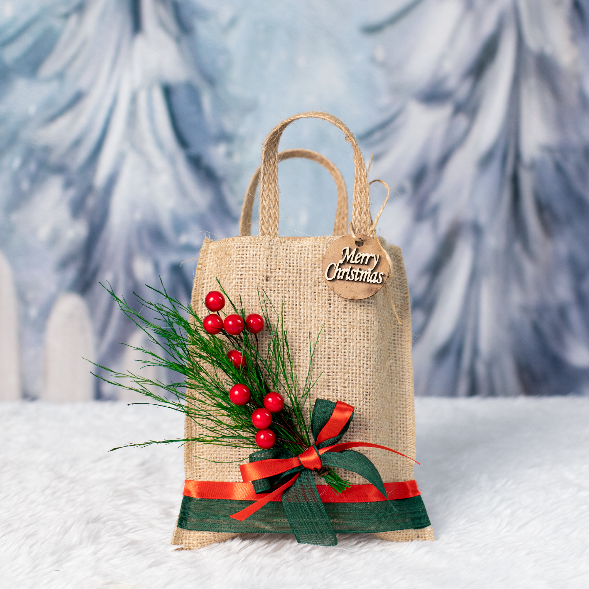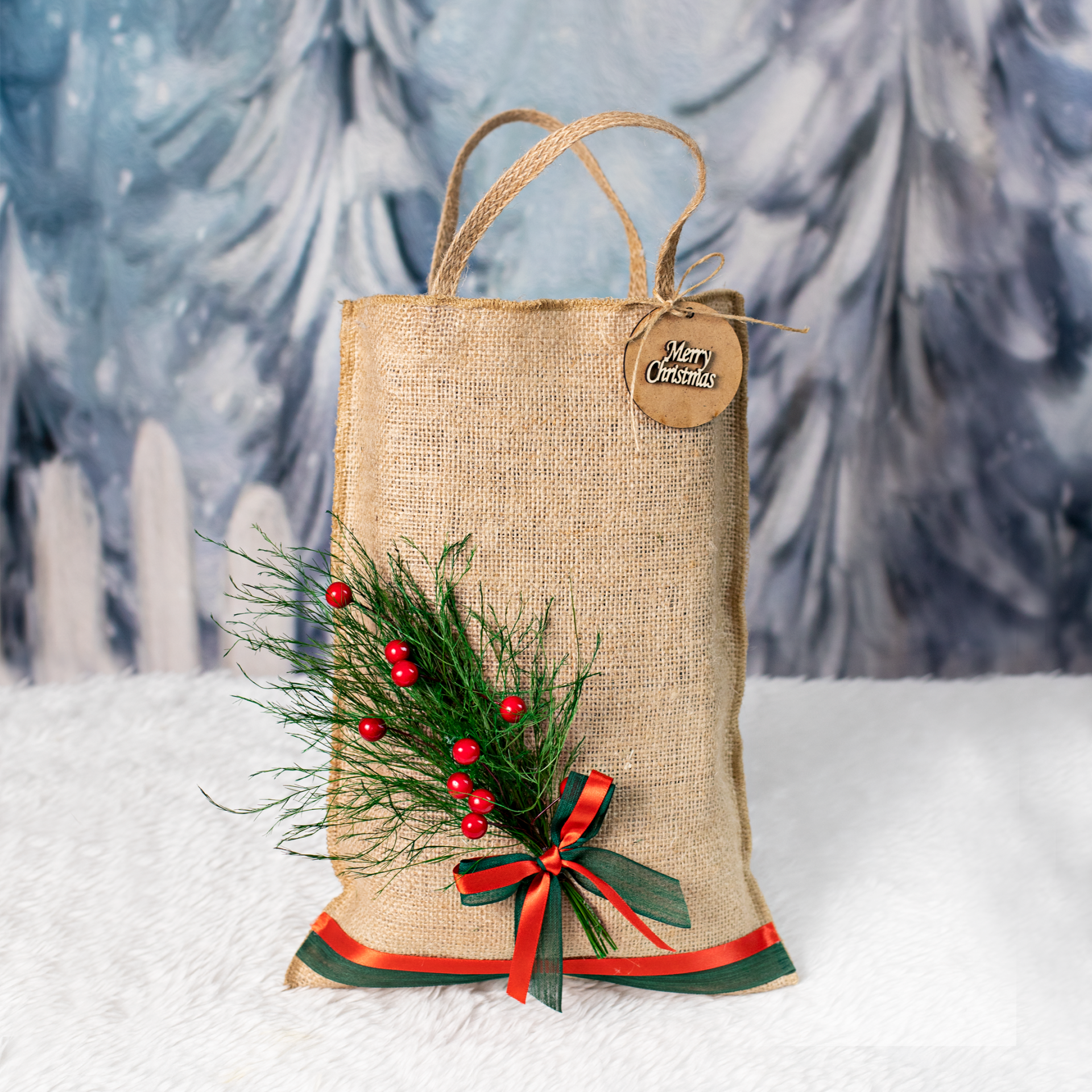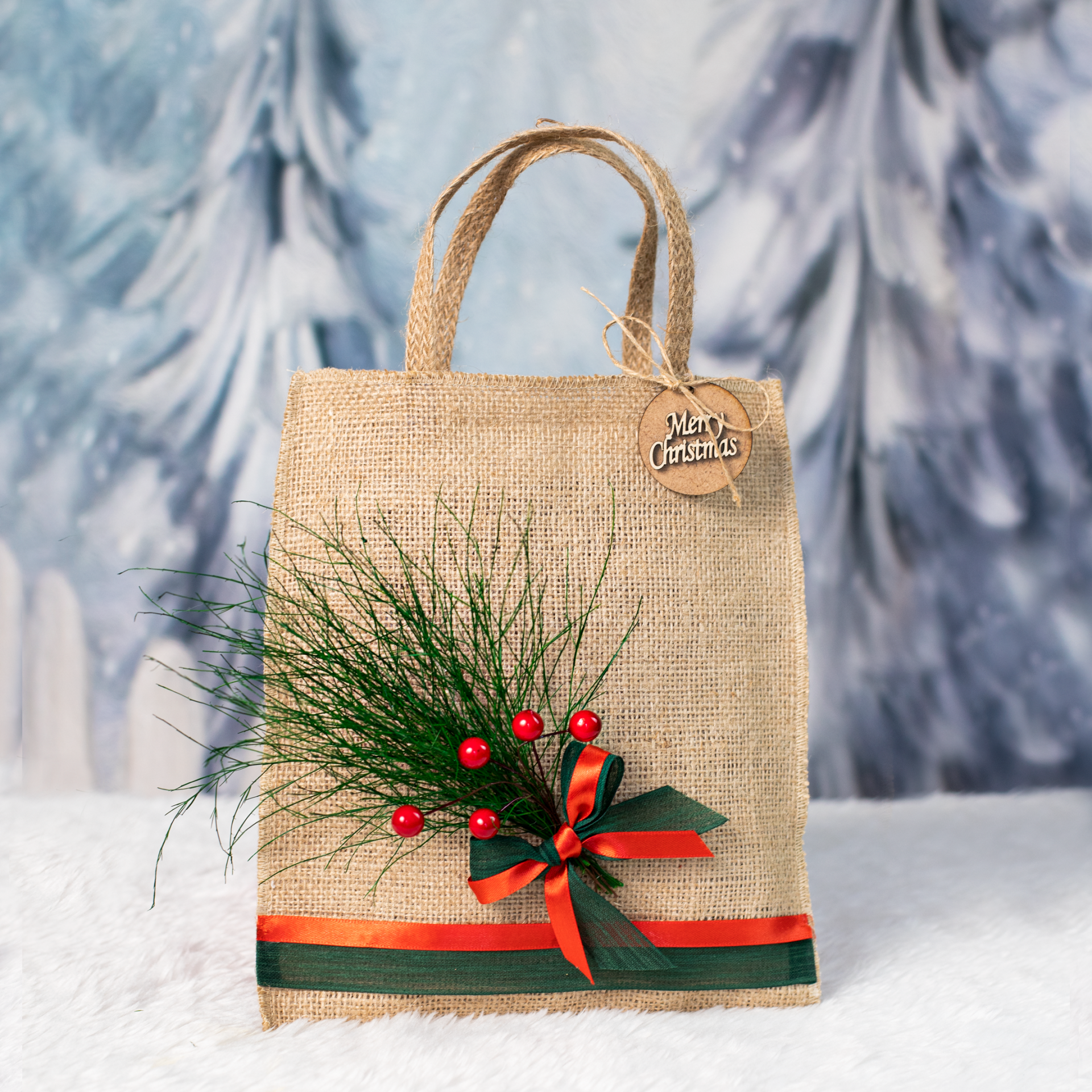 Yapay kokina detayı sayesinde yılbaşı konseptine uyum sağlar ve doğal bir görünüm sunar. %100 el yapımı jüt çanta, hem hediye sunumu hem de günlük kullanım için değerlendirilebilir. Yeni yıl hediye paketi hazırlamak isteyenler için şık ve kullanışlı bir alternatiftir.