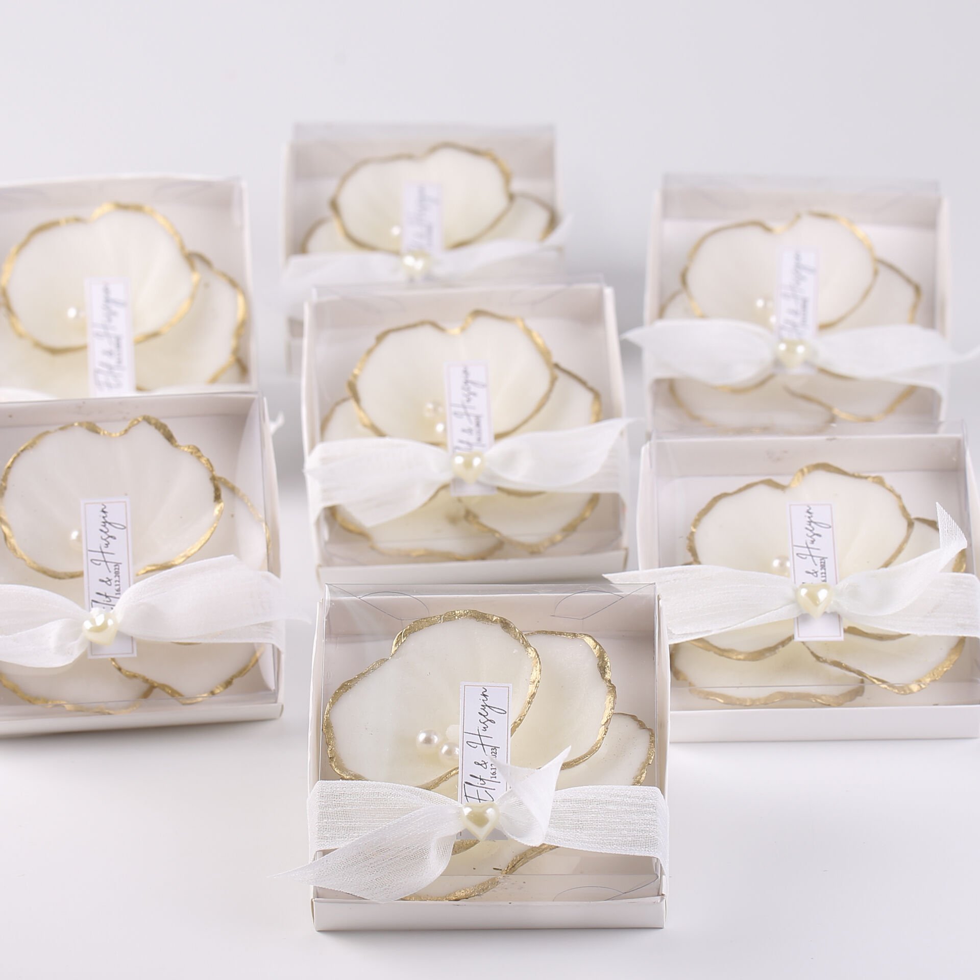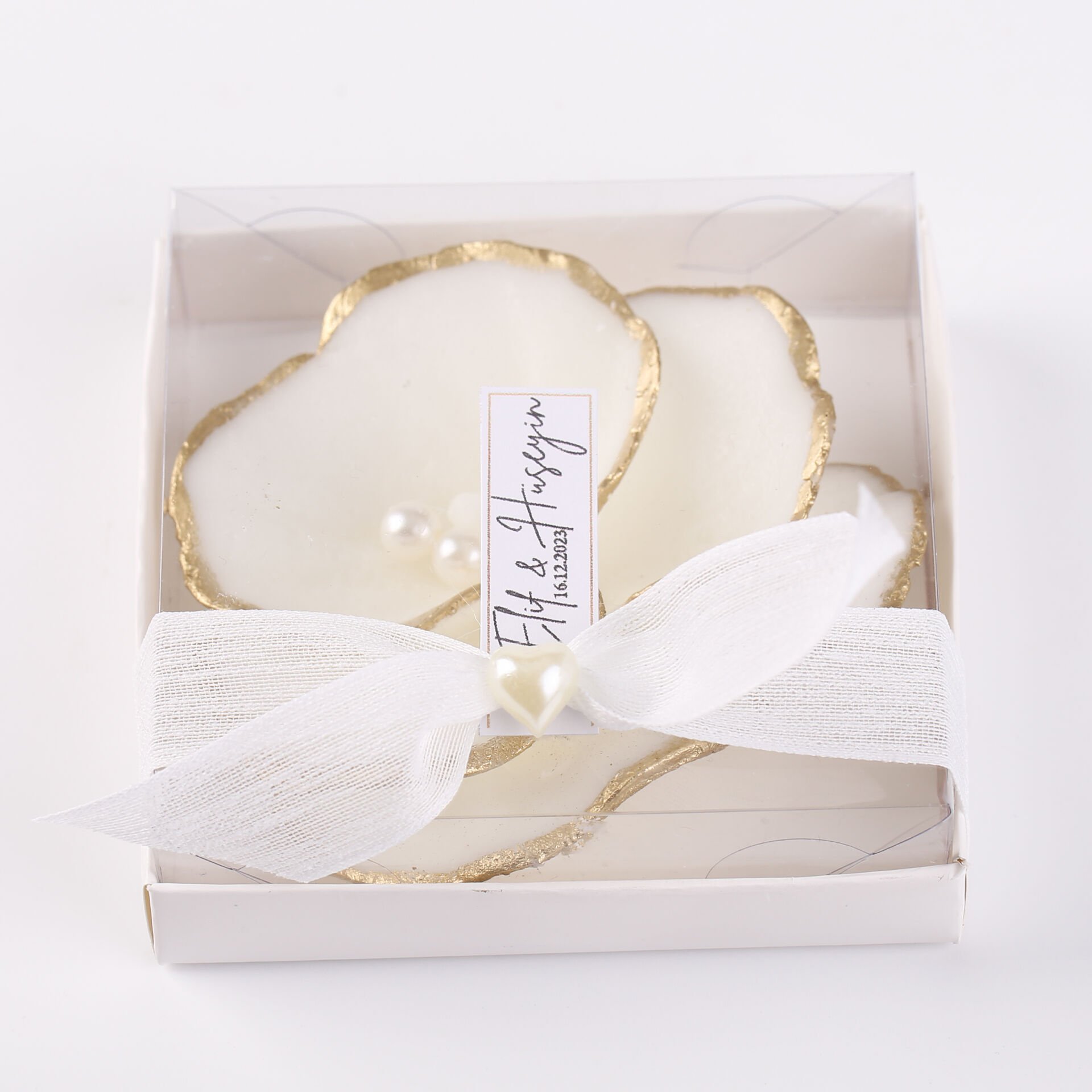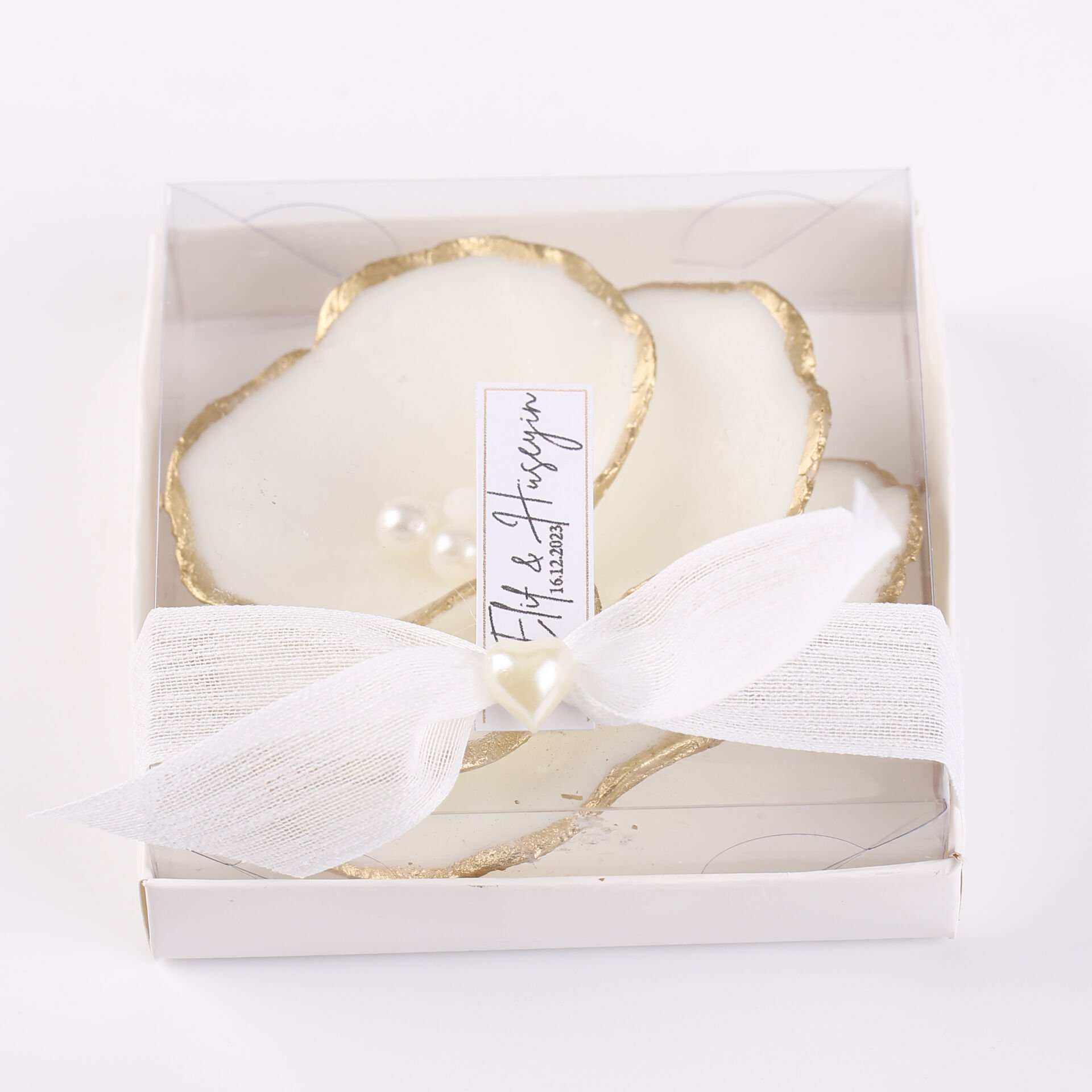 Asetat kutu içinde sunulan kalpli incili orkide mum; zarif ve romantik tasarımıyla söz, nişan, düğün, nikah, kına gecesi, mevlit, baby shower, doğum günü ve özel gün organizasyonlarında misafirlere verilebilecek şık bir hediyelik alternatiftir. İnci ve gold detayları sayesinde hem dekoratif bir hatıra olarak saklanabilir hem de bulunduğu ortama estetik bir görünüm katar.
