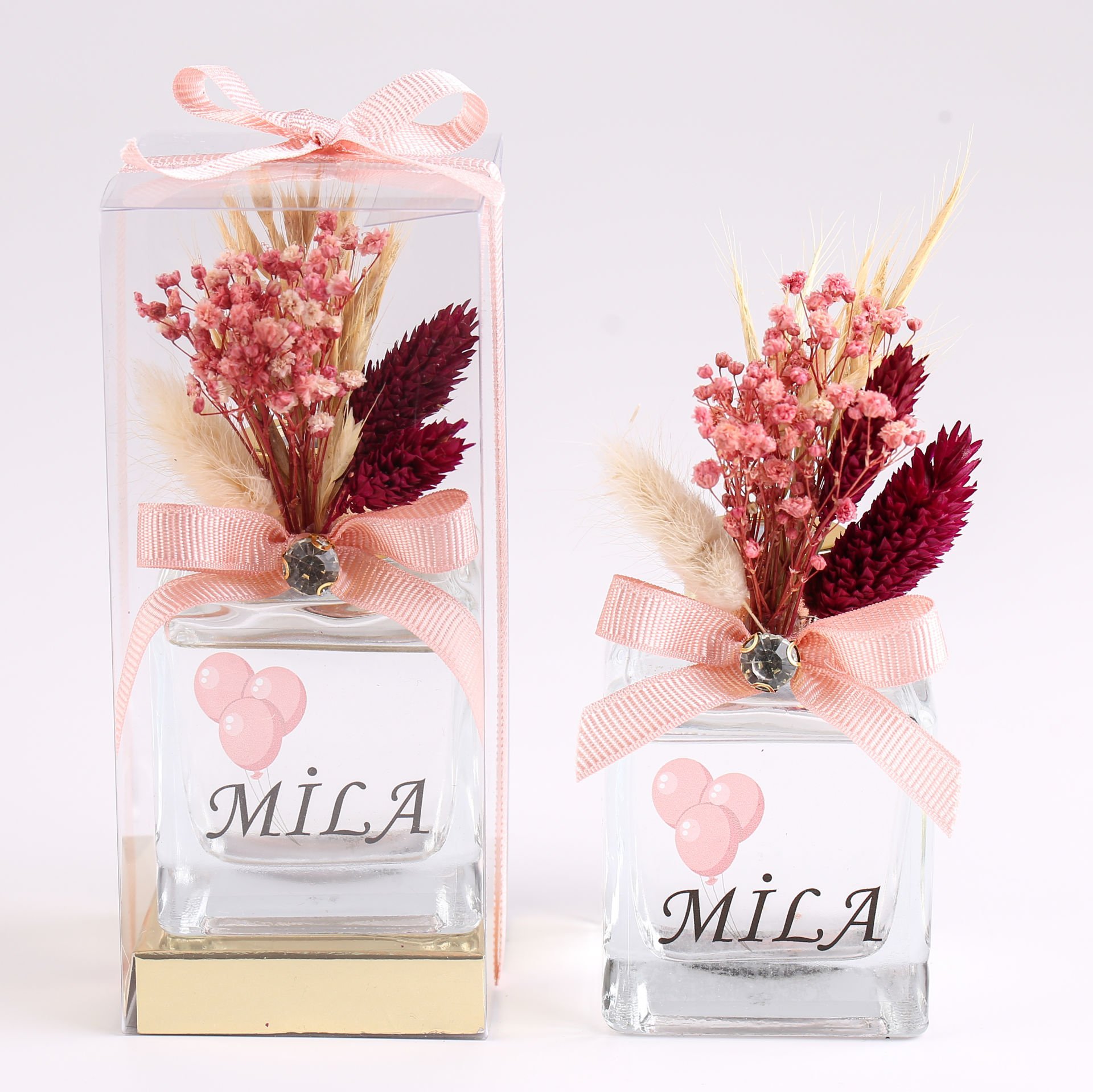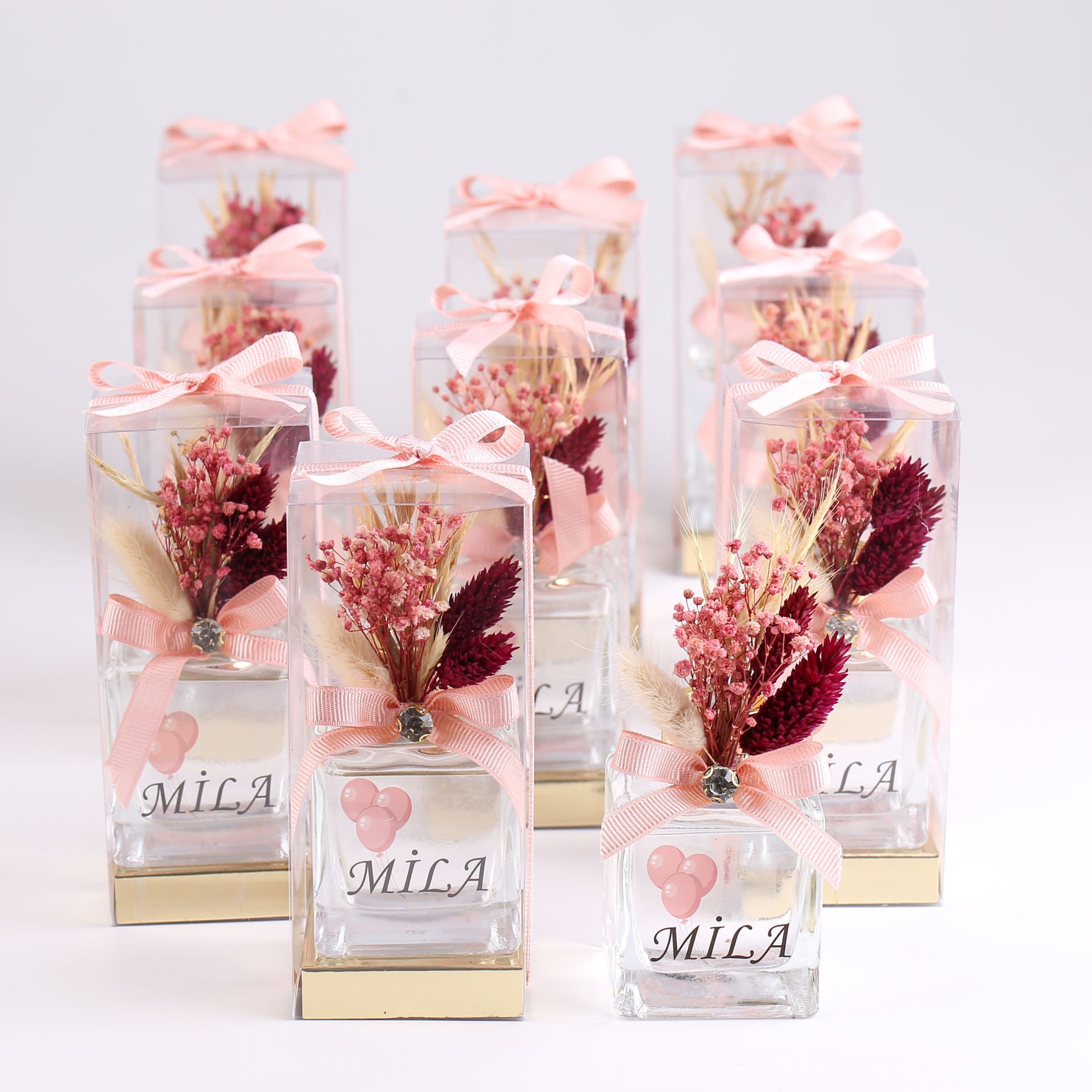 Kare cam şişede hazırlanan oda kokusu; pembe konsepti, yükselticili asetat kutu sunumu ve şık kapak detaylarıyla zarif bir hediyelik alternatifi sunar. Söz, nişan, nikah, düğün, kına, mevlit, baby shower ve özel davetlerde dağıtılabilir, yaşam alanlarında hoş koku sağlarken dekoratif amaçla da kullanılabilir. İçerik tercihinize göre esans & su karışımlı veya orijinal oda kokusu seçeneği mevcuttur.