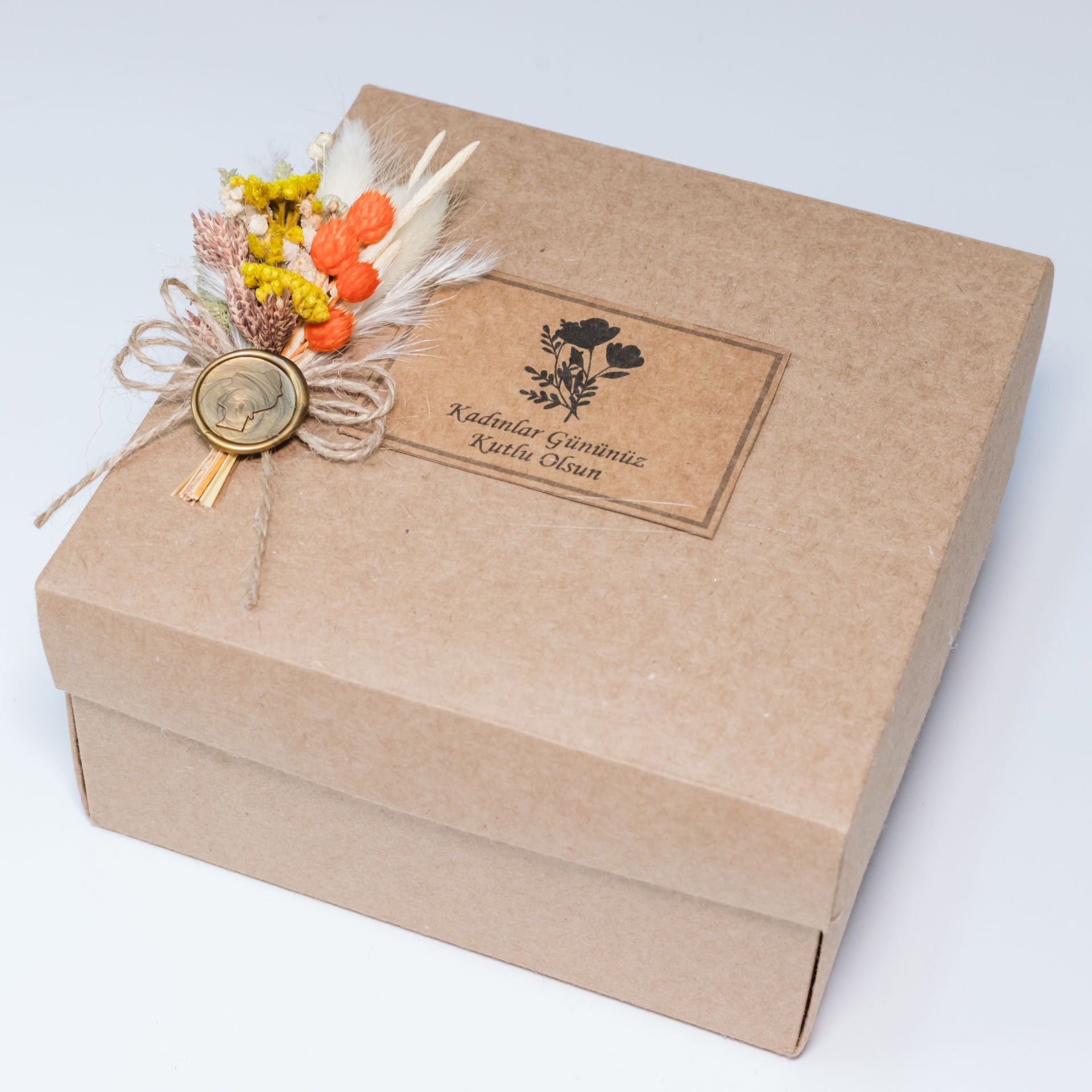 20x20 cm ölçülerindeki bu kraft kutu, Kadınlar Gününe özel süslemeleri ve zarif mühür detayıyla hediyelerinizi şık bir şekilde sunmanızı sağlar. İçinin boş olması sayesinde farklı hediyeleri yerleştirebilir, kendi özel dokunuşlarınızla hazırlayabilirsiniz. Minimal ve estetik tasarımıyla hem şık hem pratik bir sunum alternatifi sunan bu kutu, sevdiklerinize değer verdiğinizi gösterecek güzel bir Kadınlar Günü hediyesi sunum aracıdır.