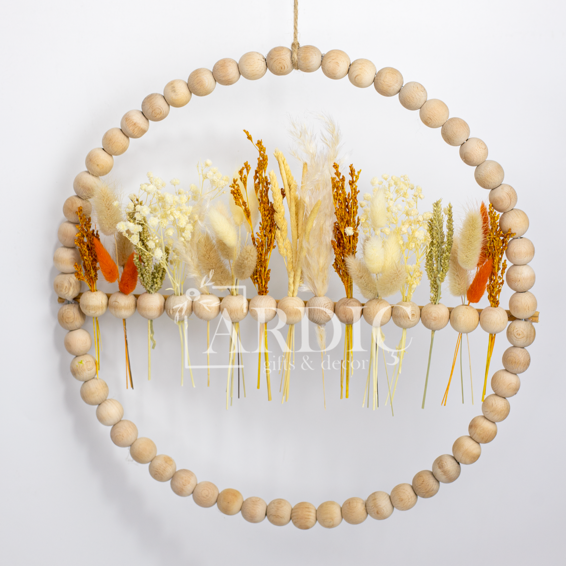 · Kuru otlu ahşap boncuklu kapı süsü (28 × 28 cm)