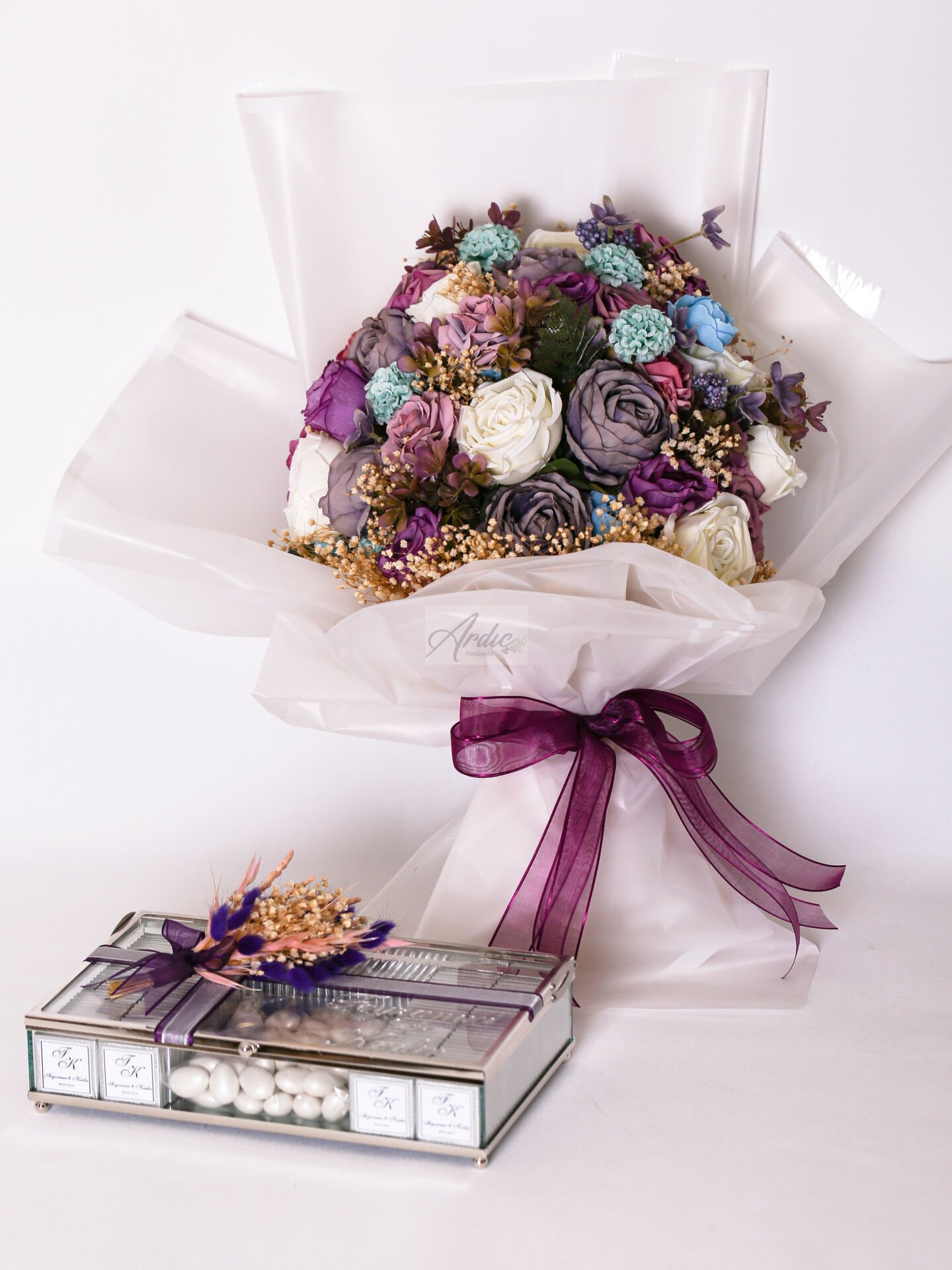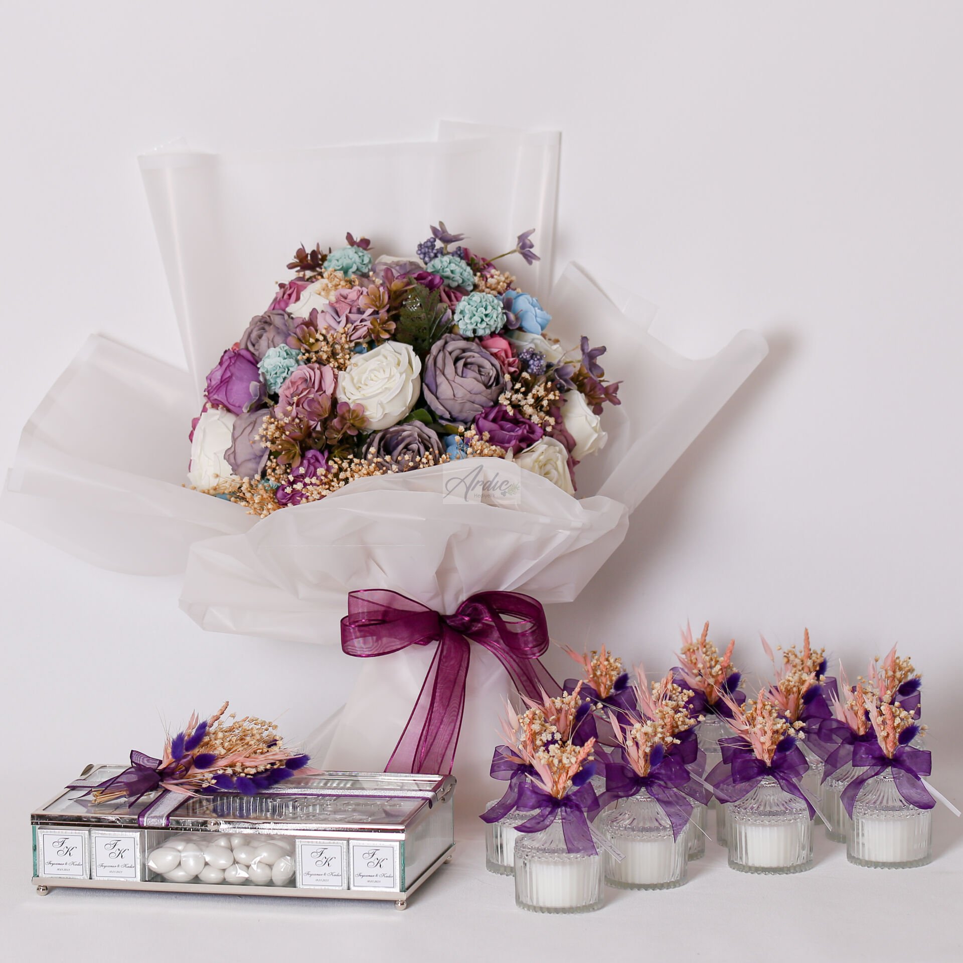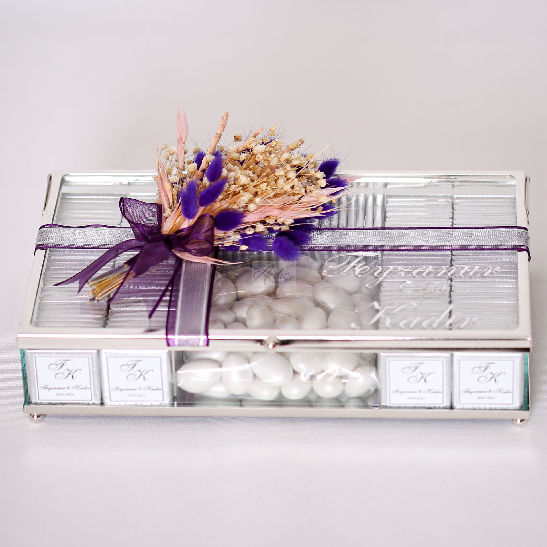Romantik renk tonları ve zarif detaylarıyla hazırlanan lila mor isteme seti, söz ve nişan organizasyonlarınızda şık ve uyumlu bir sunum oluşturur. Lila ve mor tonlarında isteme çiçeği, estetik görünümüyle dikkat çekerken, gümüş çerçeveli cam kutu içerisinde sunulan isteme çikolatası ve badem draje ile set tamamlanır. İsteme çiçeği, isteme çikolatası, söz nişan seti ve nişan organizasyon ürünleri arasında hem dekoratif hem ikramlık olarak tercih edilebilecek zarif bir alternatiftir. Özel günlerinizde konseptinize uyum sağlayan şık bir sunum sunar.