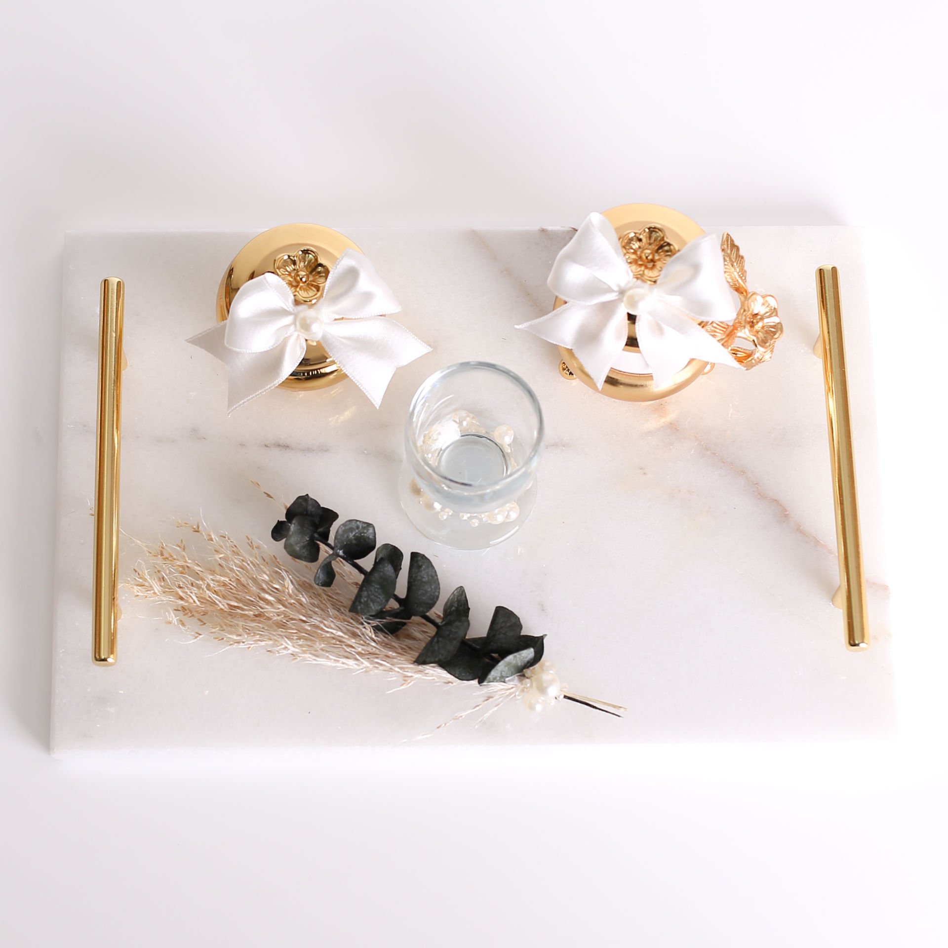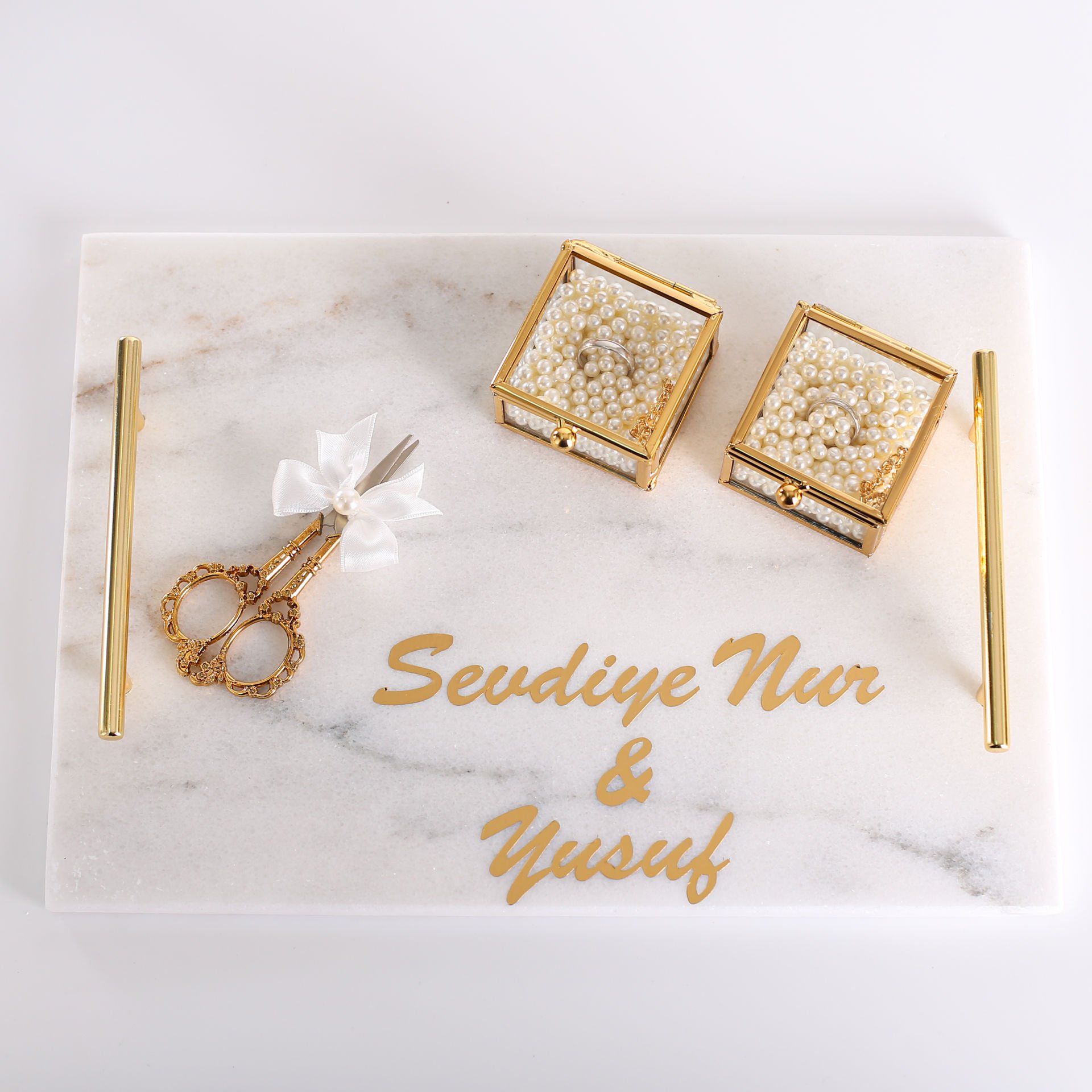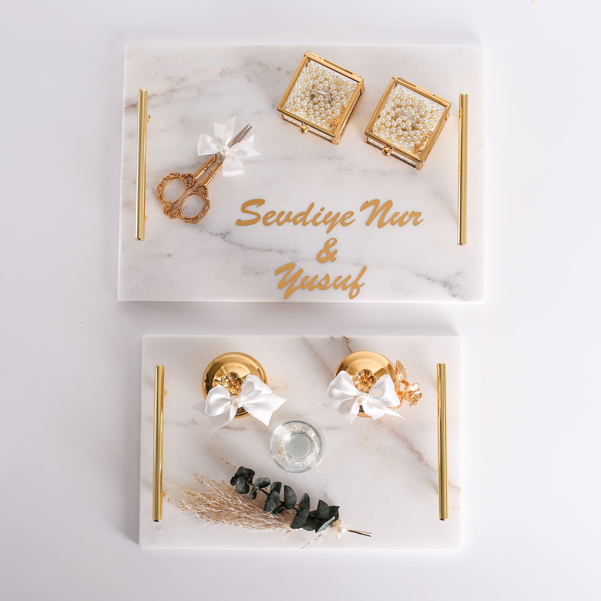 Gold veya gümüş detay seçenekleriyle hazırlanan mermer söz ve nişan tepsi seti; isteme, söz ve nişan törenlerinde gerekli sunumları şık ve uyumlu şekilde tamamlayan özel bir settir. Zarif mermer görünümü sayesinde organizasyon konseptine estetik bir dokunuş katar ve özel gün hatırası olarak uzun yıllar saklanabilir.