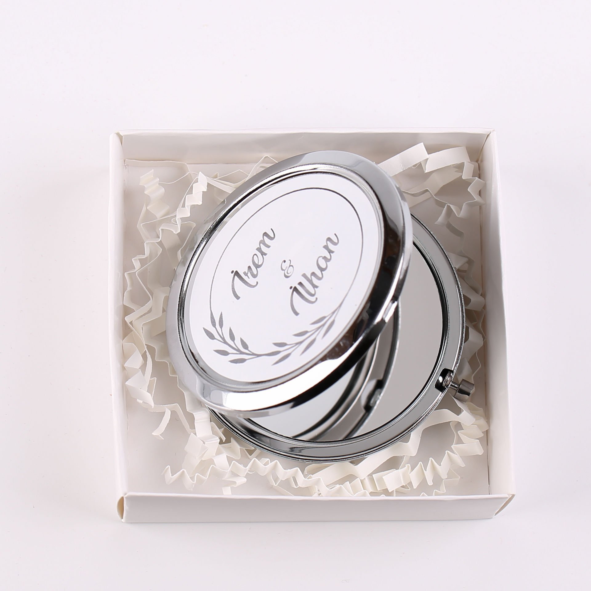 Gümüş renk metal çerçeveli ayna, taş ve simli kurdele süslemeleriyle hazırlanan zarif tasarımıyla söz, nişan, düğün, kına gecesi, nikah, mevlit, baby shower ve özel gün organizasyonlarında misafirlere verilebilecek şık ve kullanışlı bir hediyelik alternatiftir. Estetik kutu sunumu sayesinde dekoratif bir görünüm oluşturur ve özel günlerden hatıra olarak saklanabilir.