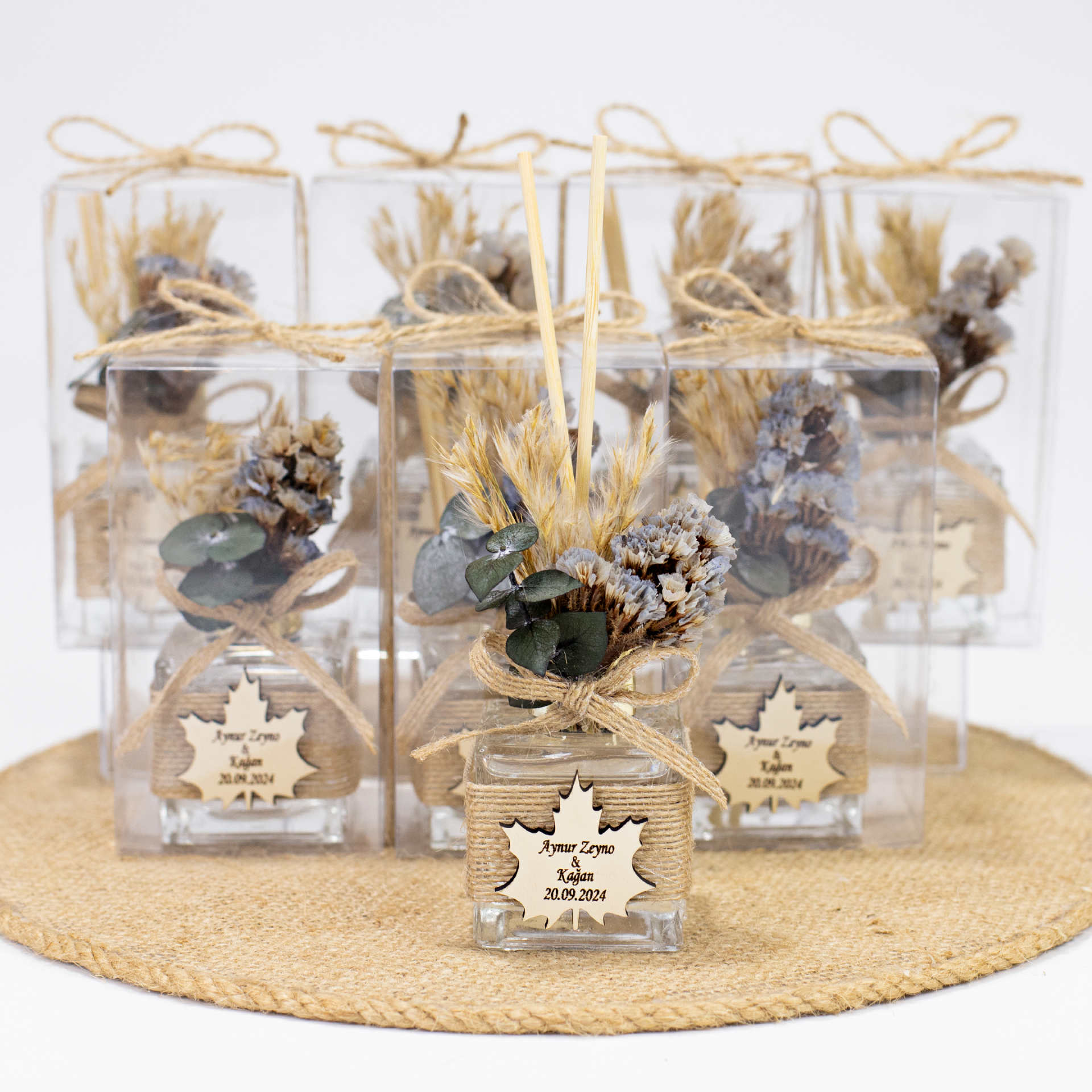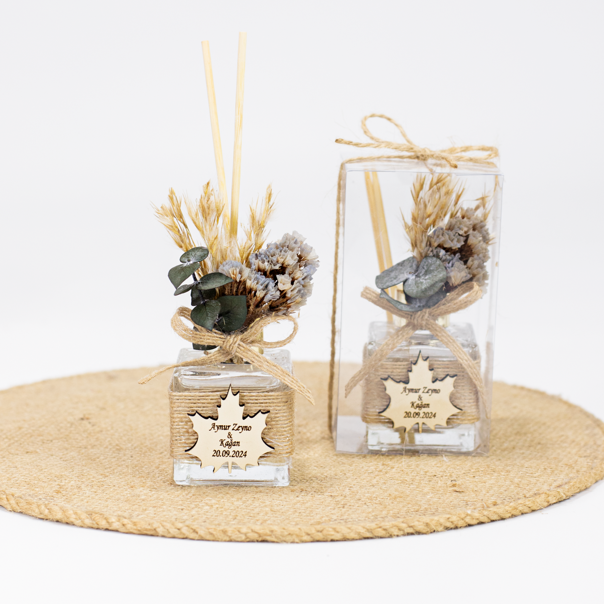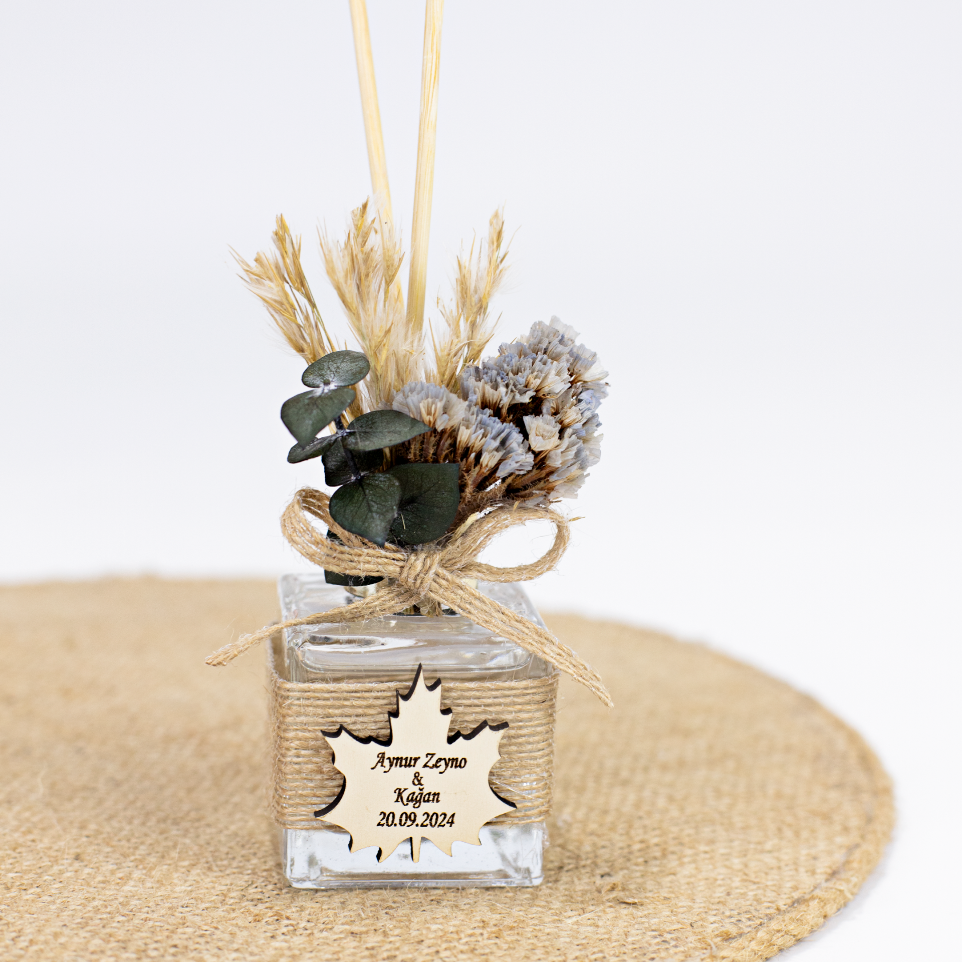 50 cc kare cam şişe içerisinde sunulan jüt ip süslemeli oda kokusu, doğal ve şık tasarımıyla hem dekoratif hem de hediye alternatifi olarak tercih edilebilir. Esanslı su karışımlı veya oda kokusu seçenekleri sayesinde farklı kullanım ihtiyaçlarına uyum sağlar. Ev dekorasyonunda hoş bir atmosfer oluşturmak, sevdiklerinize zarif bir hediye sunmak veya kız isteme, söz, nişan, kına, düğün ve nikah organizasyonlarında hediyelik olarak kullanmak için ideal bir seçenektir.