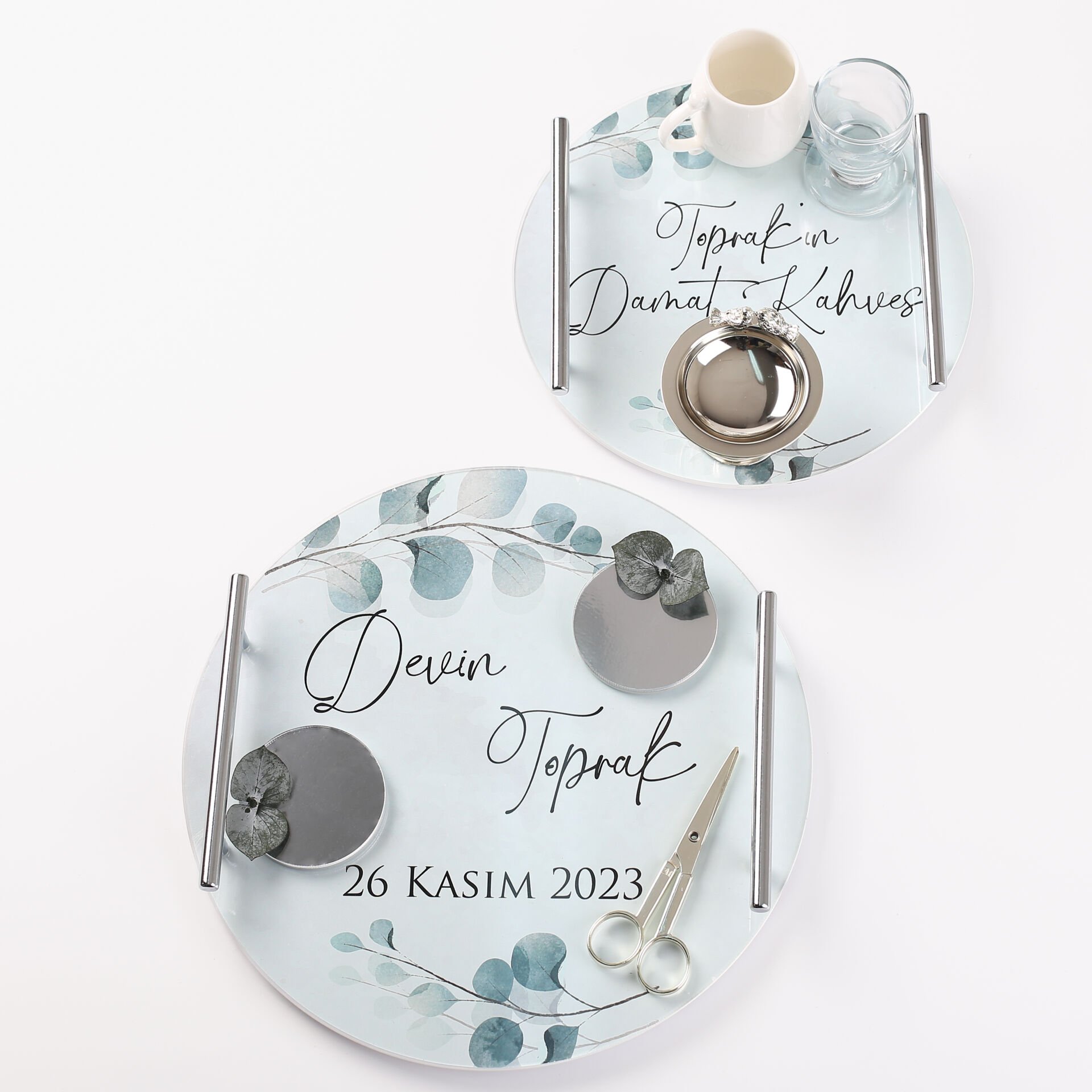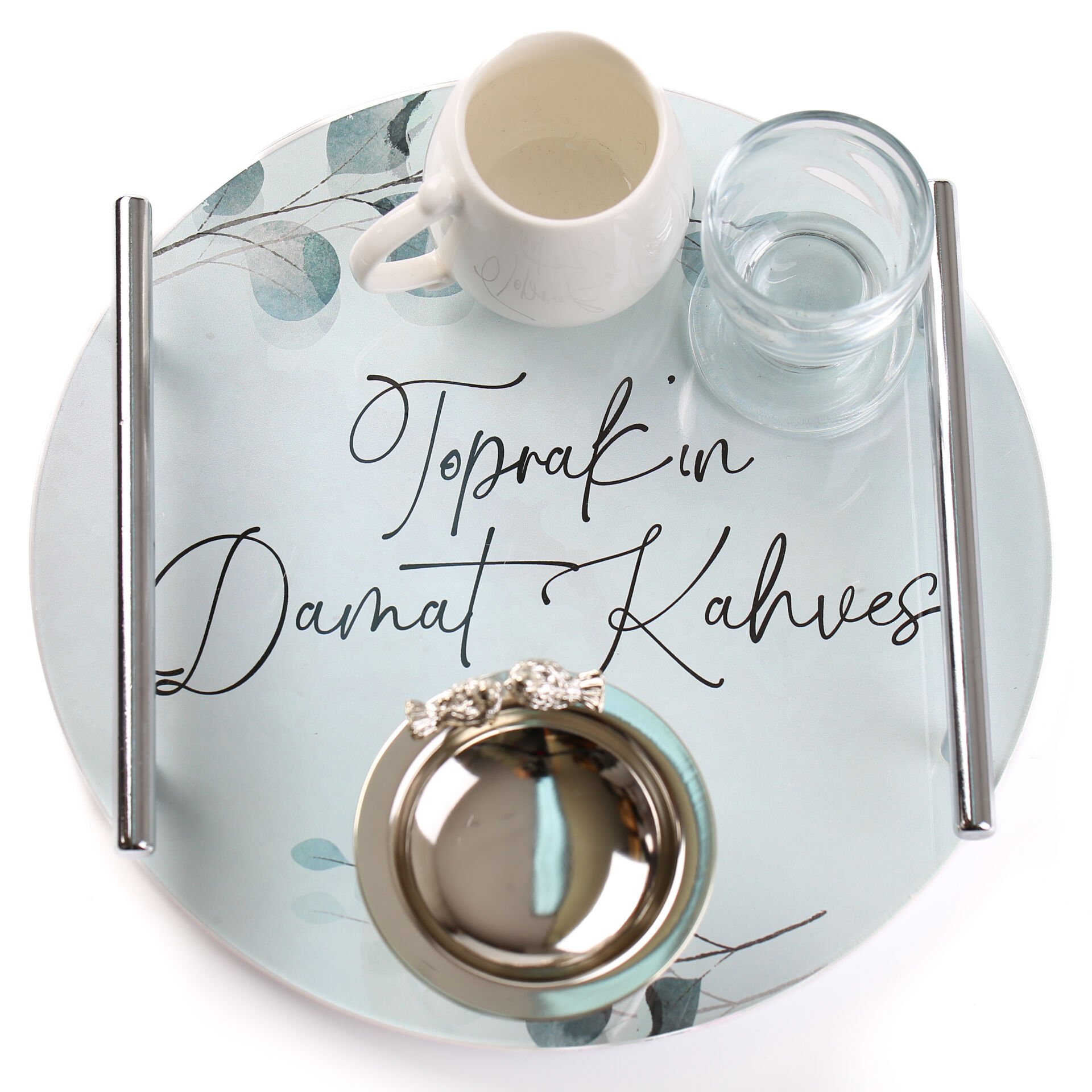 Bu şık ve zarif set, söz ve nişan organizasyonlarınızda mükemmel bir sunum için tasarlanmıştır. Damat kahvesi için küçük tepsi ve yanındaki aksesuarlar ile zarif bir ikram sunumu yapılırken, söz tepsisi setiyle de yüzük takma töreninizi anlamlı kılabilirsiniz. Her detay özenle seçilmiş olup, özel günlerinize estetik bir dokunuş katacaktır.