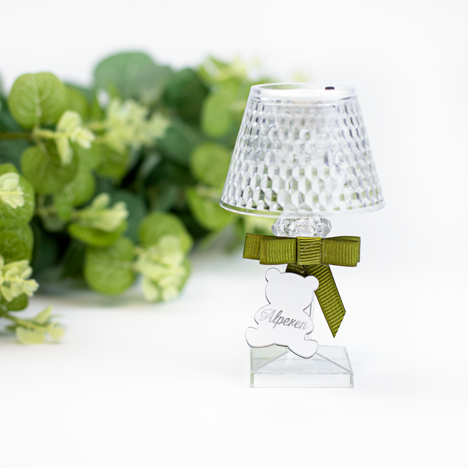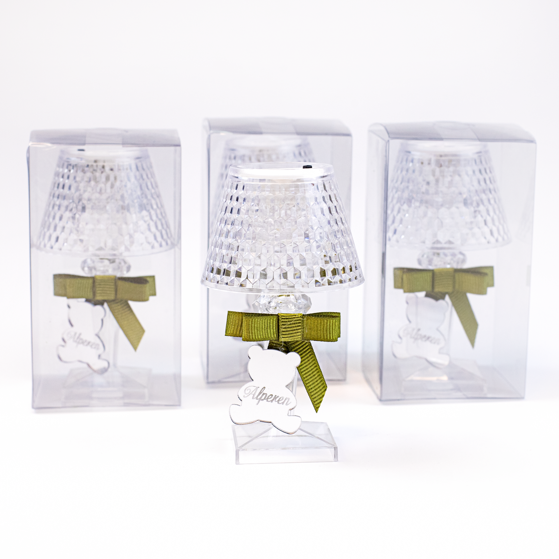 Asetat kutu içinde kurdele süslemeli ve etiket detaylı pilli mini abajur gece lambası; özellikle baby shower, yeni doğan, doğum günü, diş buğdayı, mevlit ve çocuk konseptli organizasyonlarda dağıtılabilecek sevimli ve kullanışlı bir hediyelik alternatifi sunar. Dekoratif tasarımı sayesinde çocuk odalarında gece lambası olarak kullanılabilir ve uzun süre hatıra olarak saklanabilir.