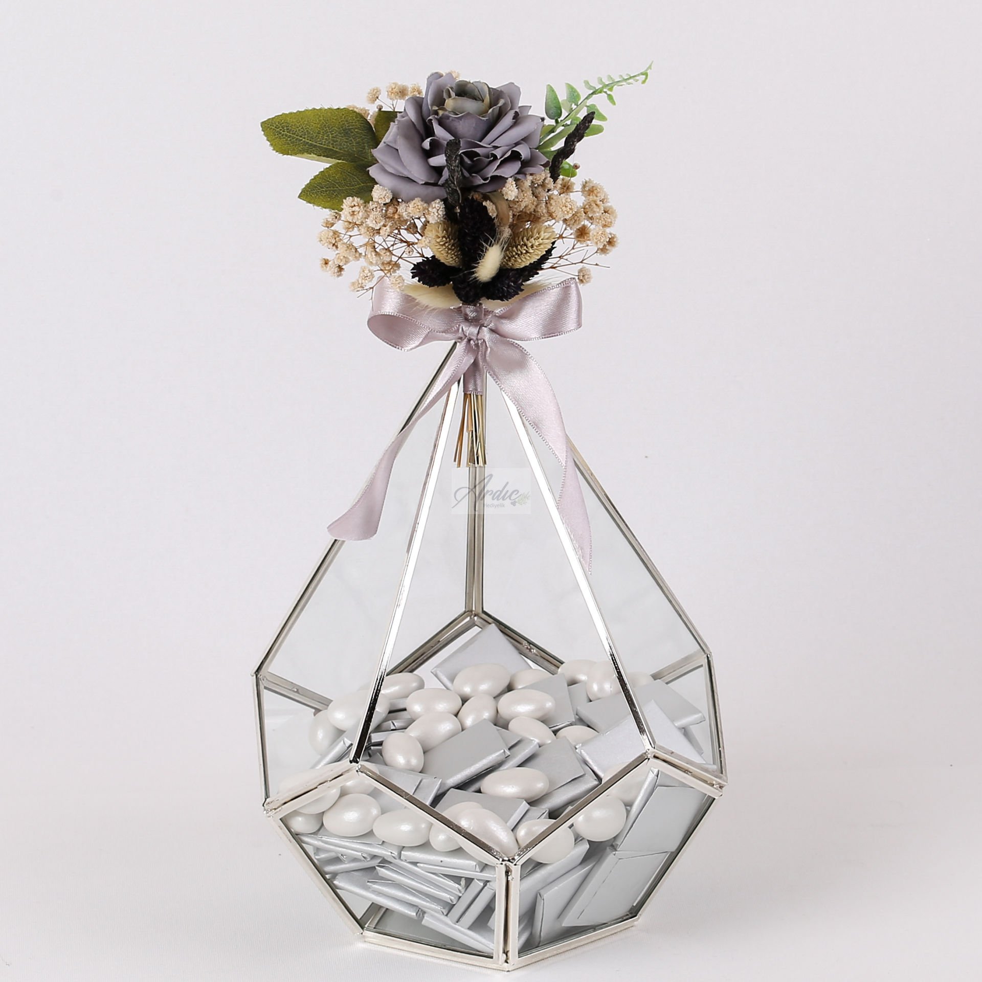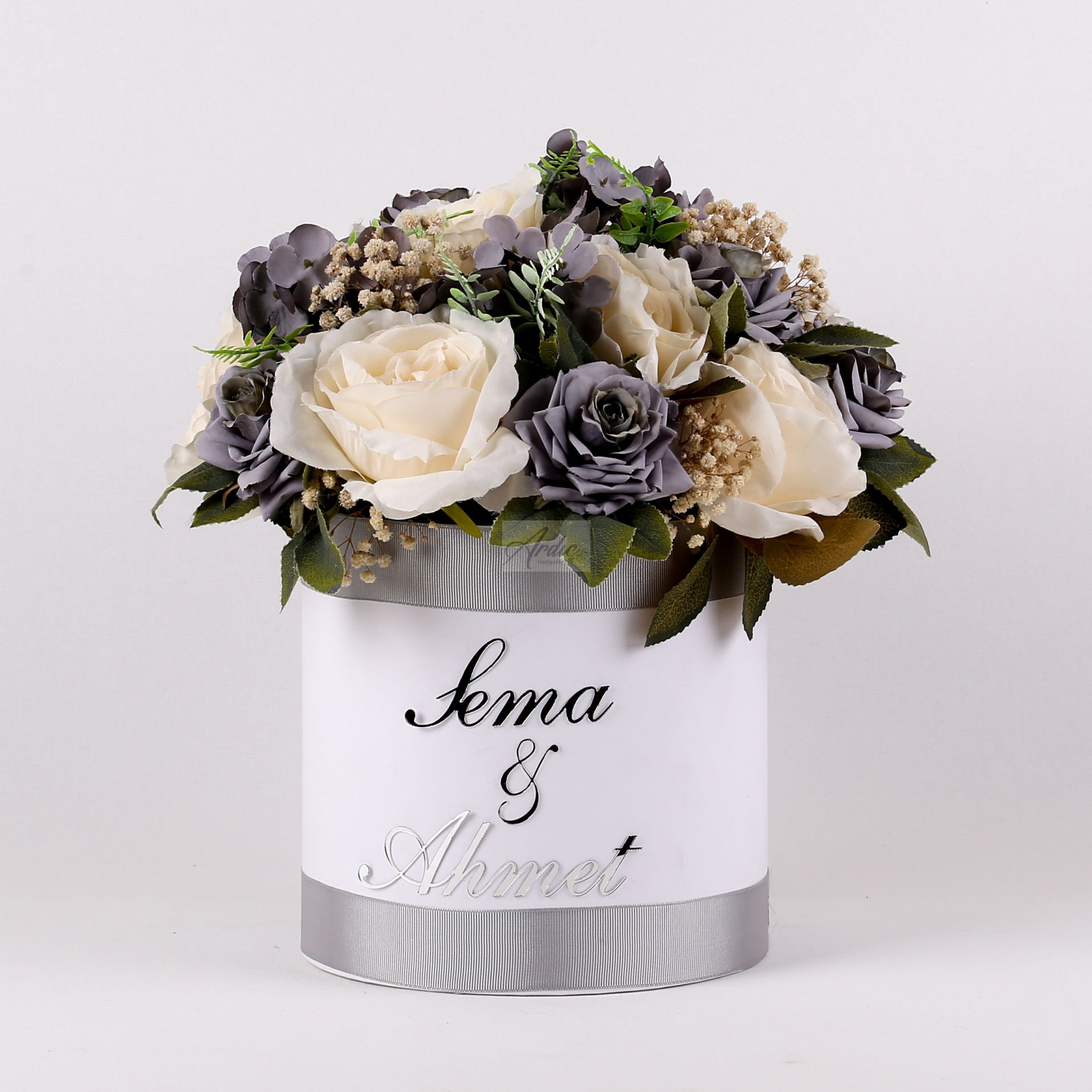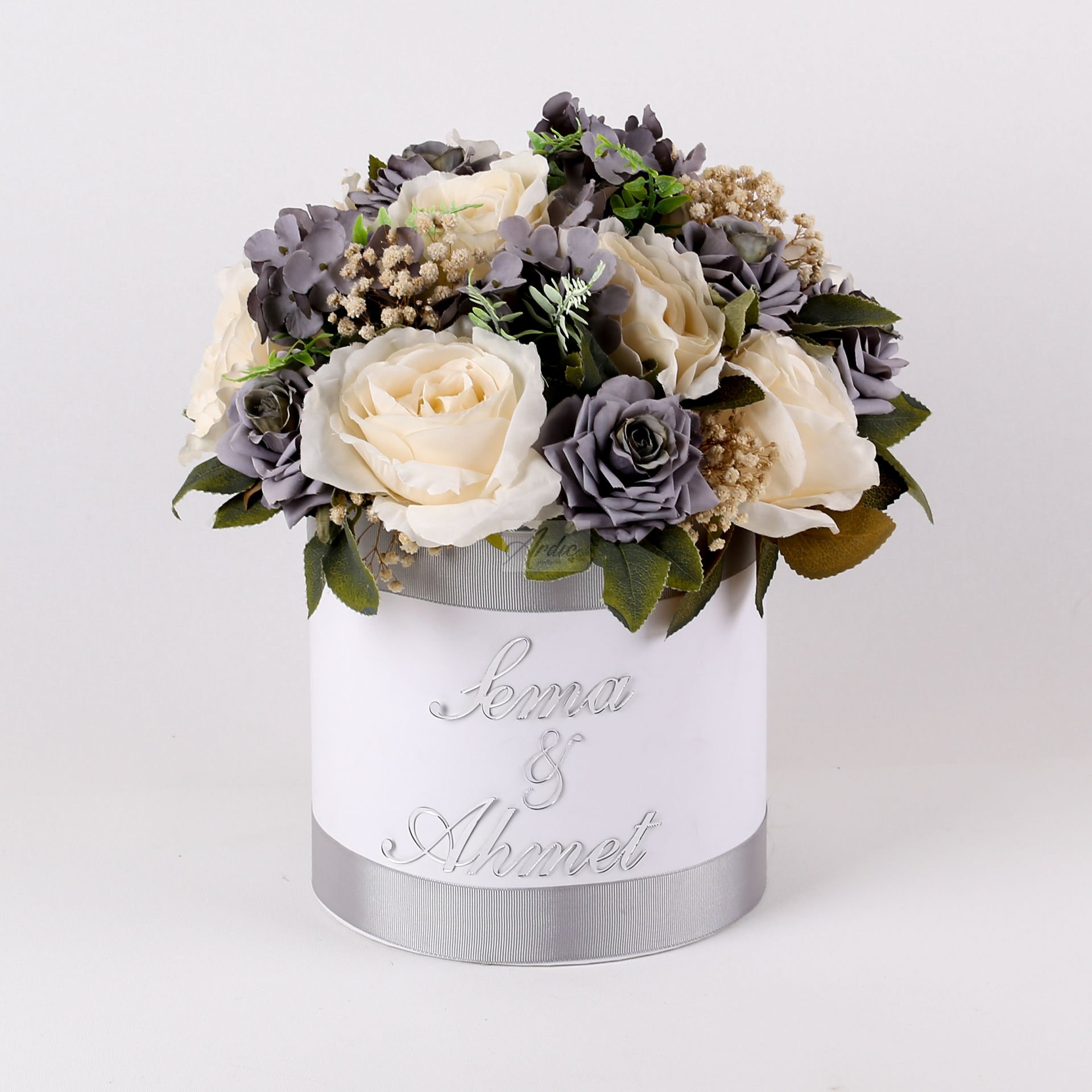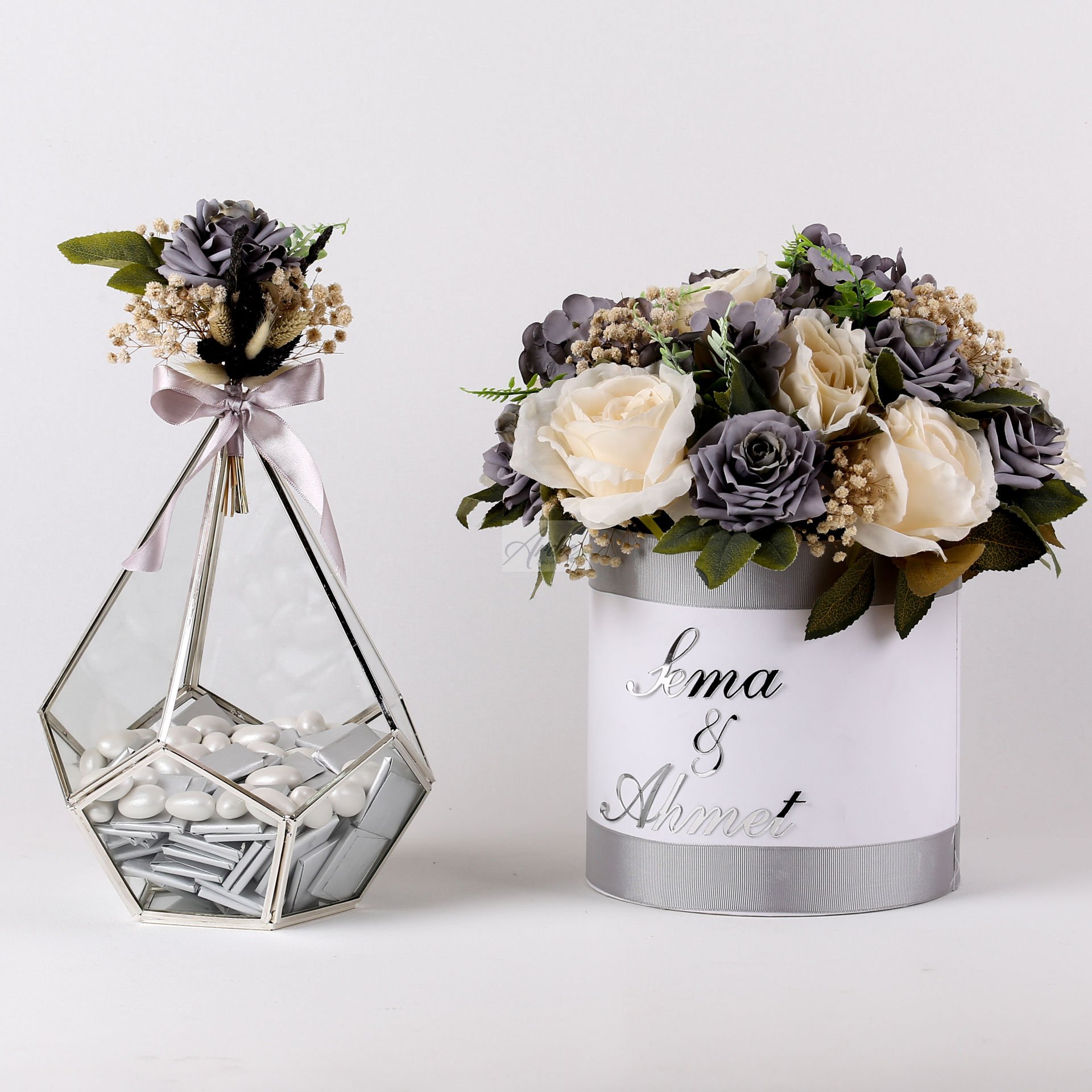 Modern ve zarif renk uyumuyla hazırlanan çiçek – çikolata seti, isteme, söz ve nişan organizasyonlarınızda şık bir sunum oluşturur. Silindir kutuda mavi beyaz çiçek buketi, ferah ve estetik görünümüyle dikkat çekerken, cam prizma kutu içerisinde sunulan isteme çikolatası ve drajeler ile set tamamlanır. İsteme çiçeği, isteme çikolatası, söz nişan seti ve nişan organizasyon ürünleri arasında hem dekoratif hem ikramlık olarak tercih edilebilecek özel bir seçenektir. Özel günlerinizde zarif ve unutulmaz bir sunum sağlar.