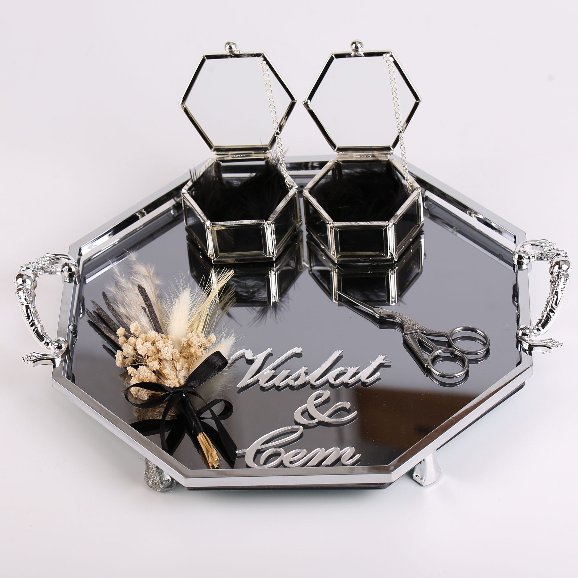 Şık ve modern tasarıma sahip siyah cam sekizgen söz tepsisi seti; söz ve nişan merasimlerinde yüzük kesme anını zarif bir sunumla tamamlamak için hazırlanmıştır. Uyumlu aksesuarları sayesinde konsept bütünlüğü sağlar, özel gün fotoğraflarında estetik bir görünüm oluşturur. Parçalar sonrasında hatıra olarak saklanabilir veya dekoratif amaçla kullanılabilir. (Set içeriğinde değişiklik yapmak için iletişime geçebilirsiniz.)