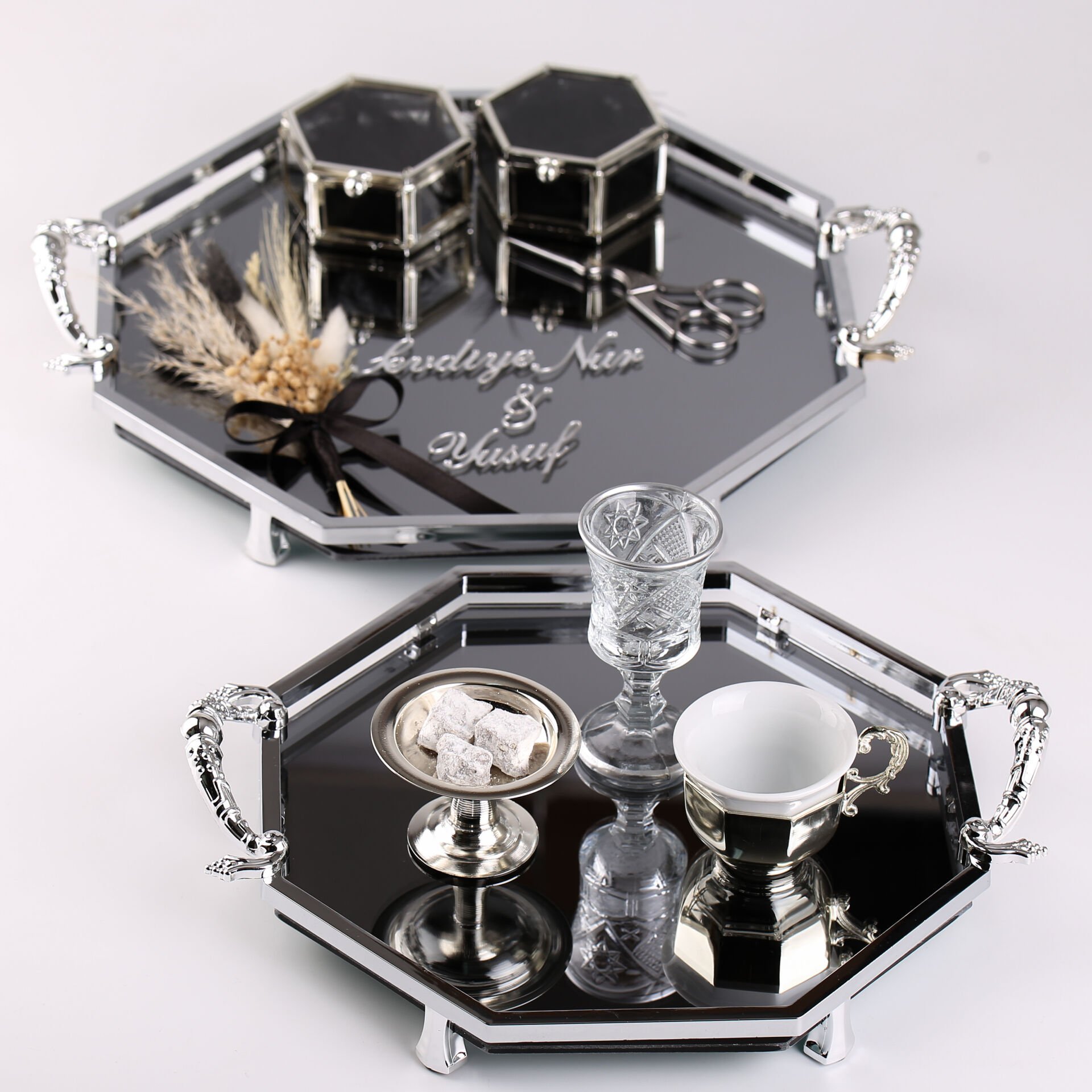 Siyah cam sekizgen formda hazırlanan 2’li tepsi seti; söz, isteme ve damat kahvesi sunumlarında modern ve şık bir görünüm sunar. Zarif detayları ve uyumlu aksesuarlarıyla özel gün konseptini tamamlayan estetik bir settir. Hem sunum hem de hatıra olarak uzun süre saklanabilecek şık bir alternatiftir.