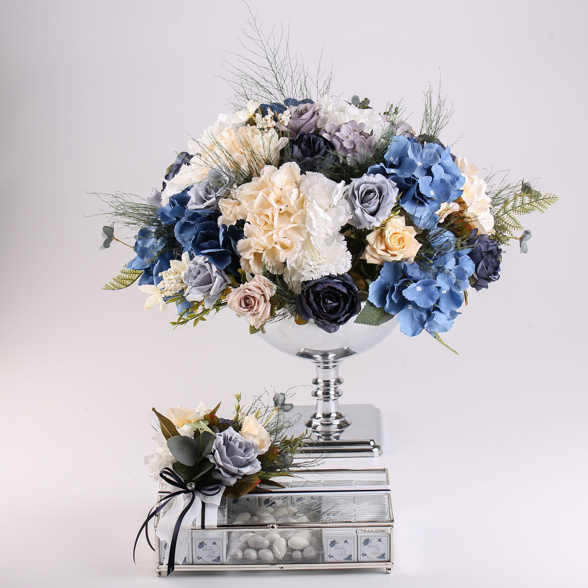 Gümüş ve mavi tonlarında hazırlanan vazolu çiçek ve çikolata seti; söz, nişan ve isteme törenlerinde şık ve uyumlu bir hediye ve ikram alternatifi olarak tercih edilebilir. Zarif çiçek aranjmanı ve etiketli çikolatalarıyla organizasyon konseptine estetik bir dokunuş katar, özel gün hatırası olarak da saklanabilir.
