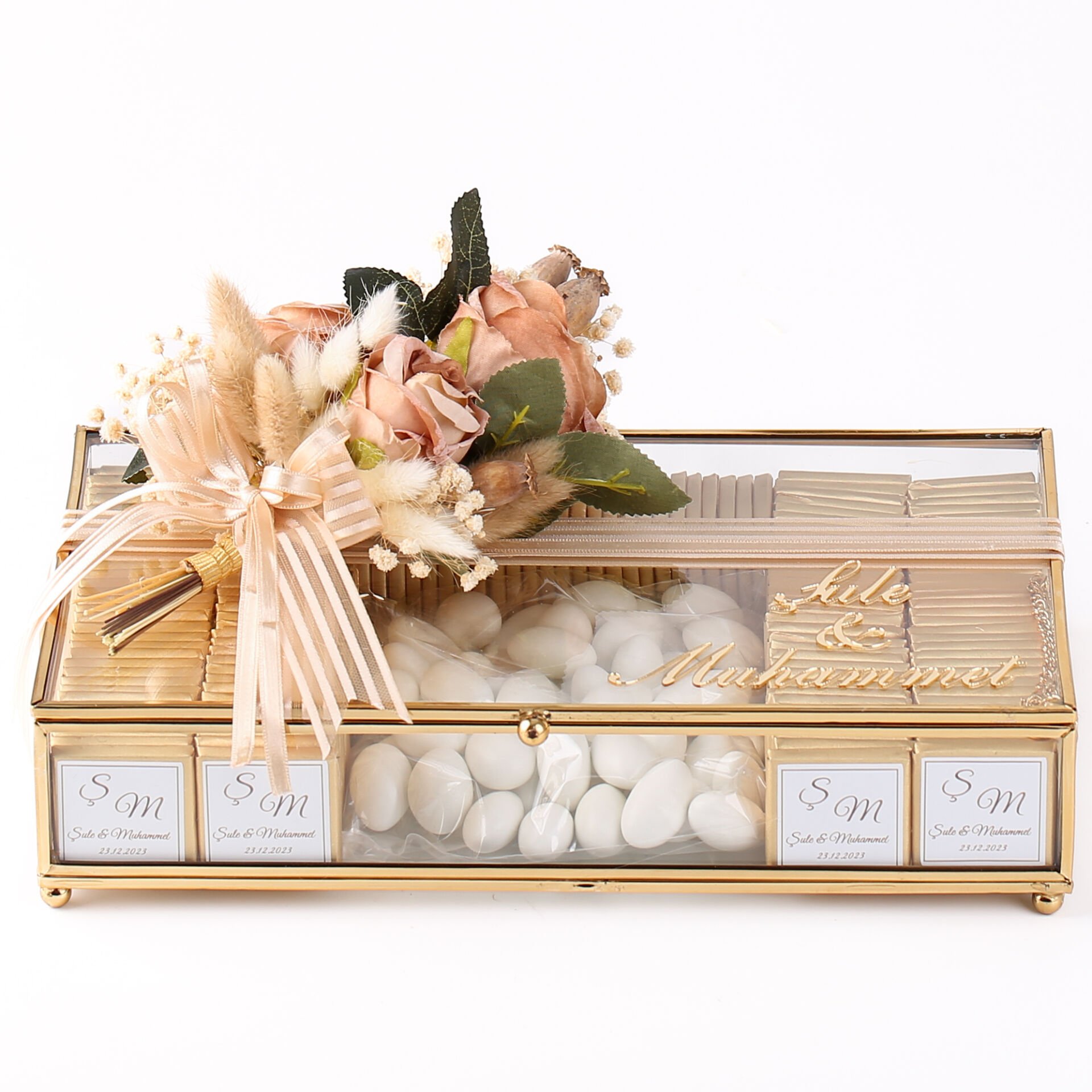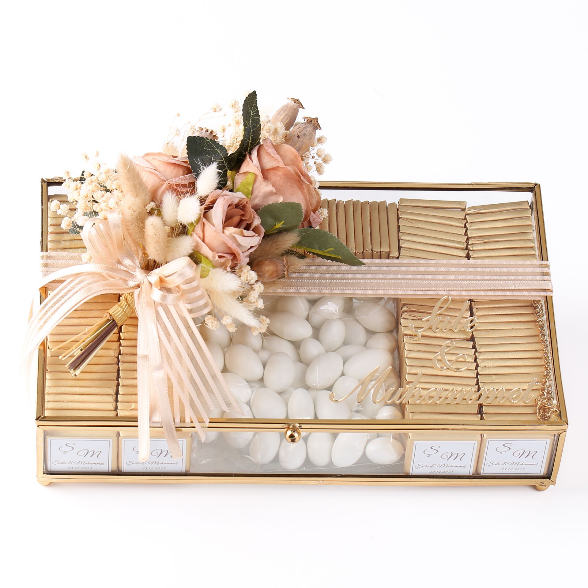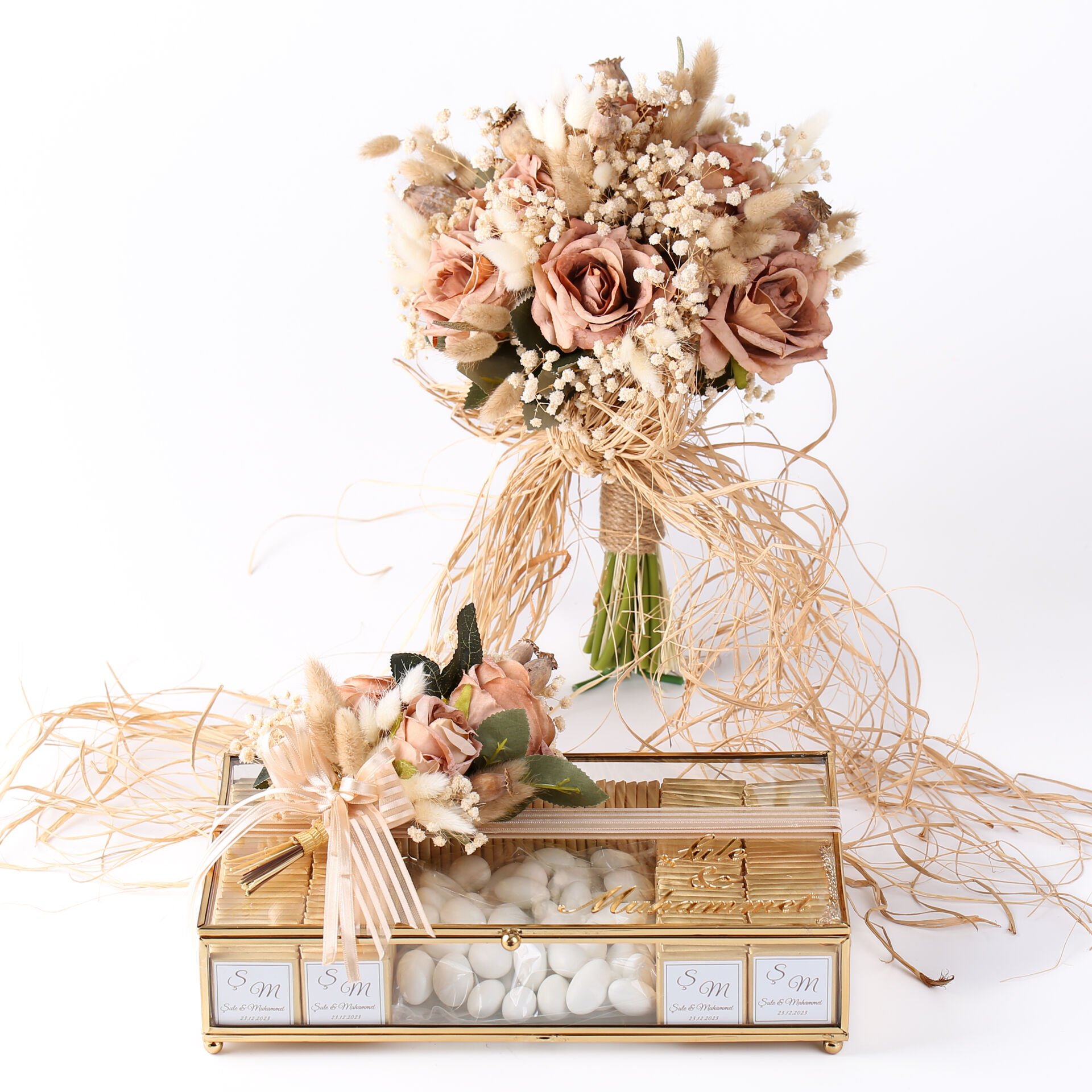 Şık tasarımıyla hazırlanan çiçek ve çikolata seti; söz, isteme, nişan ve özel gün organizasyonlarında hem görsel olarak zarif bir tamamlayıcı hem de misafirlere sunulabilecek özel bir ikram alternatifi sunar. Uyumlu konsepti sayesinde organizasyonunuza bütünlük kazandırır ve unutulmaz bir hatıra oluşturur.