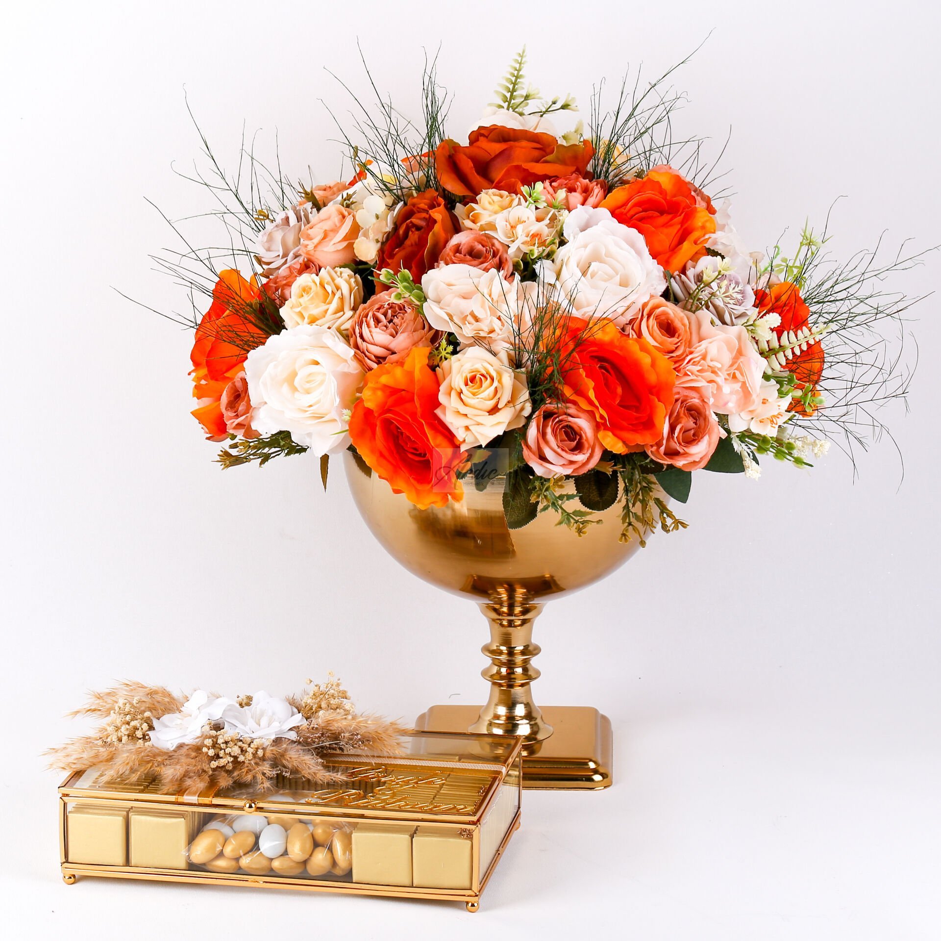 Zarif ve gösterişli tasarımıyla hazırlanan çiçek – çikolata seti, isteme, söz ve nişan organizasyonlarında şık bir sunum oluşturur. Ayaklı gold vazoda gül aranjmanı, dekoratif görünümüyle ortamınıza estetik katarken, cam kutu içerisinde sunulan isteme çikolatası ve draje ile ikramlık ihtiyacınızı da tamamlar. İsteme çiçeği, isteme çikolatası, söz nişan seti ve nişan organizasyon ürünleri arasında hem şık hem kullanışlı bir alternatif arayanlar için ideal bir tercihtir. Özel günlerinizde unutulmaz bir sunum sağlar.
