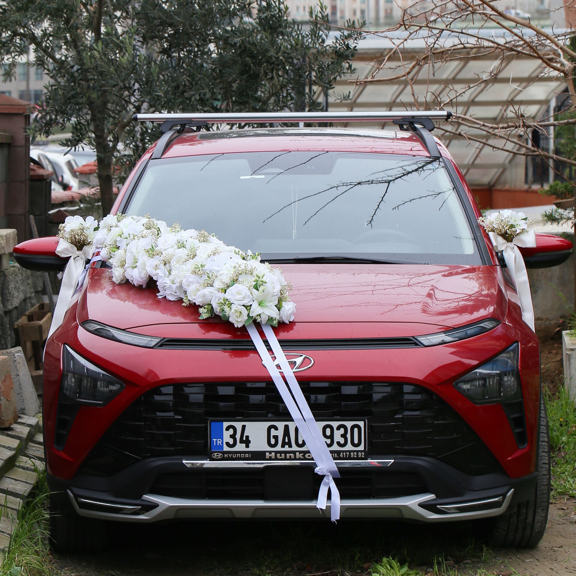 Büyük beyaz lilyum ve gül aranjmanından oluşan gelin arabası süsleme seti; zarif ve gösterişli tasarımıyla düğün ve nikah organizasyonlarınızda aracınıza şıklık katar. Uyumlu kapı süsleri ve arka cam baş harf detaylarıyla bütünlüklü bir görünüm sunar.