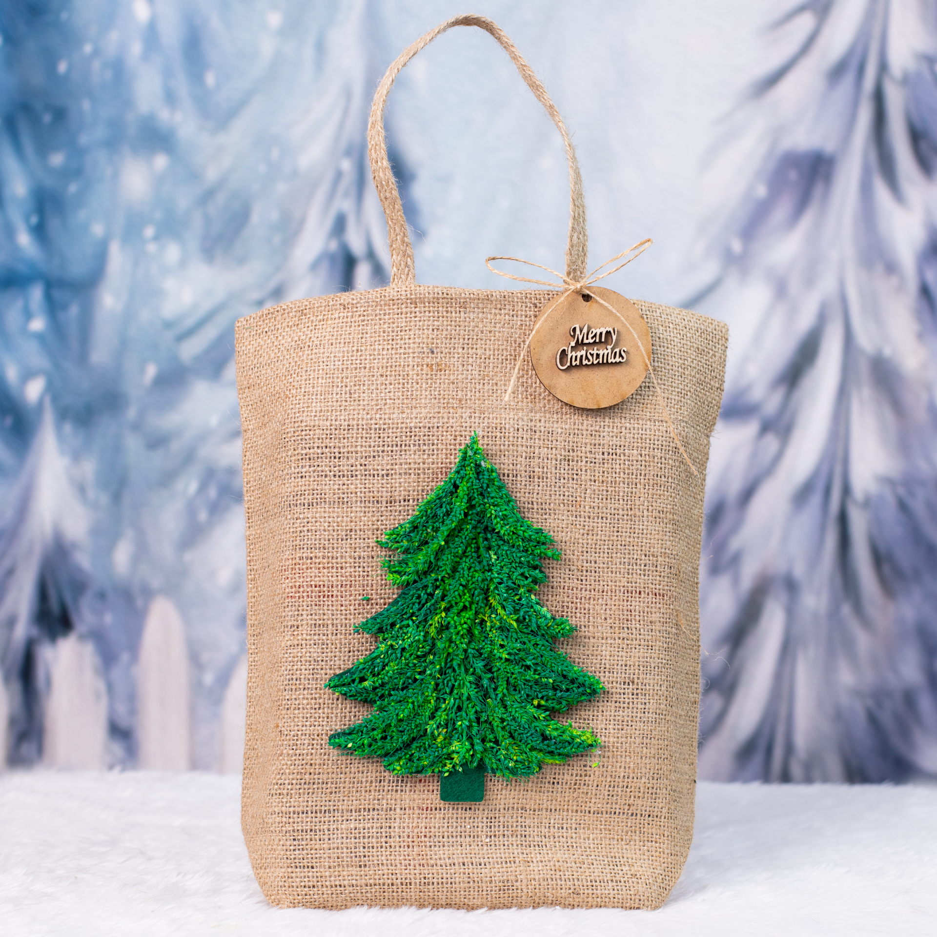 Çam ağacı süslemeli %100 el yapımı jüt çanta, yılbaşı temasına uygun görünümü ile hem dekoratif hem kullanışlıdır. Kurumsal yılbaşı promosyon çantası ve yeni yıl hediye sunum çantası arayanlar için uygundur.