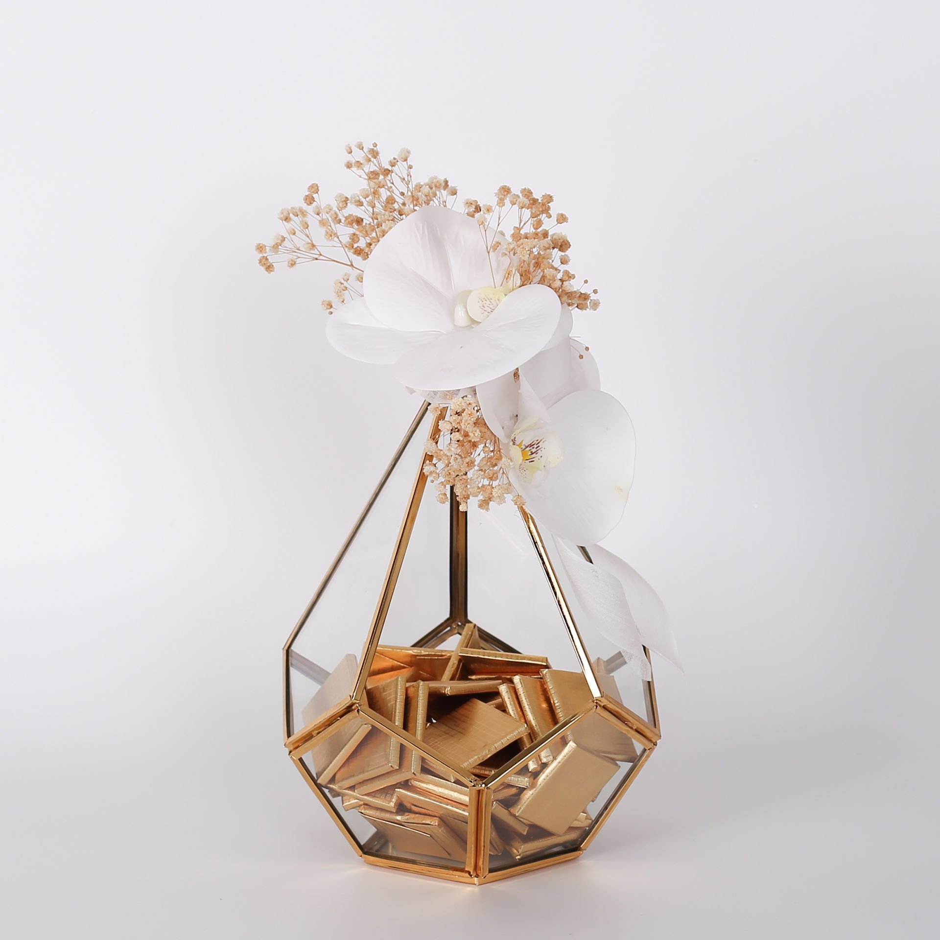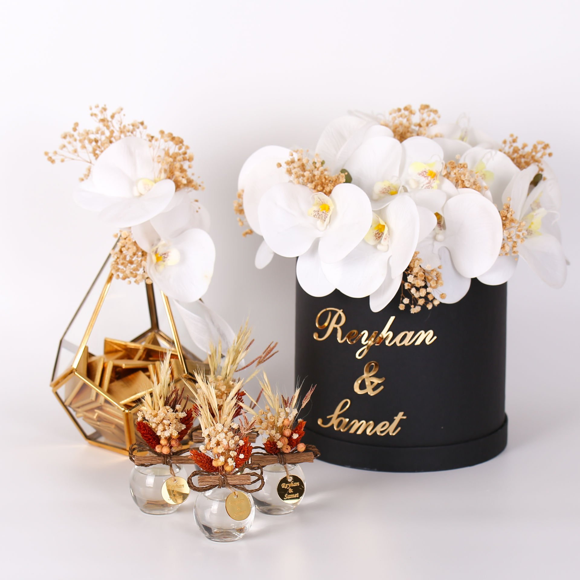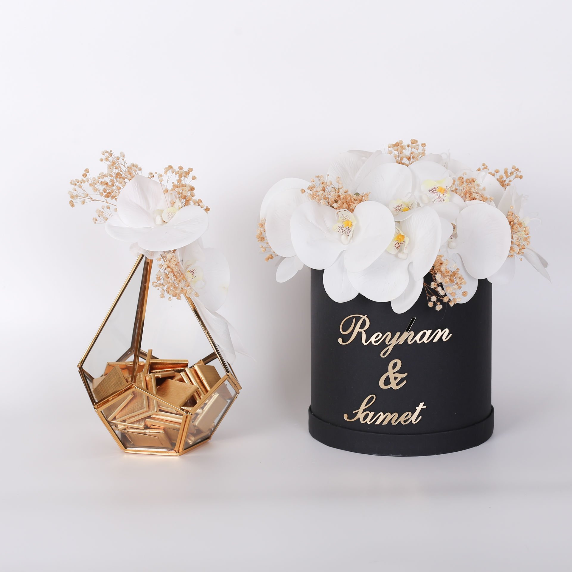 Prizma cam kutu içerisinde hazırlanan çikolata ve çiçek seti; söz, nişan ve isteme organizasyonlarında şık ve zarif bir sunum oluşturmak isteyenler için özel olarak tasarlanmıştır. Orkide ve cipso çiçek detaylarıyla konseptinize uyum sağlar, hem ikramlık hem de dekoratif hatıra olarak değerlendirilebilecek estetik bir seçenektir.