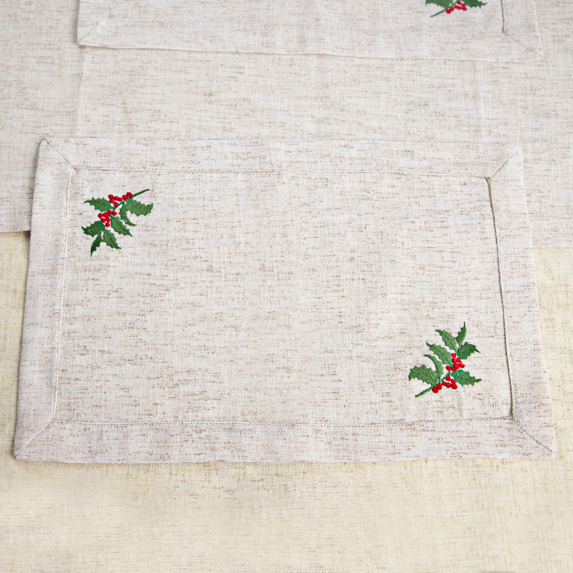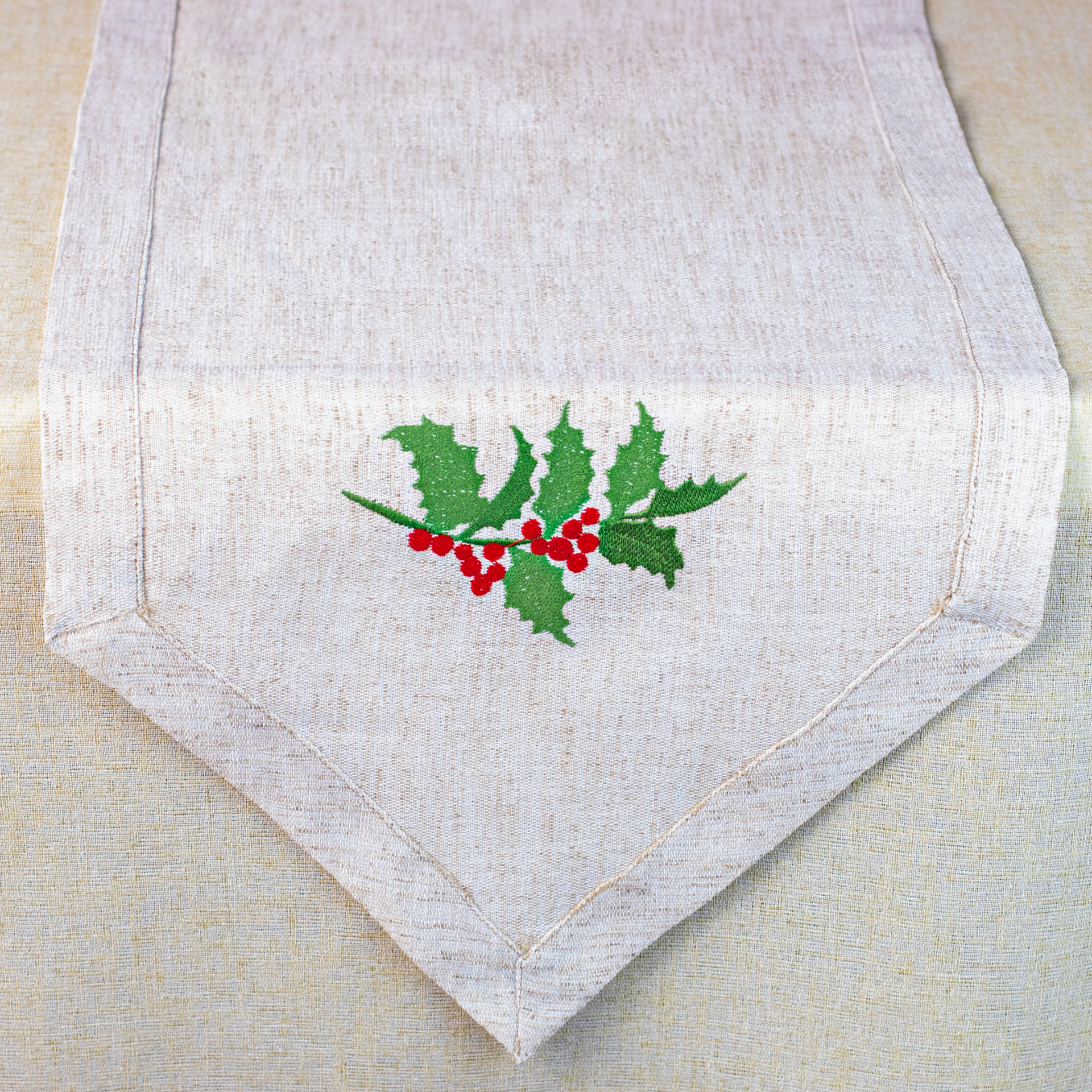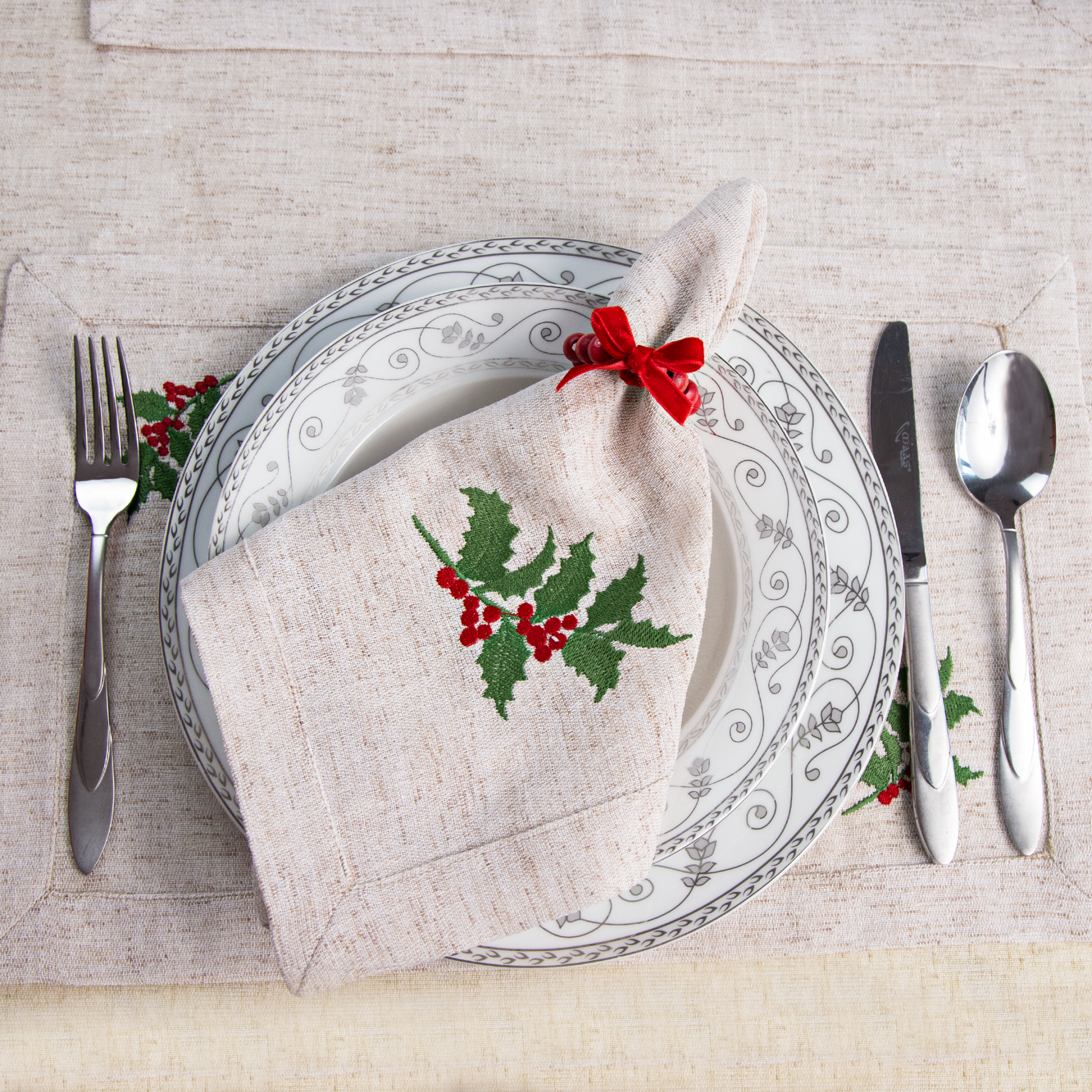 Yılbaşı sofra seti TT002, ökse otu motifli nakış detayları ile yeni yıl sofralarınıza zarif ve klasik bir görünüm kazandırır. 4 kişilik tasarımı sayesinde yılbaşı akşam yemeği, davet sofraları ve özel kutlamalar için uyumlu bir masa düzeni oluşturur. Nakışlı detayları ile dekoratif ve şık bir yılbaşı masa konsepti hazırlamak isteyenler için ideal bir seçenektir.