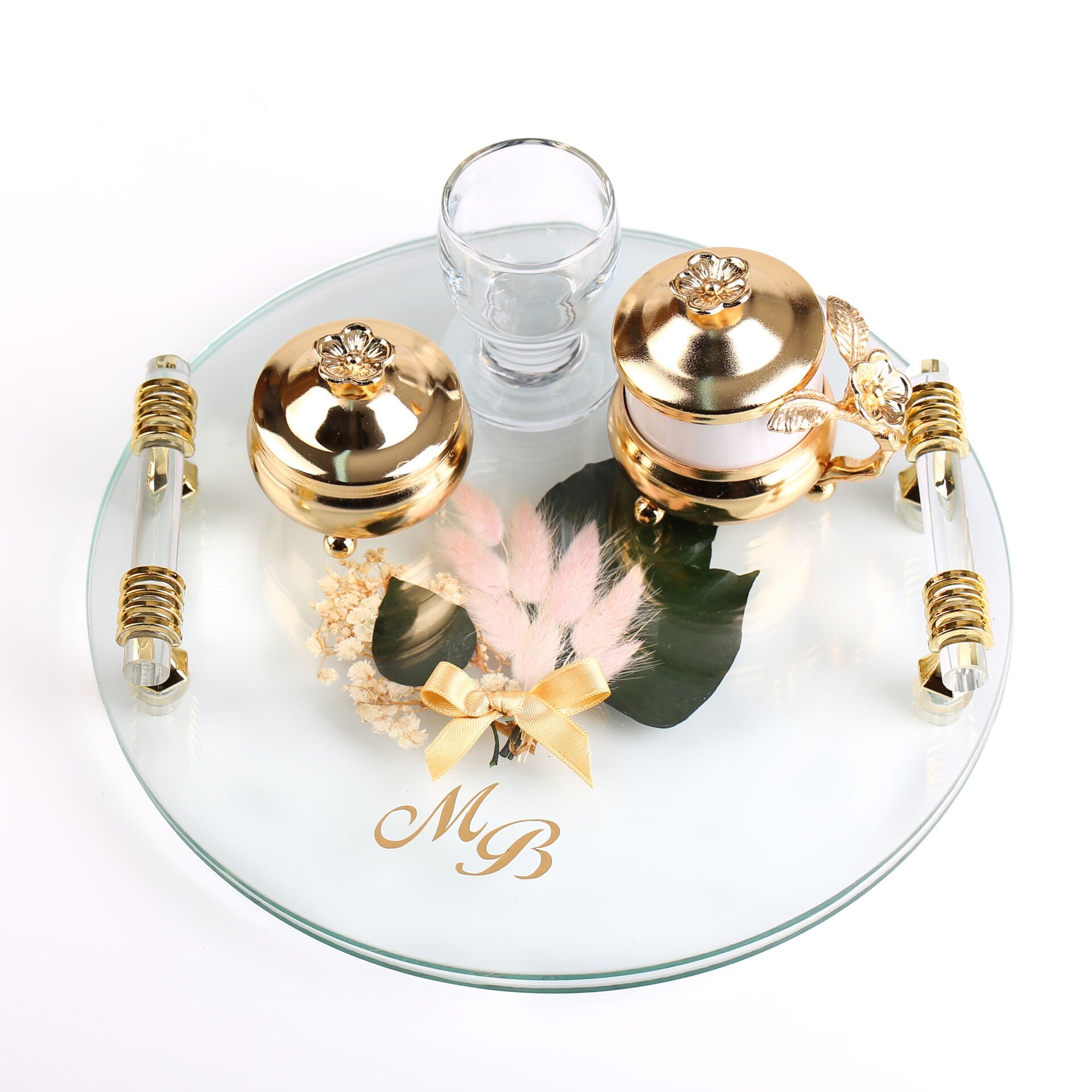 Daire formda tasarlanan 2’li cam damat kahvesi ve söz tepsi seti; kız isteme, söz ve nişan merasimlerinde ihtiyaç duyulan sunumları uyumlu ve şık bir şekilde tamamlamak için hazırlanmıştır. Gold veya gümüş renk seçenekleriyle konseptinize uyum sağlar, yaldızlı folyo isim ve baş harf detaylarıyla kişiselleştirilebilir. Özel gün sonrasında hatıra olarak saklanabilir veya servis amaçlı kullanılabilir.
