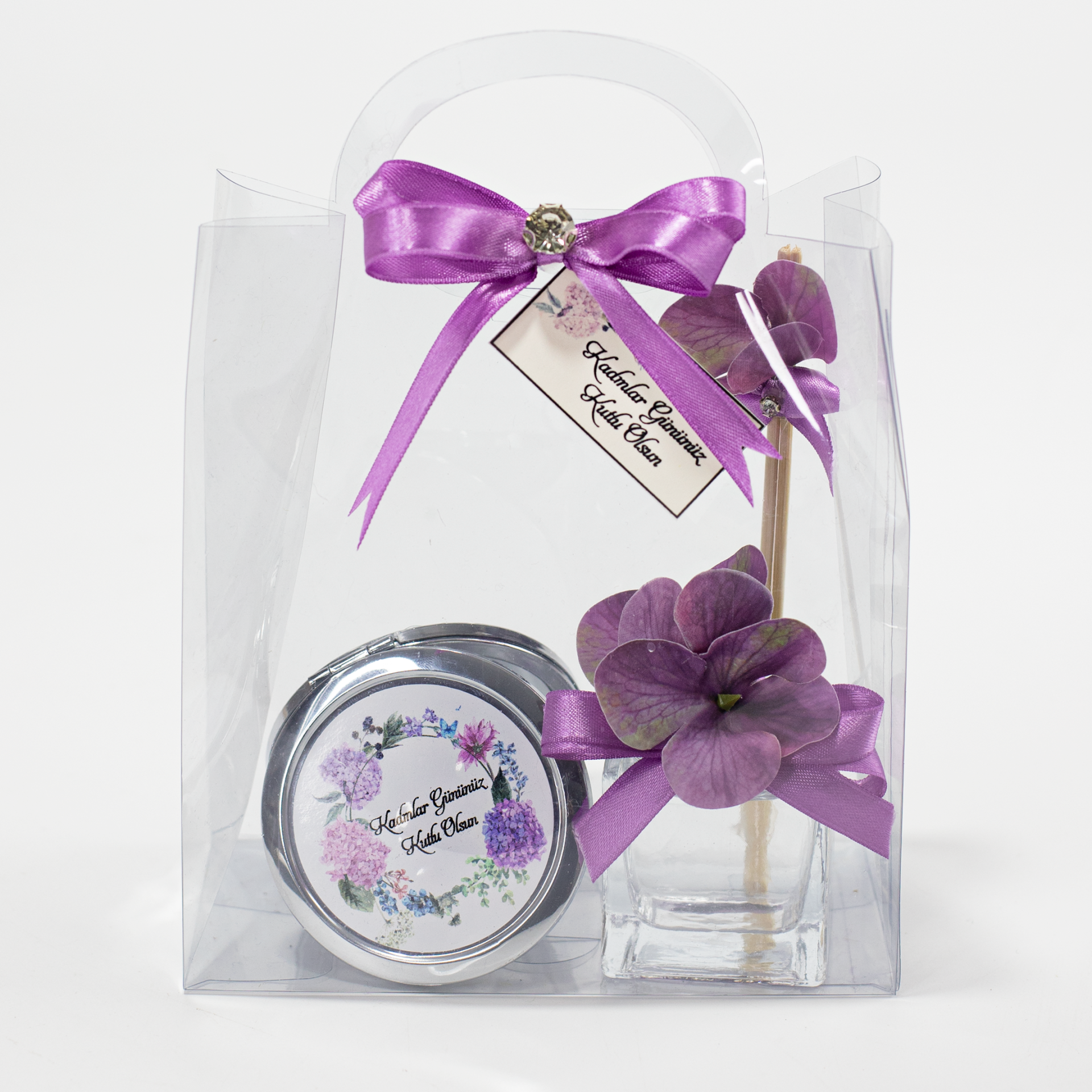 Sevdiklerinize özel hissettirecek anlamlı bir Kadınlar Günü hediyesi arıyorsanız, bu şık hediye seti ideal bir tercihtir. Süslemeli asetat taşıma çantası içinde sunulan set; cam şişeli oda kokusu ve difüzör çubukları ile Kadınlar Gününe özel metal aynayı bir araya getirir. Zarif ve estetik tasarımı sayesinde sevdiklerinize kendilerini özel hissettirecek, anlam dolu ve unutulmaz bir hediye deneyimi sunar. Hem dekoratif hem de işlevsel bir hediye alternatifi olarak öne çıkar.